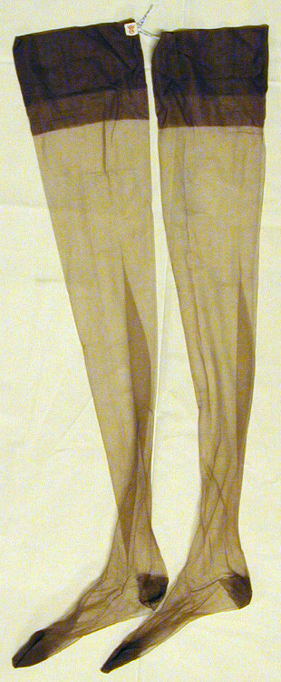 Mörk nylonstrumpa, hellång. Tunn, förstärkt i tå, häl och krage. Nederdelen på kragenmönstrad med en rad hål. Påsydd, fyrkantig märklapp med ett krönt S. På kragen märken efterstrumpeband.
