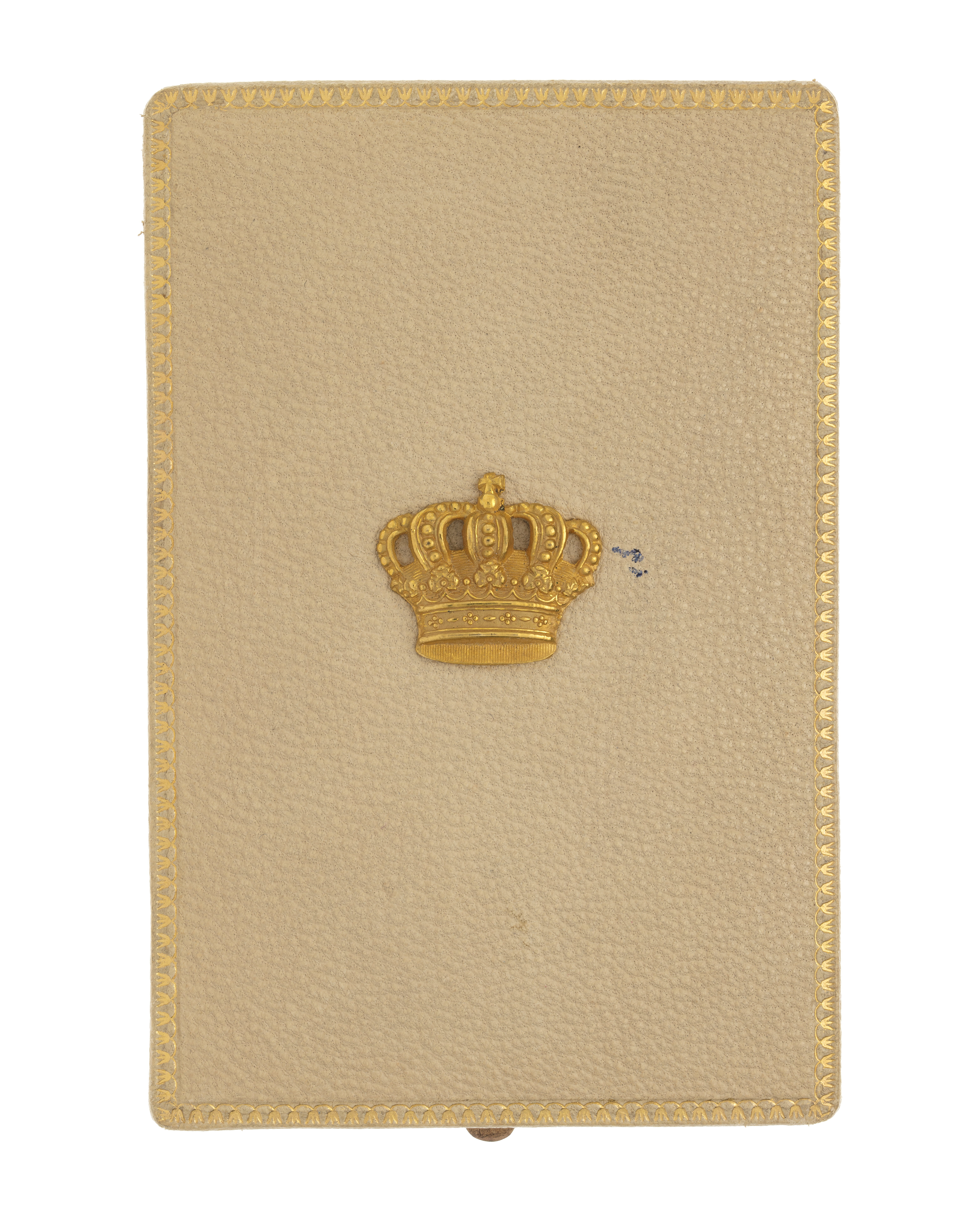 Rektangulärt etui med välvt lock. Utvändigt klätt med cremefärgat skinn, på locket fäst en kunglig krona av guld(?), fjäderlås av gulmetall. På undersidan fastklistrat ett benvitt, mönsterpressat papper. Locket invändigt klätt med vitt siden, firmamärkei guldtryck; kunglig krona, "C.F.CARLMAN // KONGL.HOV&ORDENSJUVELERARE // STOCKHOLM // 15 REGERINGSGATAN 15". Underdelen invändigt klätt med cremefärgat sammet, urtag för tecken och band. Längs kanterna av lock och underdel rankbård i guldtryck.