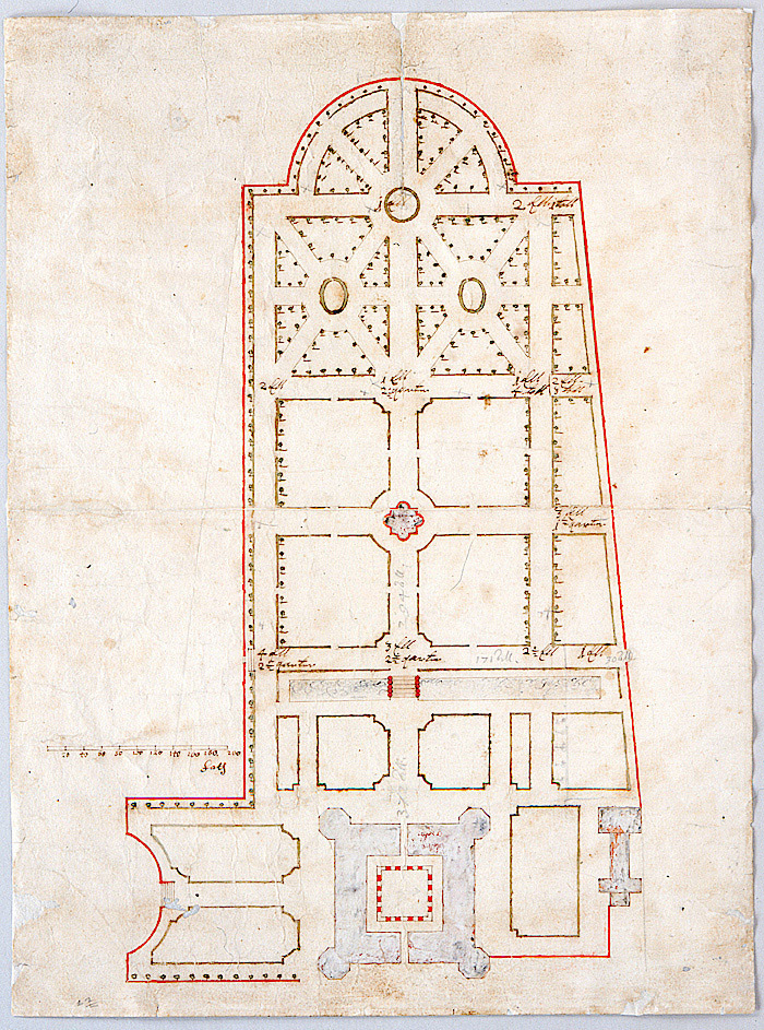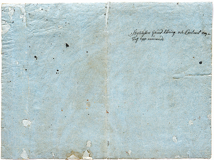 15944:1 Plan över slottet, stenhuset och parken, Skoklosters slott. Skala, enhet foth, övriga måttangivelser i qarter, All, Ell och toll. Tecknad med brunsvart bläck. Tunt färglagd med röd och grön vattenfärg. Byggnaderna senare påmålade med täckande färg. Rättelser och tillägg gjorda med blyerts. Ritade stödlinjer. 15944:2 Blått kraftpapper på vilket ritningen varit uppklistrad med grovt mjölklister. På detta har skrivits med bläck: ”Skoklåsters Grund Ritning, och Contract om Däss upp-murande”.