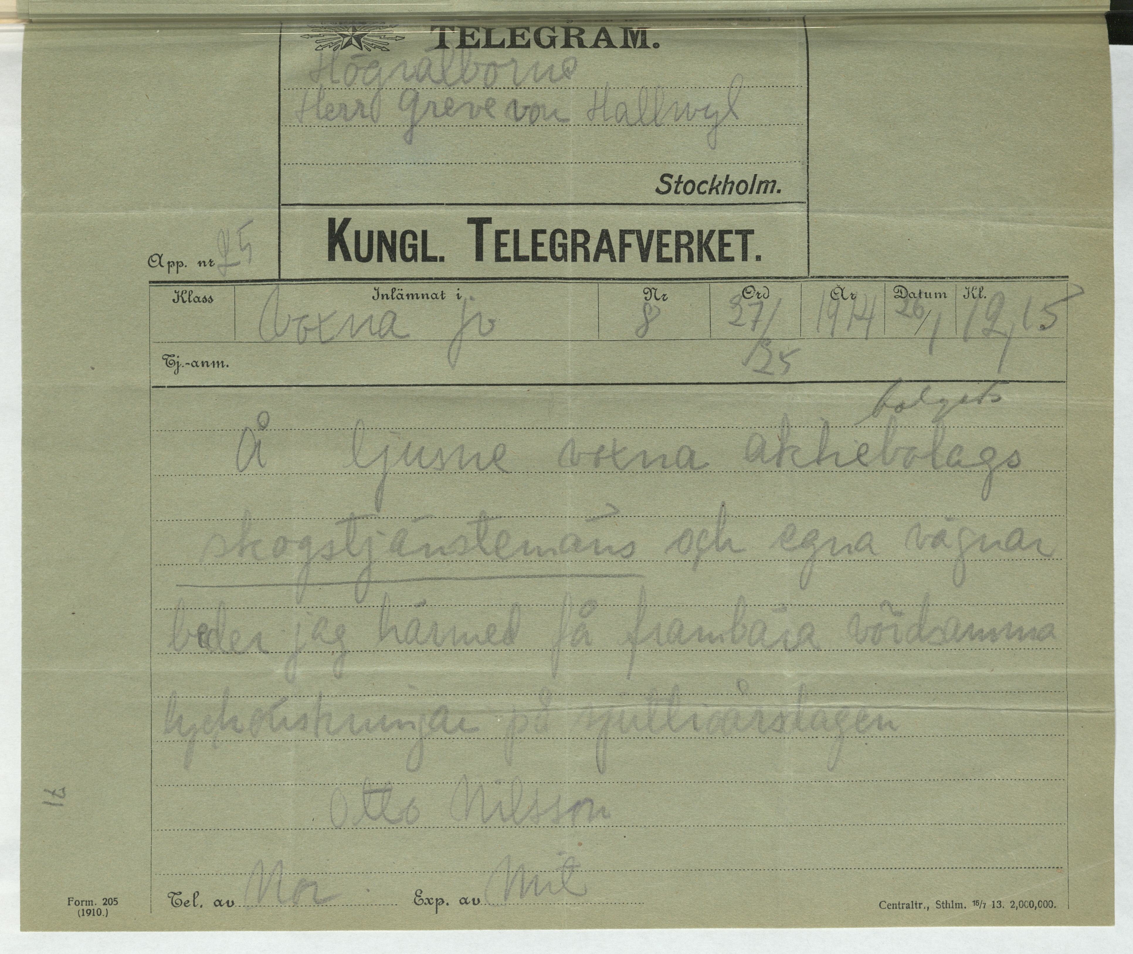 Telegram från Ljusne-Woxna skogstjänstemän genom Otto Nilsson