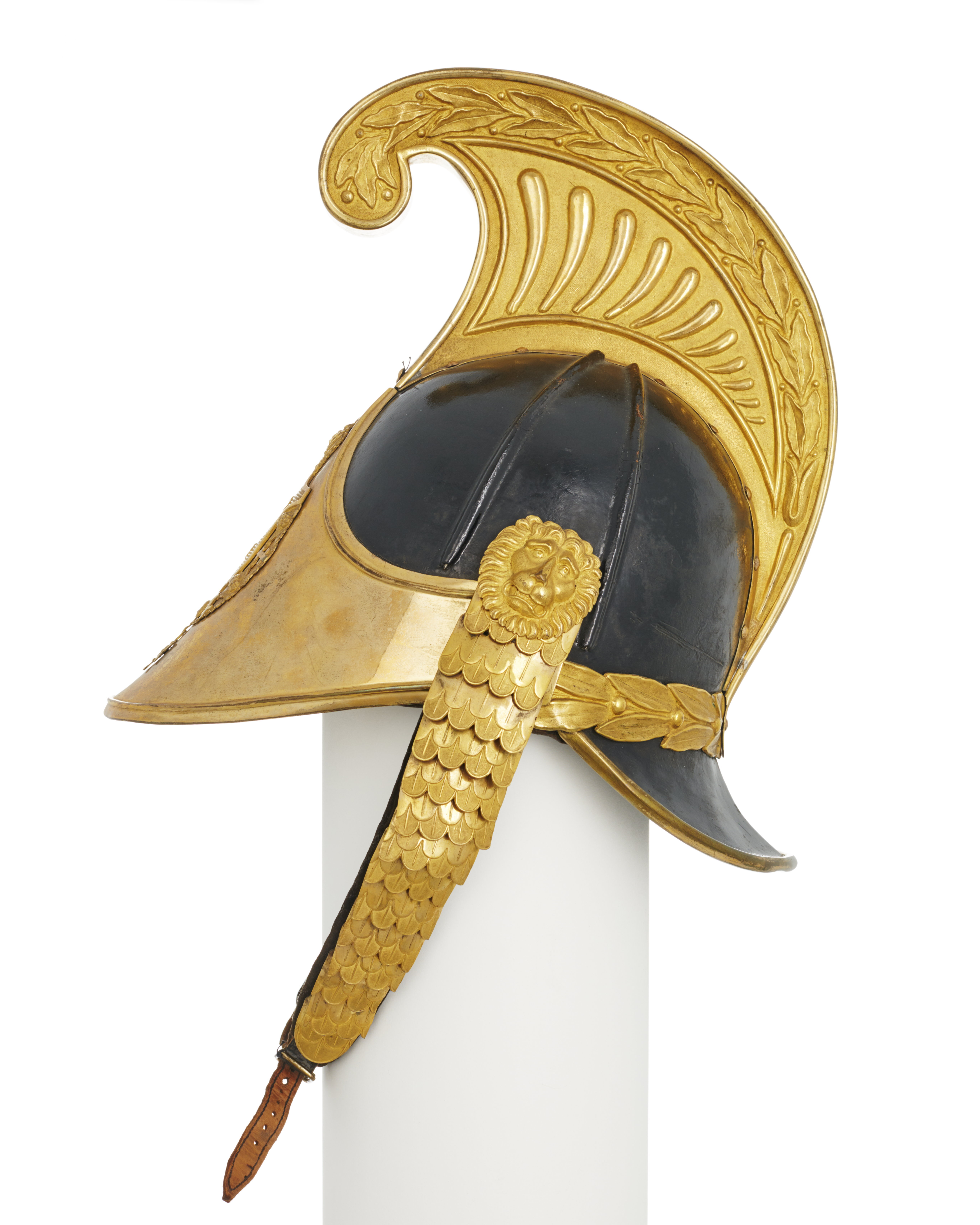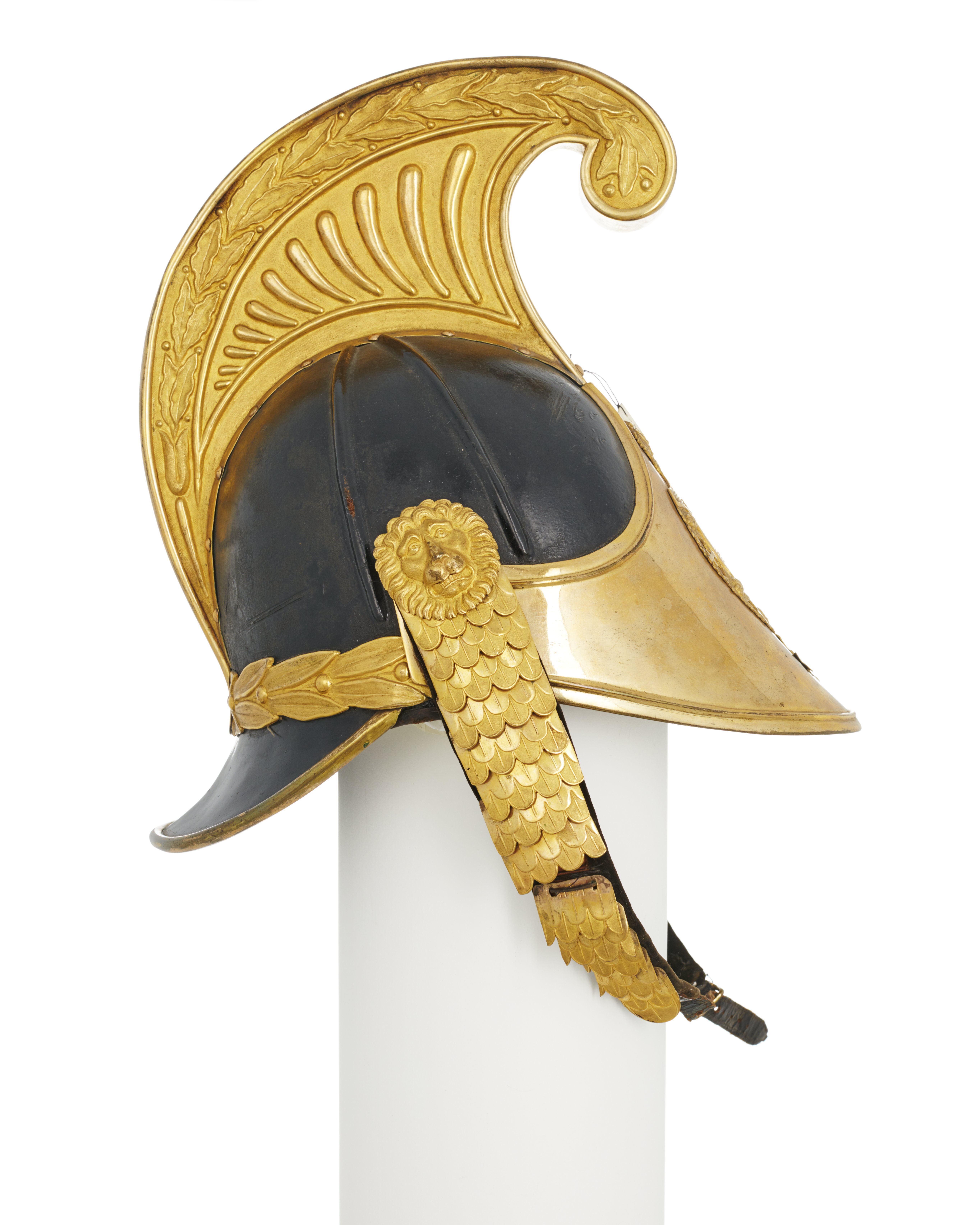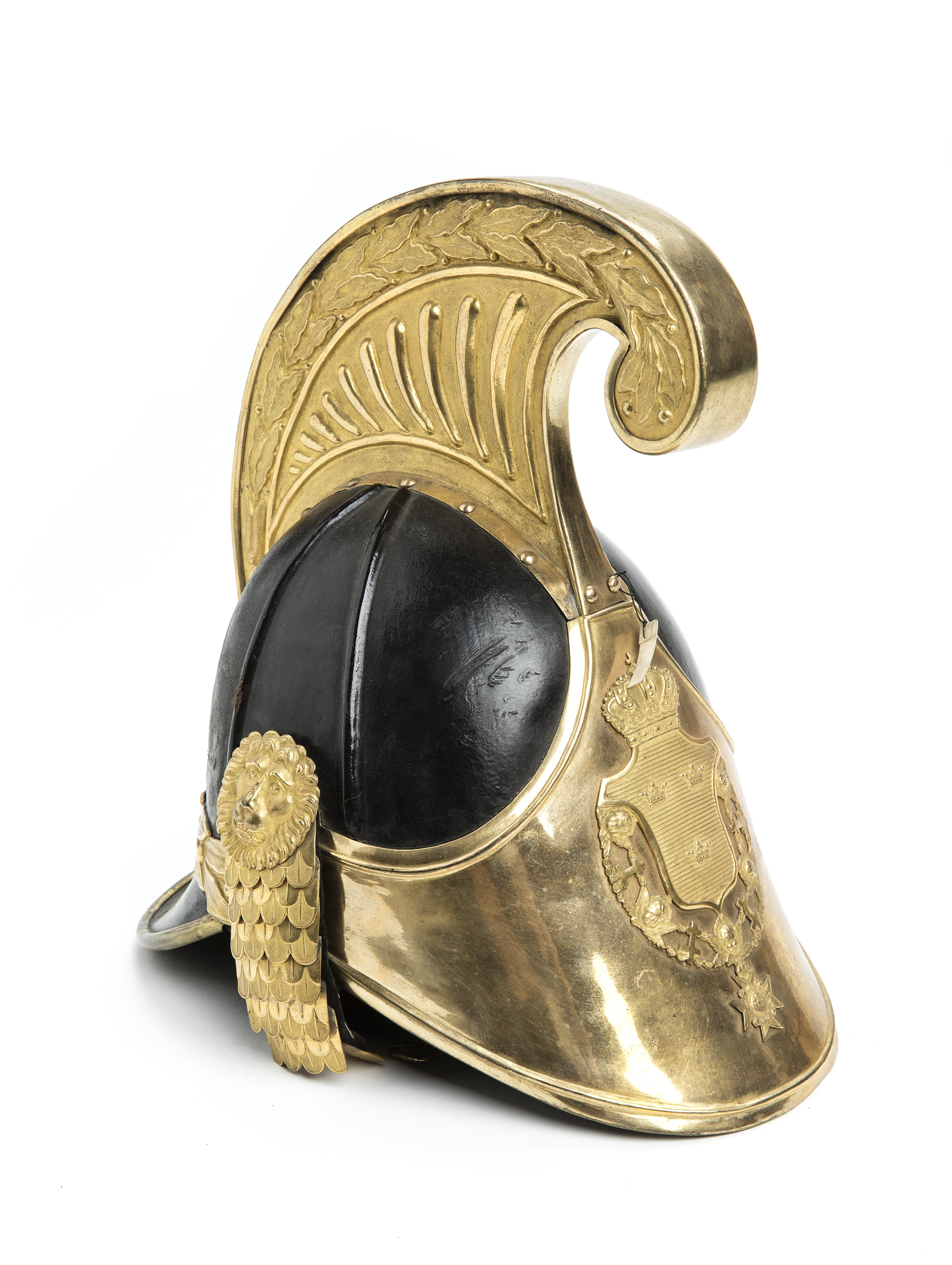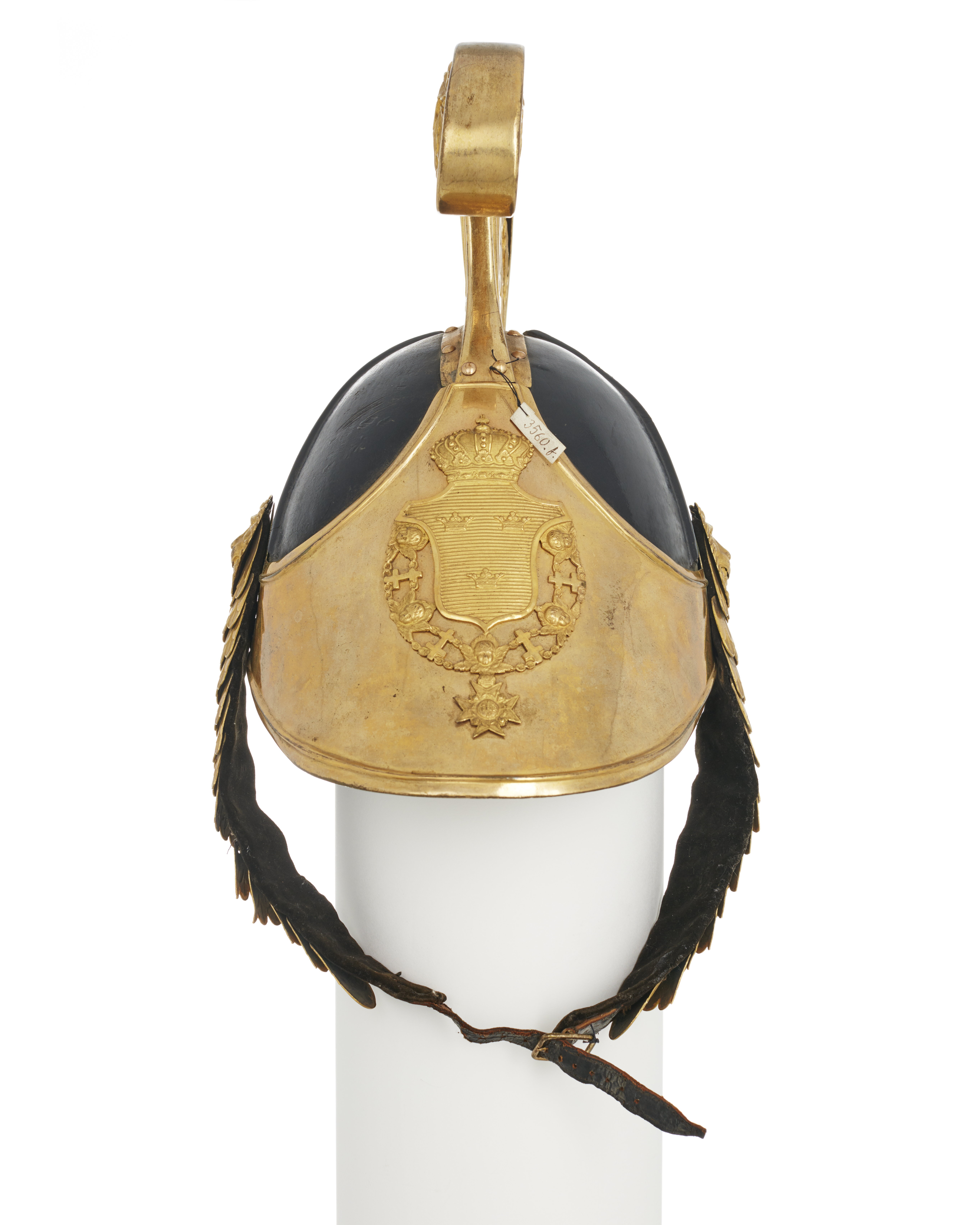 Kask för Livregementets dragonkår. Kask av svart blankt läder med beslag av förgylld mässing. På framplåten finns fäst Riksvapnet med en krönt sköld med tre kronor inom serafimerordens kedja med ordenskors. Kasken har en kam i form av en volut och är dekorerad längs ytterkanten med en bård med parställda lagerlöv samt bär. Hakrem med fjällformade beslag, bredast upptill (ca 4 cm) och avsmalnande nedåt (ca. 2,4 cm). Remmen har foder av svart sammet och läderband i vardera ände för att stänga under hakan. I det ena bandet finns ett spänne och i det andra hål. Ett runt beslag dekorerat med ett lejonhuvud (ca. 4,4 cm i diameter), finns där hakremmen är fastsatt. Svettband av mörkbrunt skinn, fram finns ytterligare en del av ljust skinn sytt över det mörkbruna. Foder av brunt sidentyg. Fodret är öppet på hjässan, avslutas med en dragsko med ett band iträtt, med bandet regleras vidden/storleken. En papperslapp med text hör till kasken: "Klädkammaren. / ??. No ??. 47 / Lifregementets dragons / uniform Prins Gustafs / Kask".