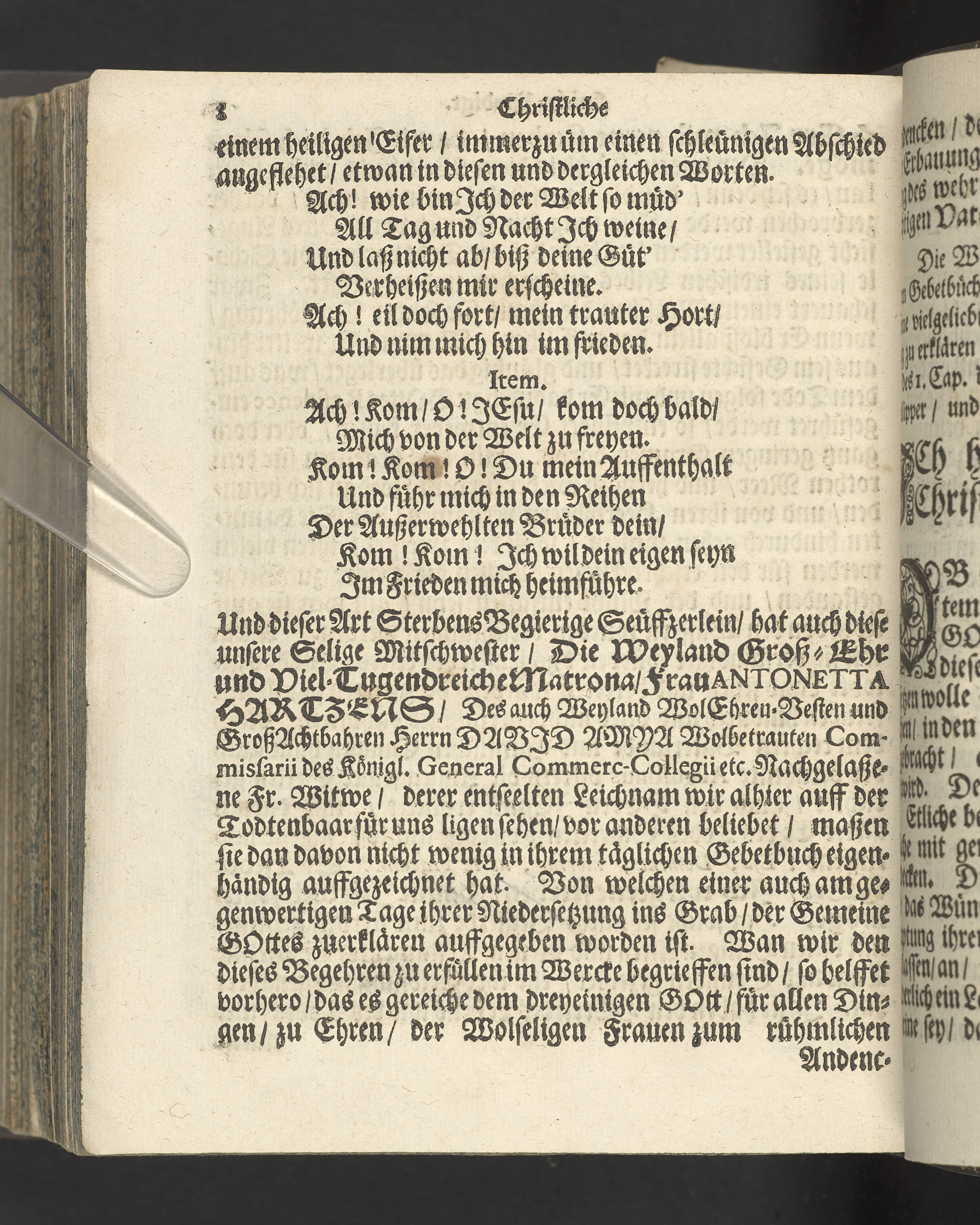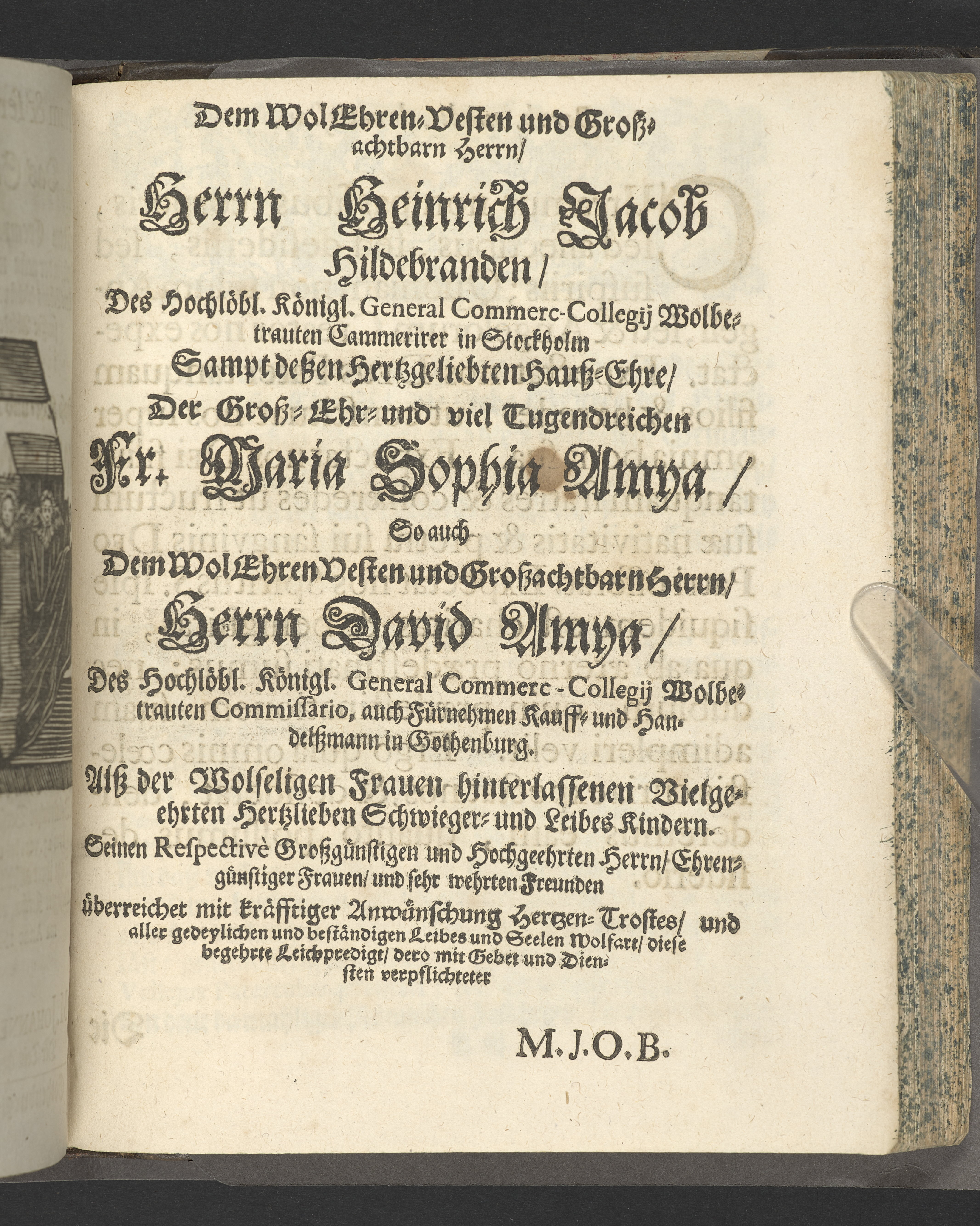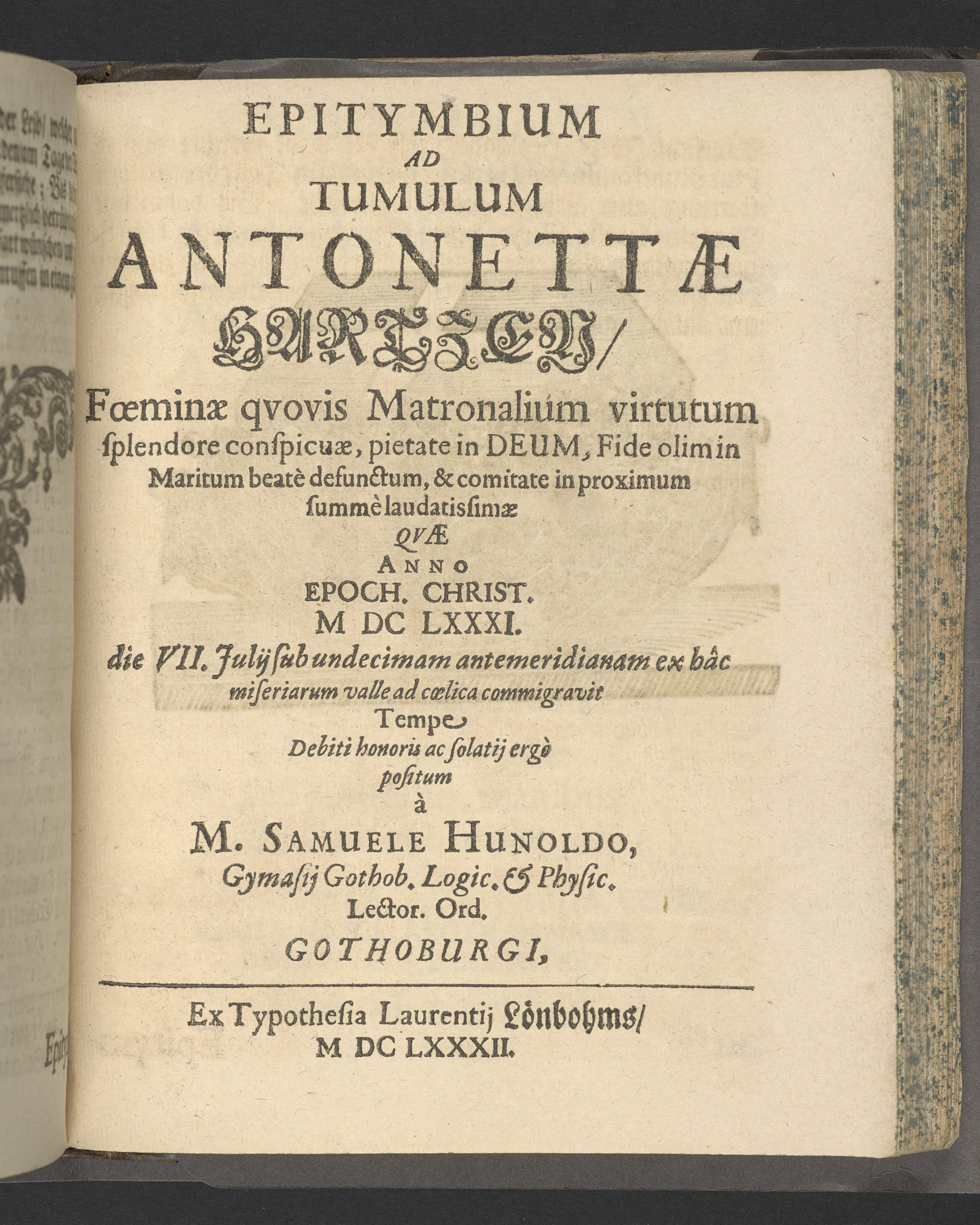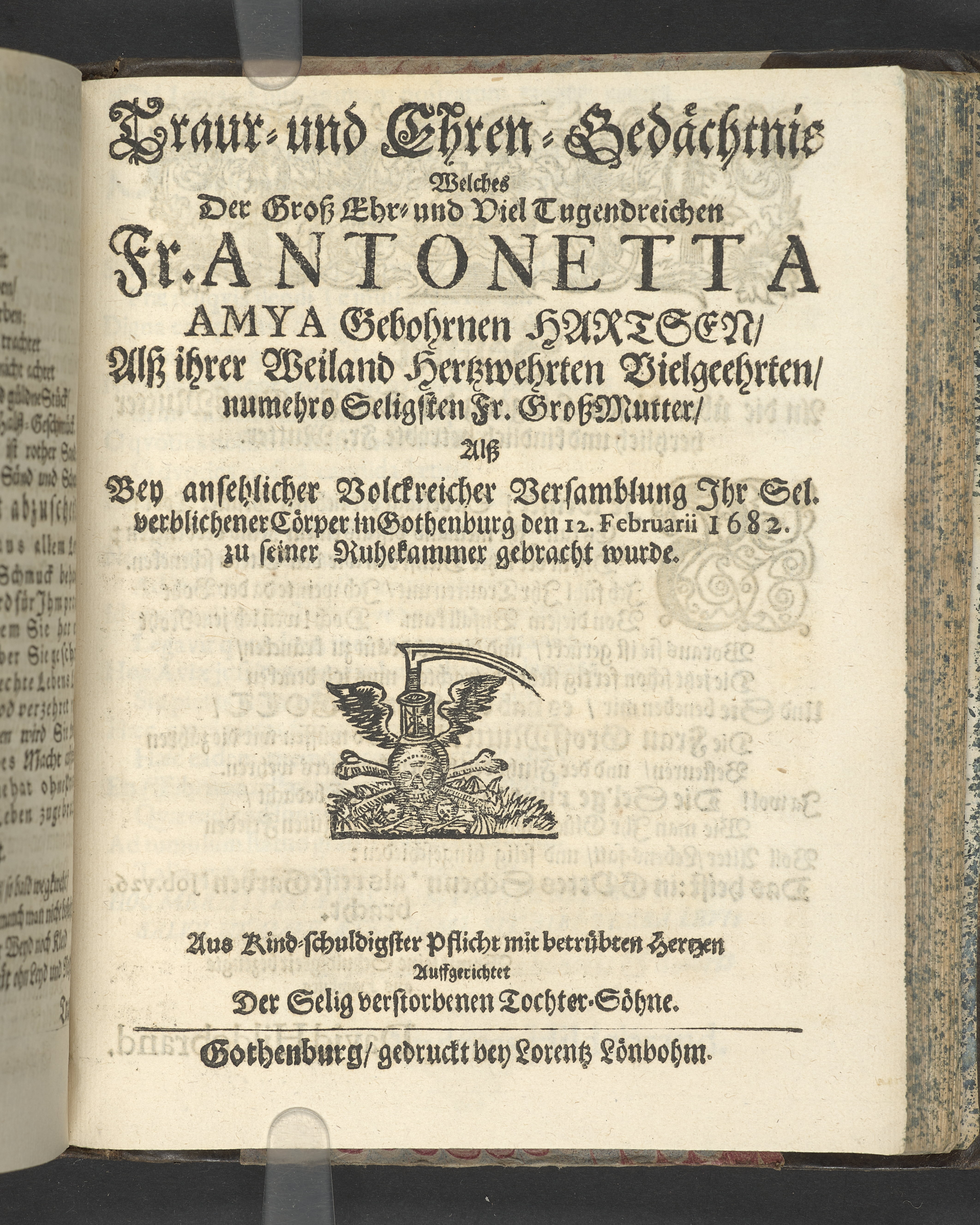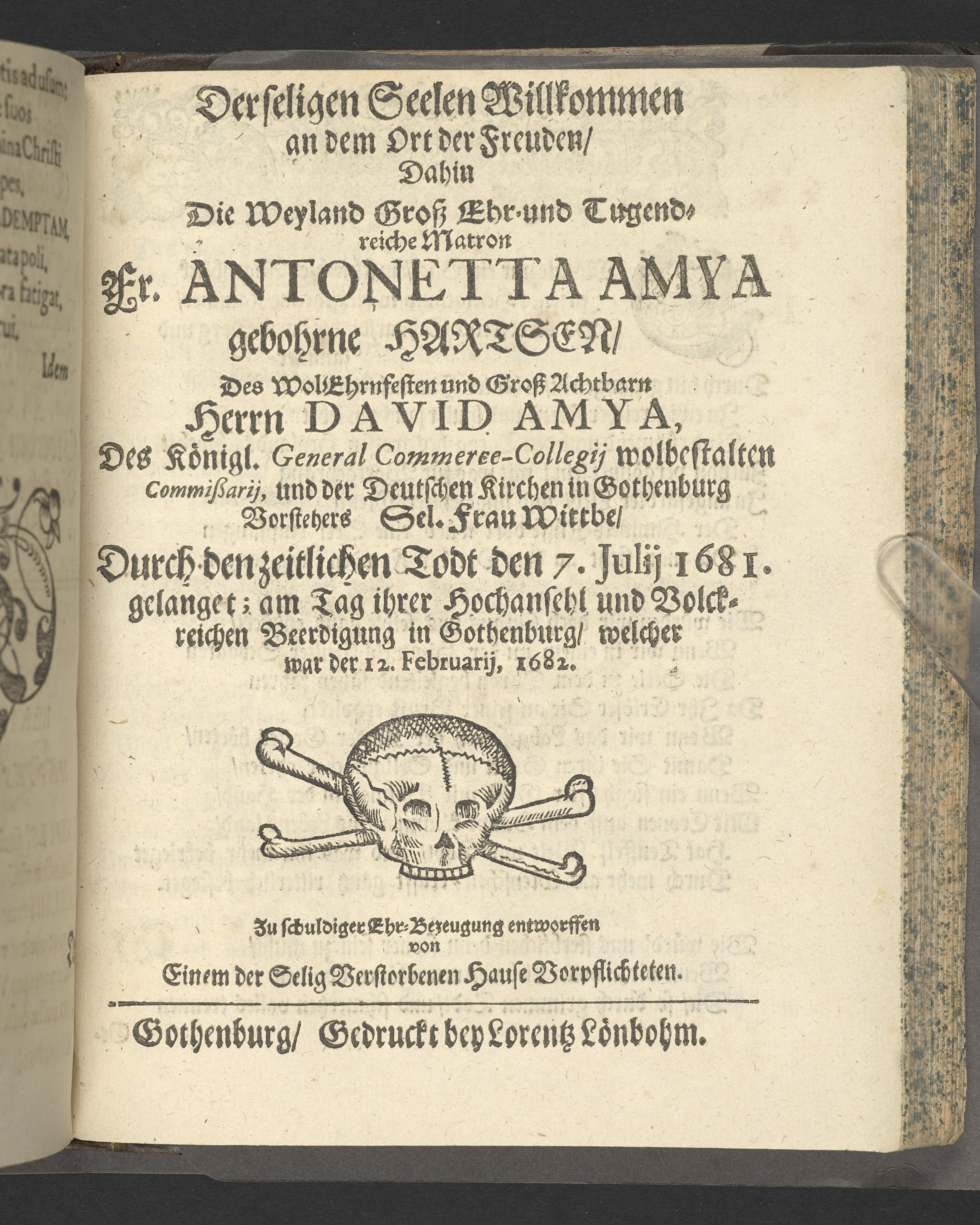 Pium & serium mortis desiderium oder Das sehnlich Heim-Sehnen welches nach dem Exempel des Hocherleuchteten Apostels Pauli, in der neün und sechzig jährigen Pilgrimschafft ihres Lebens höchst verlanget, und der Seelen nach, durch eine sanffte Abfoderung den 7. Julii Anno 1681. erfreülicht vergnüget gesehen hat die grosz-ehr- und viel-tugendreiche Matrona Fraw Antonetta Hartsens, des weyland wohl-ehrenvesten, groszachtbahren und wolbetrauten herrn David Amya, gewesenen Commissarij des Königl. General Commerc-Collegii, fürnehmen Kauff- und Handelsherrn, so auch treüfleiszigen Vorstehers der Teütschen Kirchen in Gothenburg, Nachgelassenen Fr. Witwen. In volckreicher Versamlung betrachtet und fürgestellet aus dem 23. Vers des I. Cap. der Epistel an die Philipper. Am Tage ihrer ansehlichen Niedersetzung in dero Erbbegräbnisz vorbesagter Kirchen, war der 12. Febr. und Sontag Septuagesima Anno 1682, numehro auff begehren auch im Druck mitgetheilet durch M. Johannem Ottonem Burchardum Der Teütschen Kirchen in Gothenburg Pastorem.