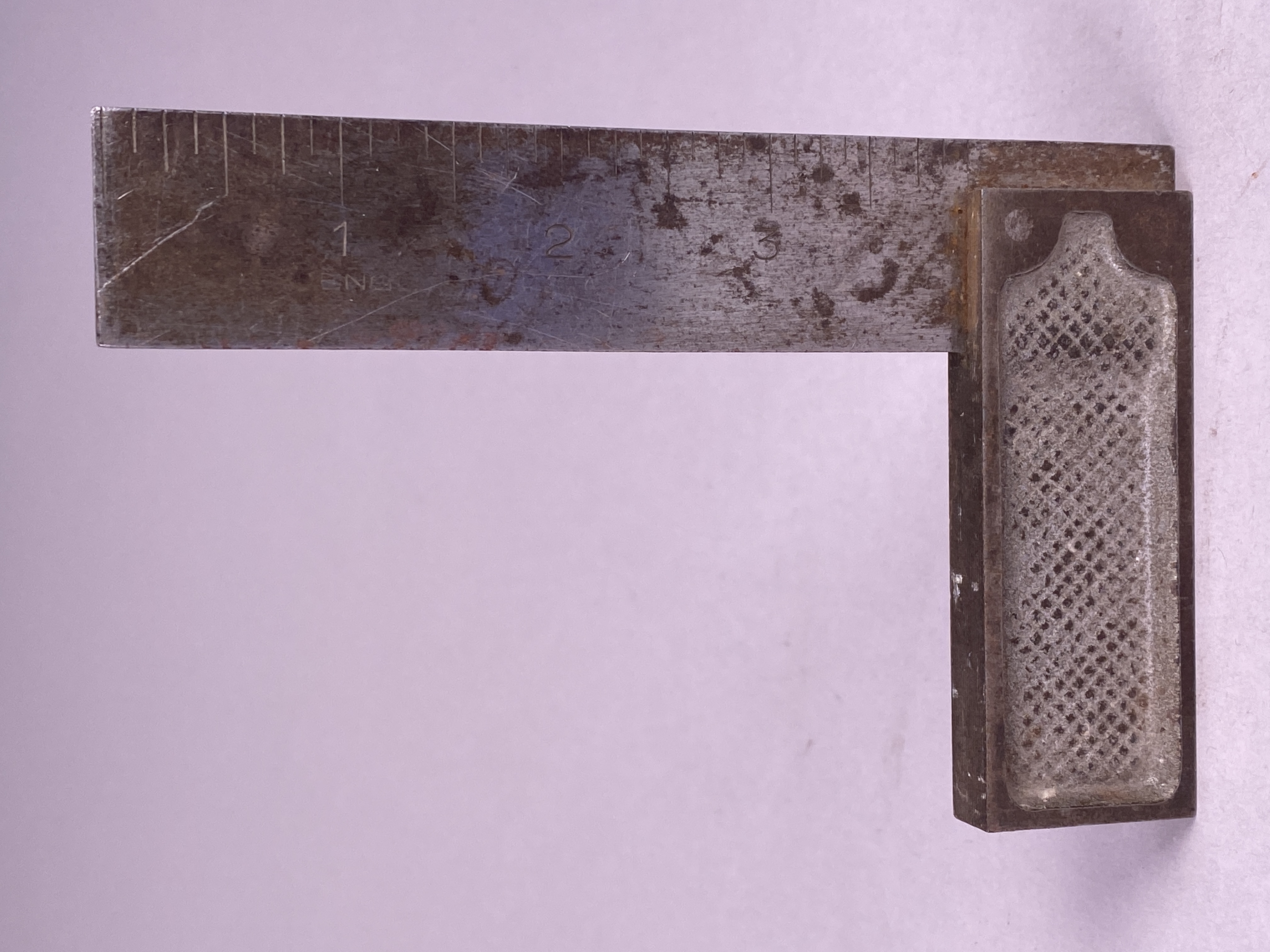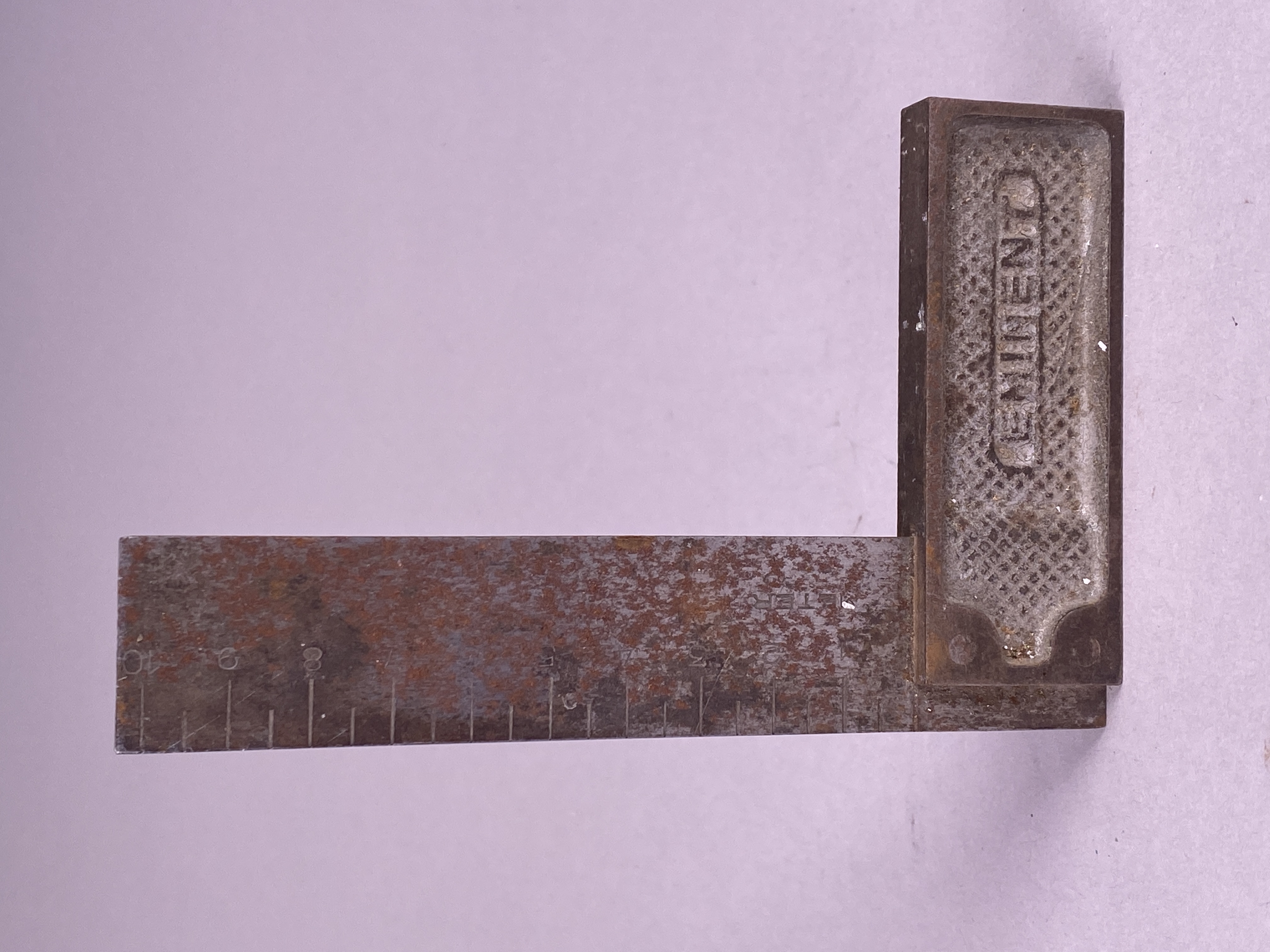 Vinkelhake i mindre format, graderad i cm på ena sidan och inch ("Engl") på den andra. Märkt "Eminent". Spår av rost.