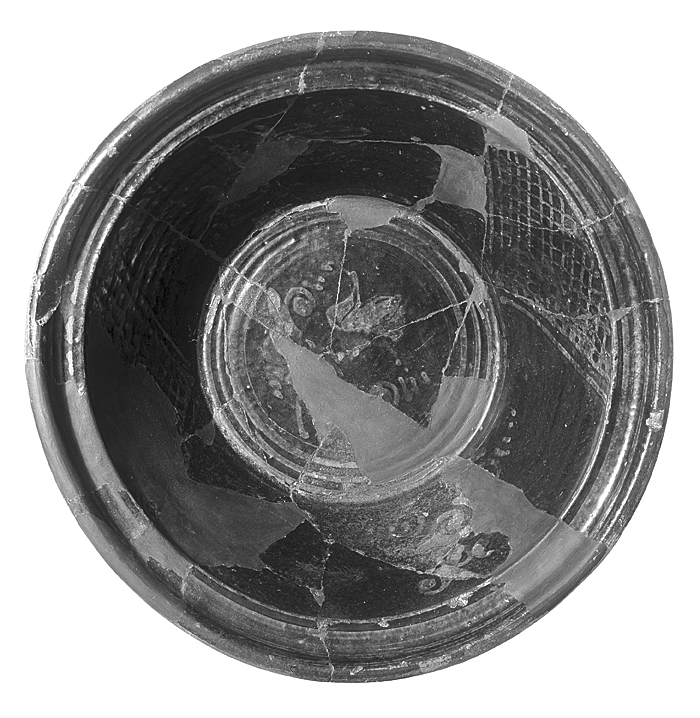 KÄRL, skål Av ljusbrunt lergods, med grön blyglaserad insidan. Hopsatt av ett flertal fragment Stympad trattformig, brädd något utstående med uppböjd kant. Dekor av piplera pålagd under glasyren (synlig som ljusgrön genom denna). På väggen två motsatta triangulära fält, fyllda av ett rutformigt gallermönster. Mellan fälten och på botten tulpanliknande växtornament. Runt botten och brädden koncentriska ränder. Höjd: 11 cm Brädd diameter: 34 cm Botten diameter: 20,3 cm Från omkring 1600-talet.