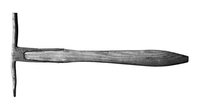 HAMMARE (tapetserar-) Av stål med träskaft. Hammarstycket med lång rundstavig pen och platt lång nacke, kilformigt avspetsad uppåt. Mellan pen (s. k. slag eller bane) och nacke i stället för öga ett åt insidan utgående platt mellanstycke, från vars kanter utgående en lång skänkel, mellan skänklarna skaftet fäst. Skaft av ask, ovalstavigt, med yttre delen spolformig, den inre insvängd; från inre delen utgående mellan skänklarna en platt tunga, fäst vid skänklarna medelst två genom dessa och skaftet gående nitar. Längd: 29,5 cm. Hammarstycke, längd: 14,1 cm. Pen, diameter: 0,9 cm.