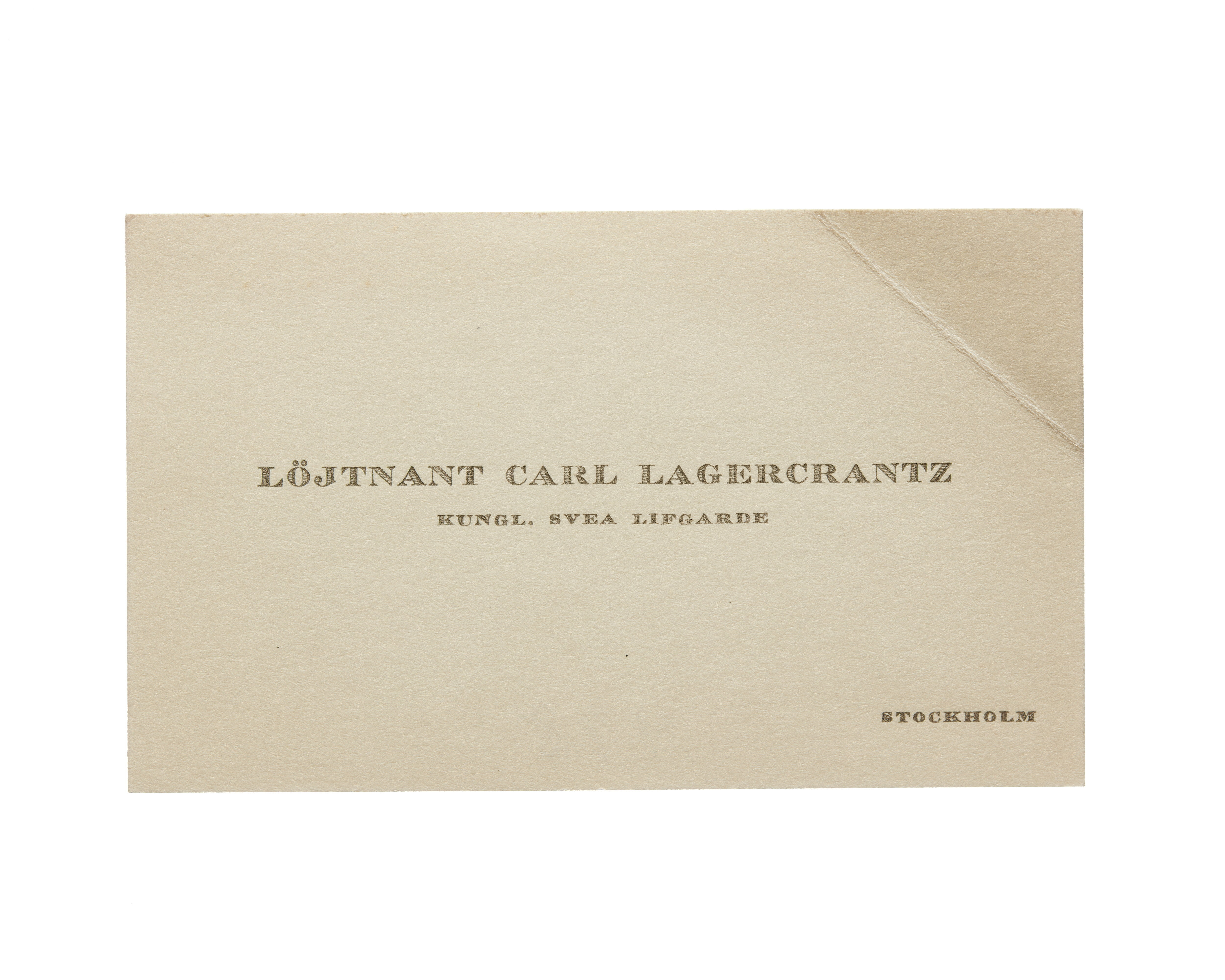 Ett visitkort från Löjtnant Carl Lagercrantz, Kungl. Svea livgarde, daterat 1930, vikt i övre högra hörnet. Adress (nedre högra hörnet) Stockholm.
