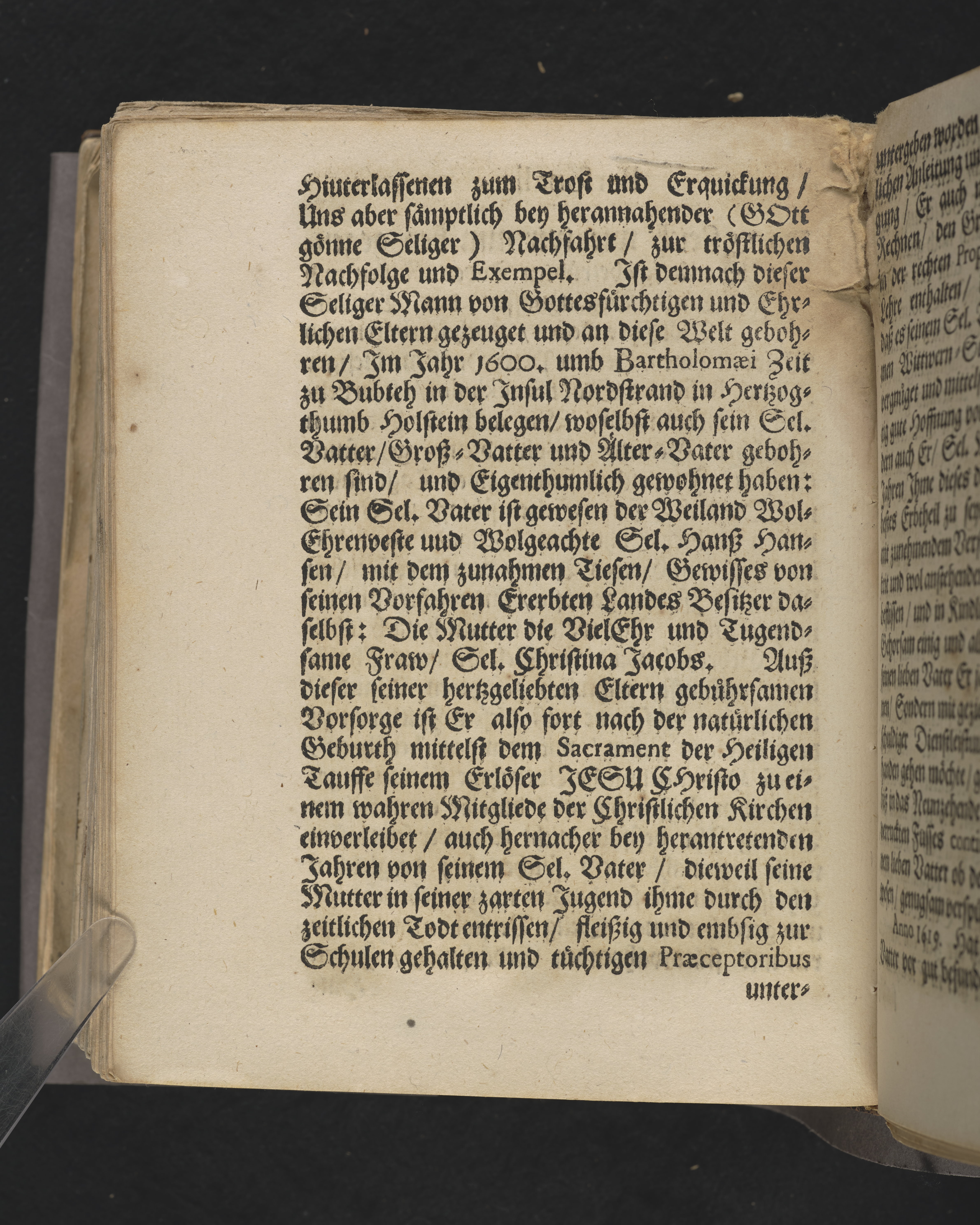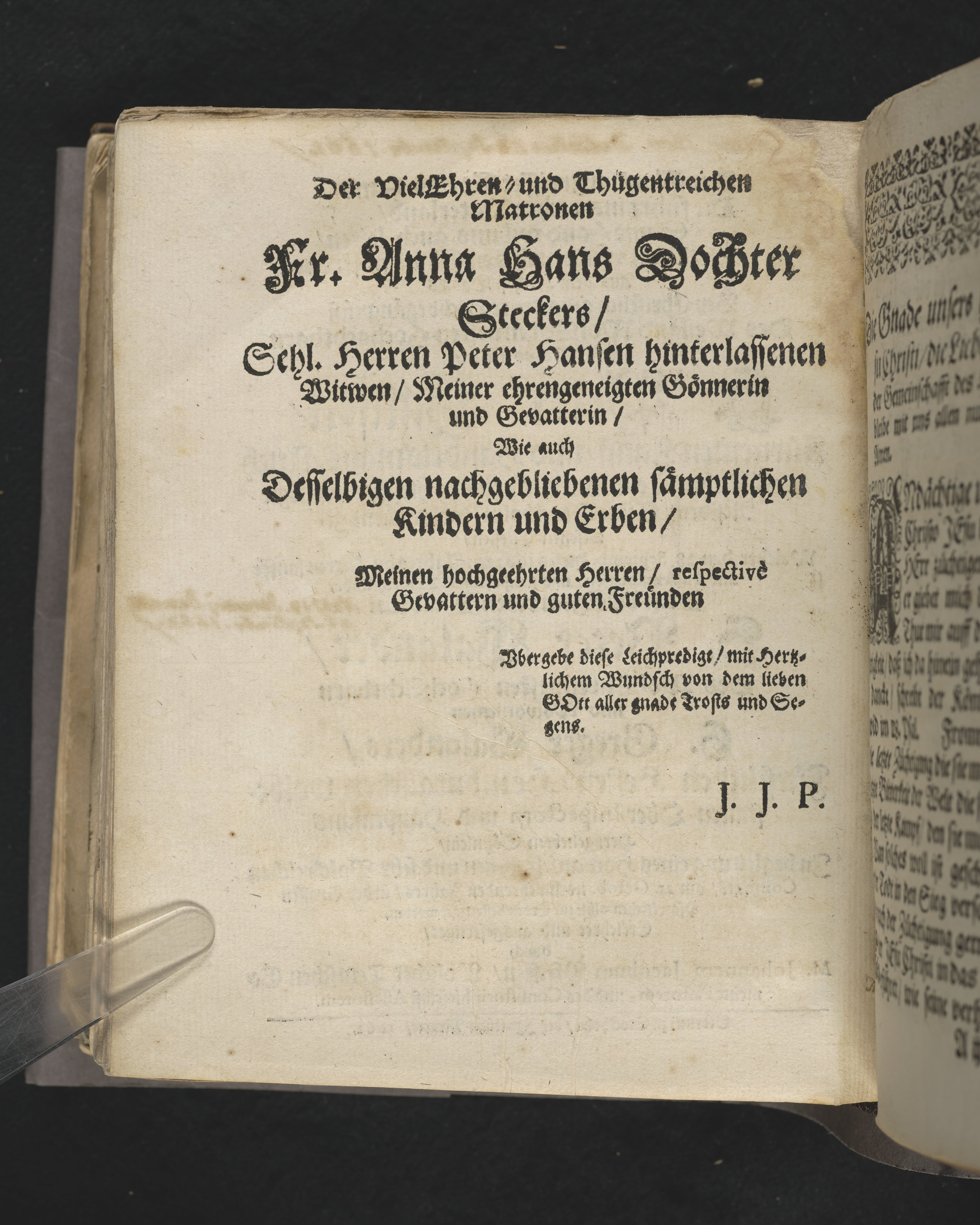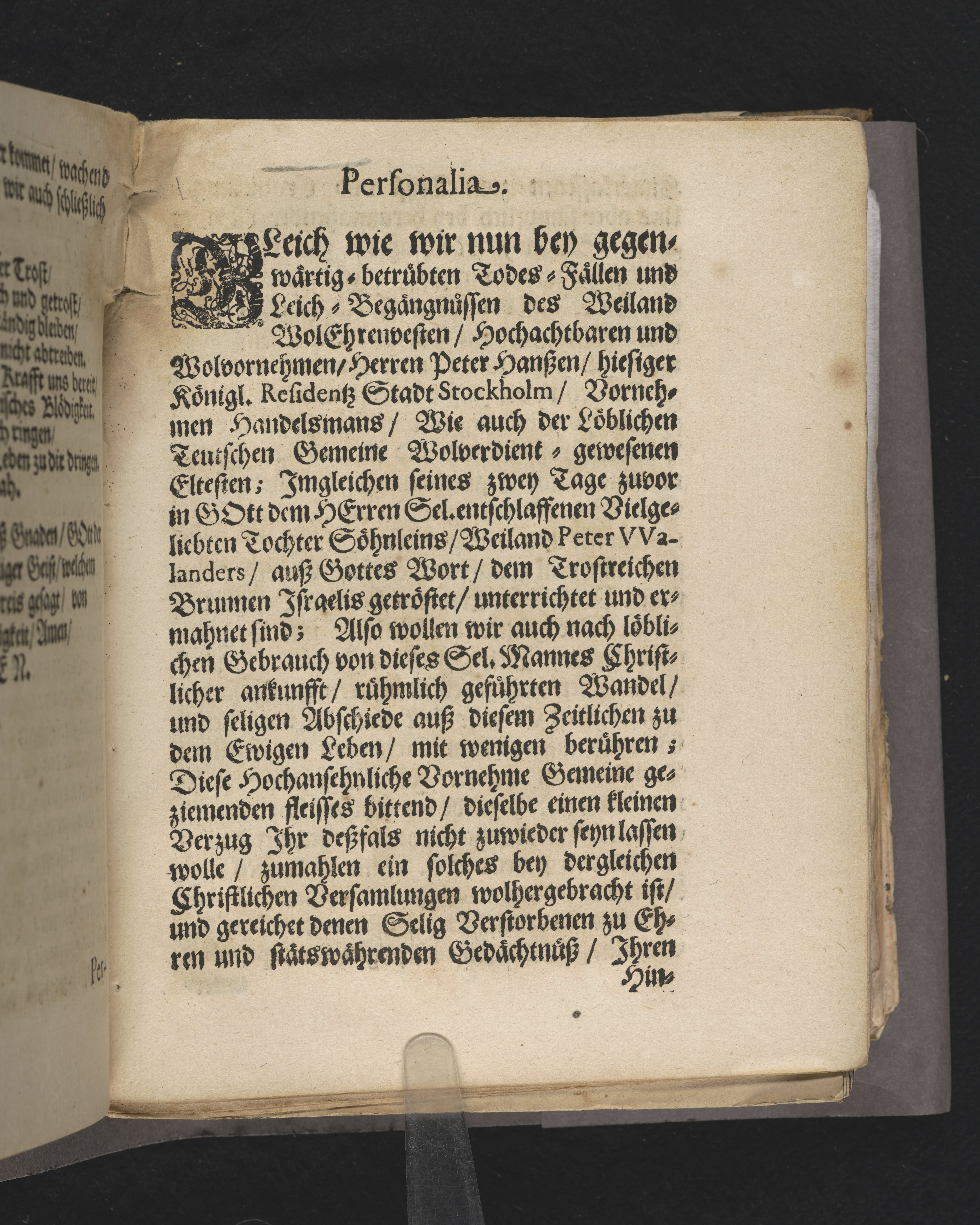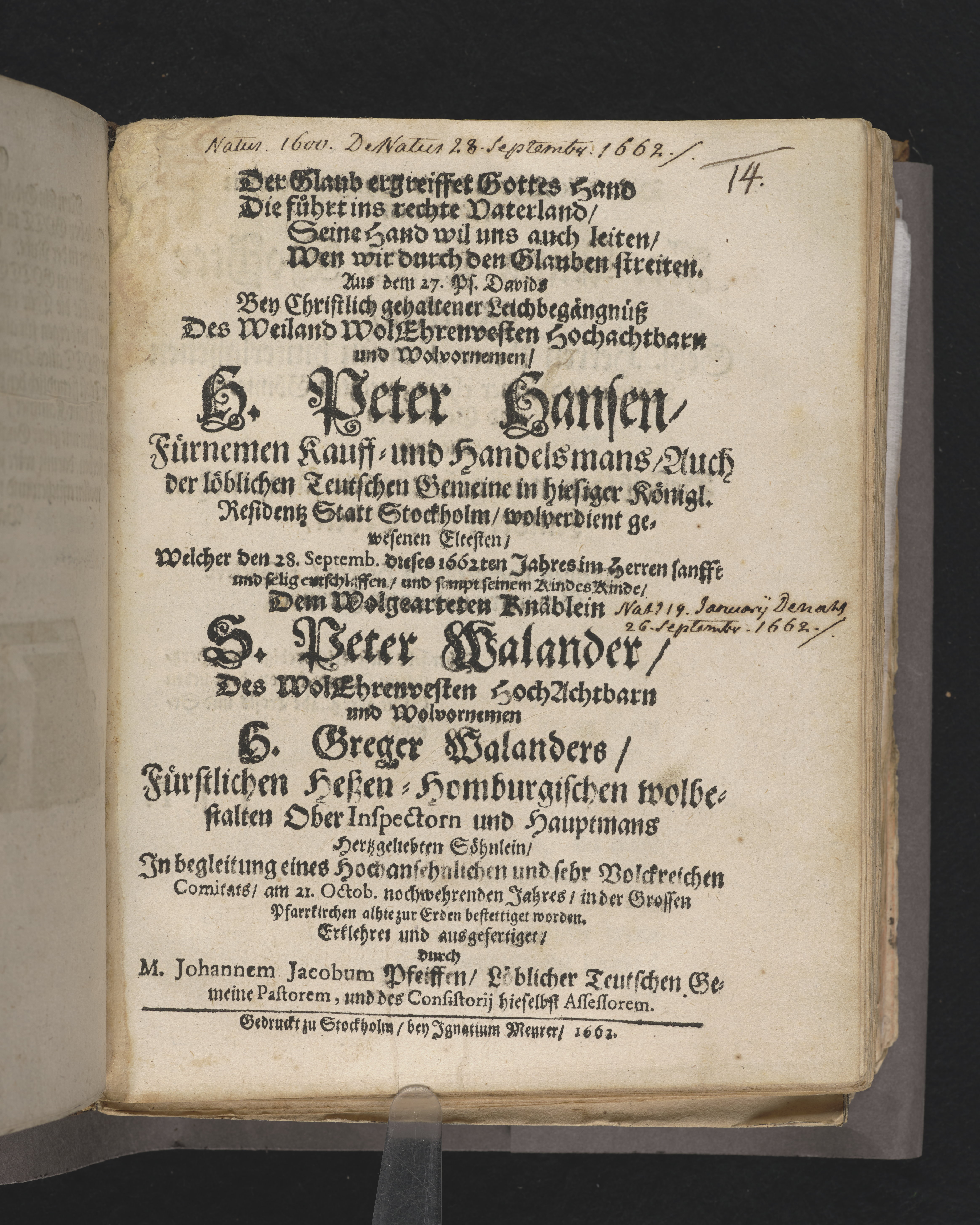 Der Glaub ergreiffert Gottes Hand ... bey christlich gehaltener Leichbegängnüsz des ... H. Peter Hansen ... Kauff- und Handelsmans ... sampt seinem Kindes Kinde, dem wolgearteten Knäblein S. Peter Walander, des wolehrenvesten hochachtbarn und wolvornemen H. Greger Walanders ... söhnlein ... am 21. octob. nochwehrenden Jahres, in der grossen Pfarrkirchen alhte zur Erden bestettiget worden. Erklehret und ausgefertiget, durch M. Johannem Jacobum Pfeiffen ... Gedruckt zu Stockholm, bey Ignatium Meurer, 1662.