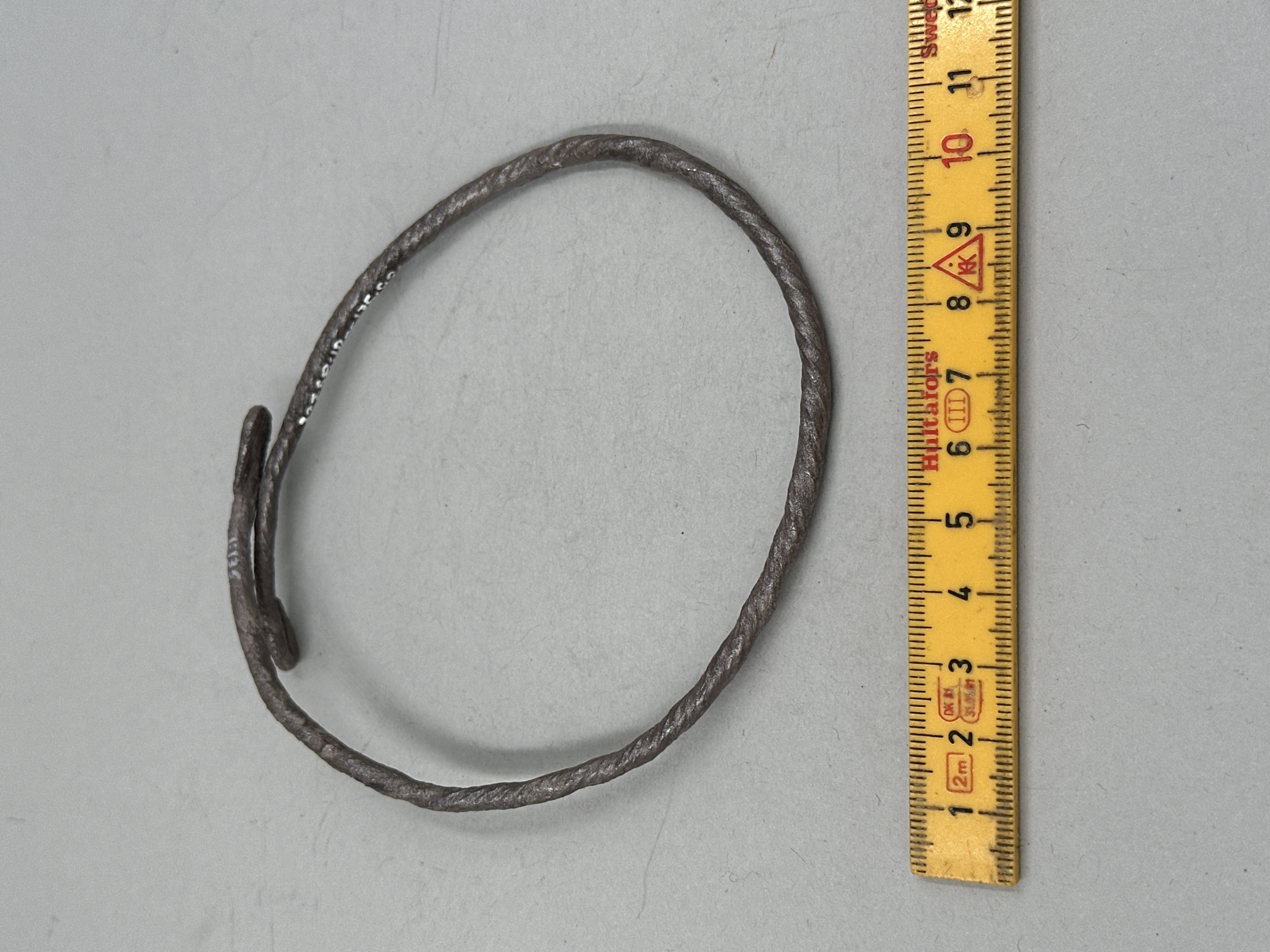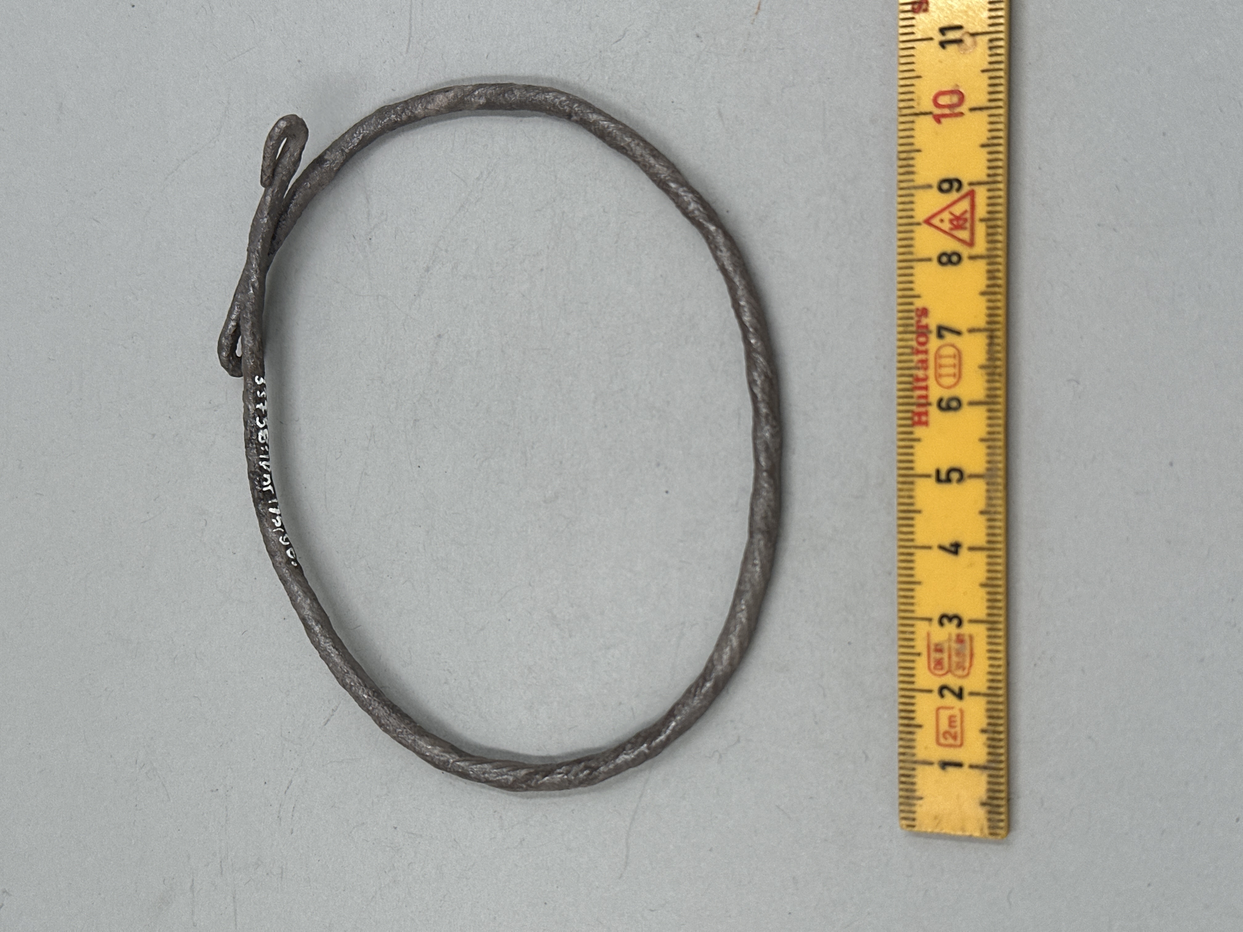 Rundad ten med spiralornamentik. Ändarna tillbakaböjda till öglor.