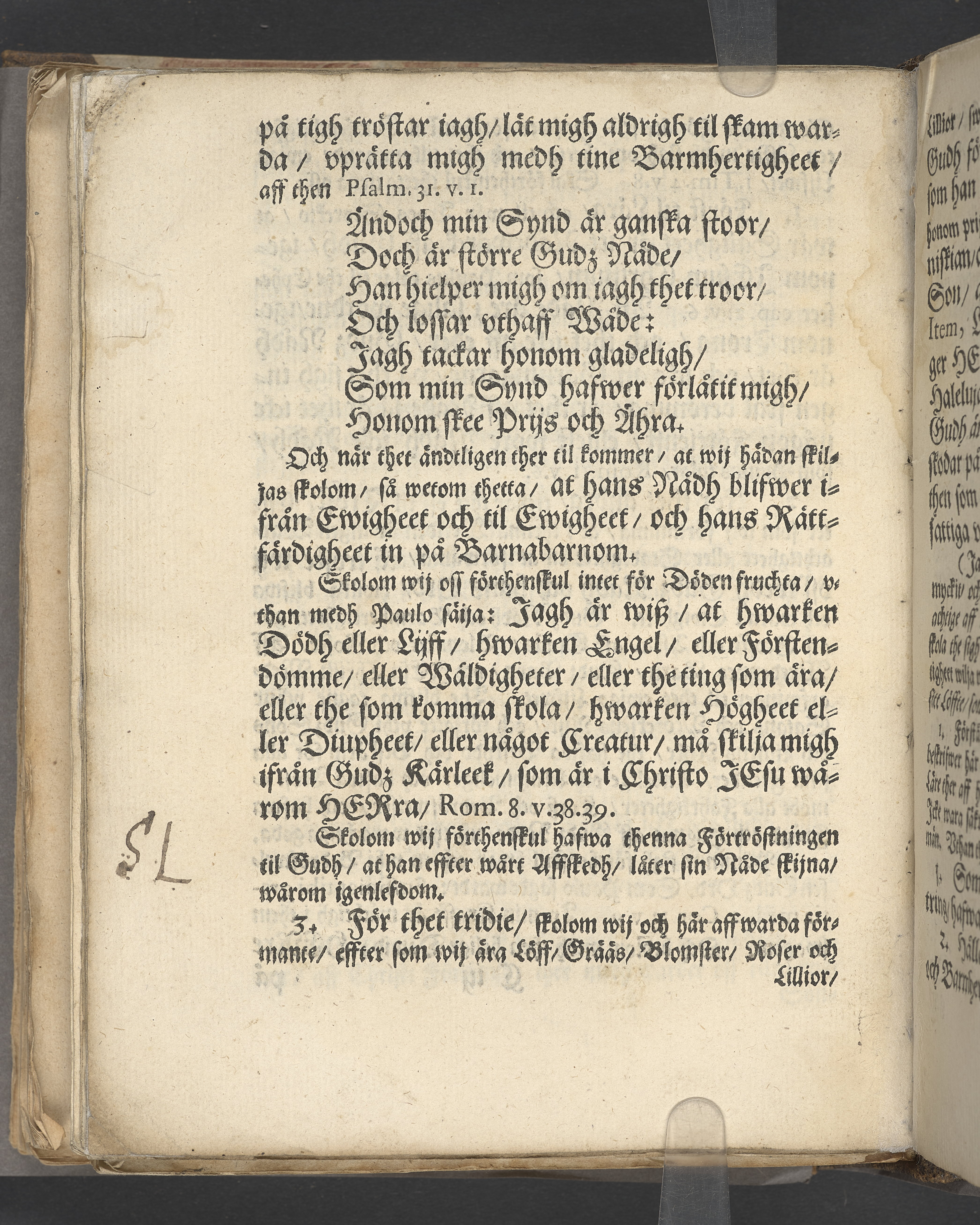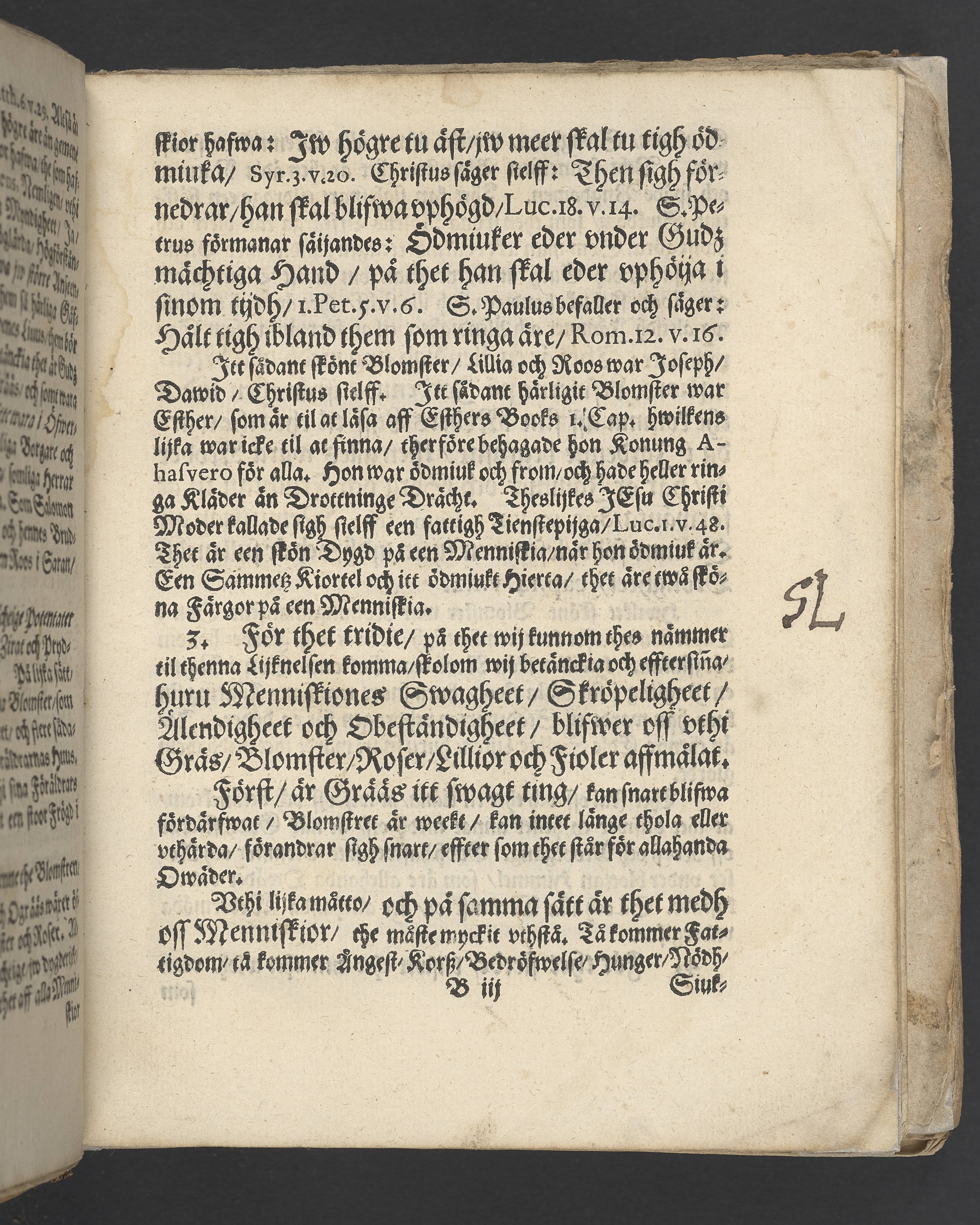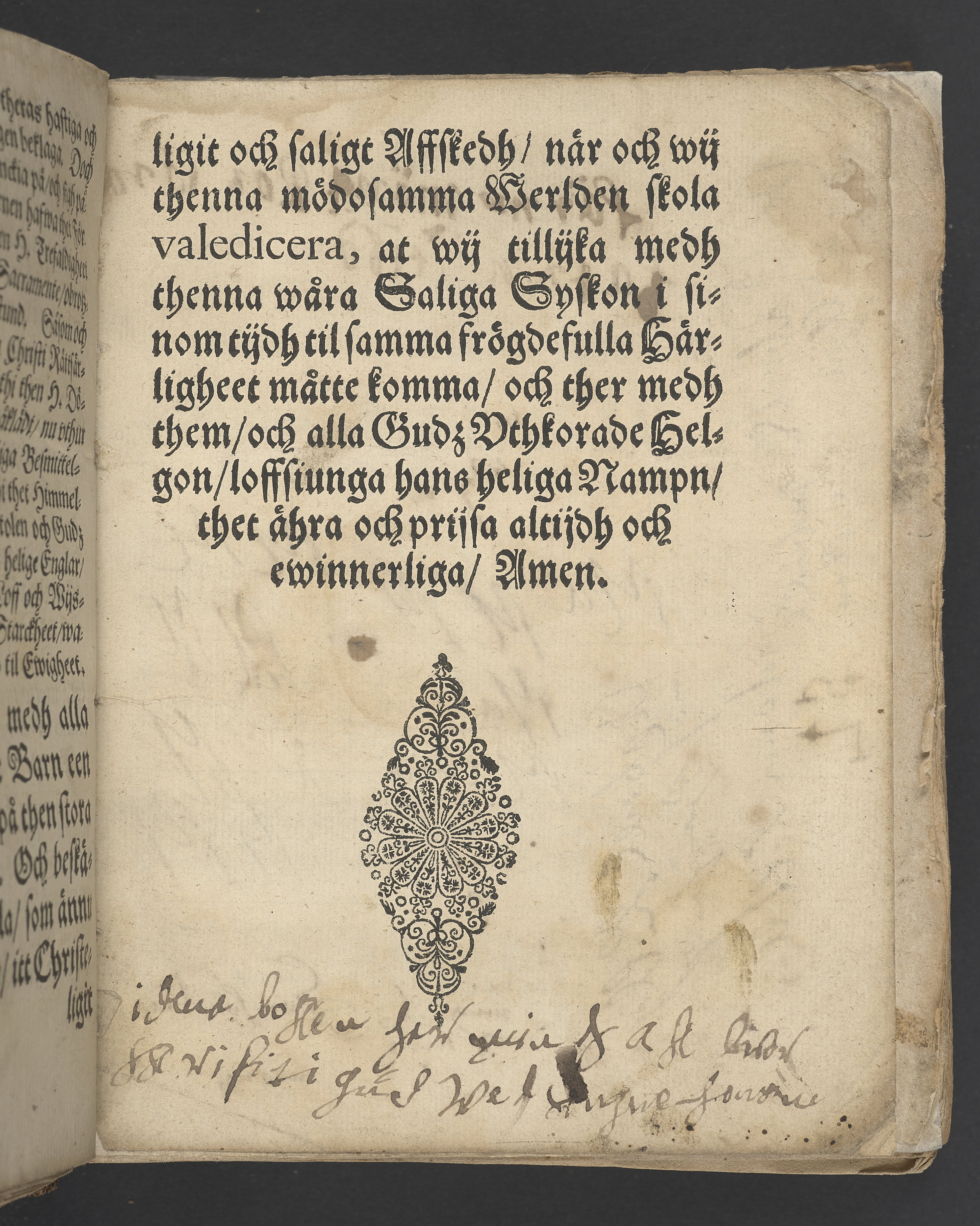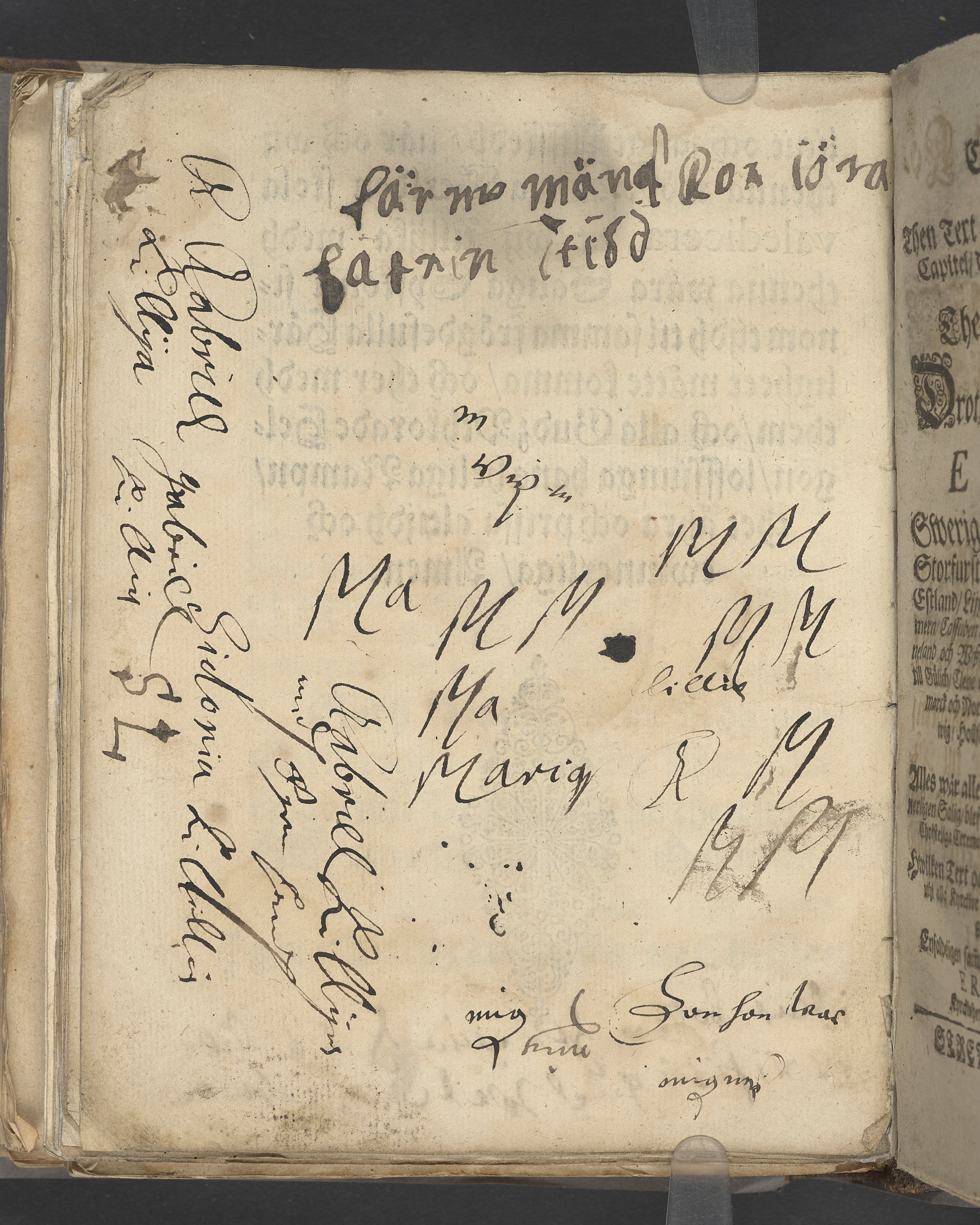 Högst upp på titelsidan anteckning i bläck med uppgifter om födelsedatum för de avlidna. Inskriptioner på titelsidan och sista bladet (r & v). Längst ner på titelsidan i bläck "herre hielp [-][-] alltidh må[?] gå", samt i blyerts "1688 och 35" (en uppställning för subtraktionen 1688-1653). På sista tryckta sidan (recto) längst ner "i dena boken har min h.a.k. brodr[?] skrifit i gud welsingne honom". På sista bladet verso talrika anteckningar i olika riktning, huvudsakligen namn bl.a. "Gabriel Lillija", "Sidonia Lillja" och "Maria". Längst upp med annan hand en svårläst inskription.