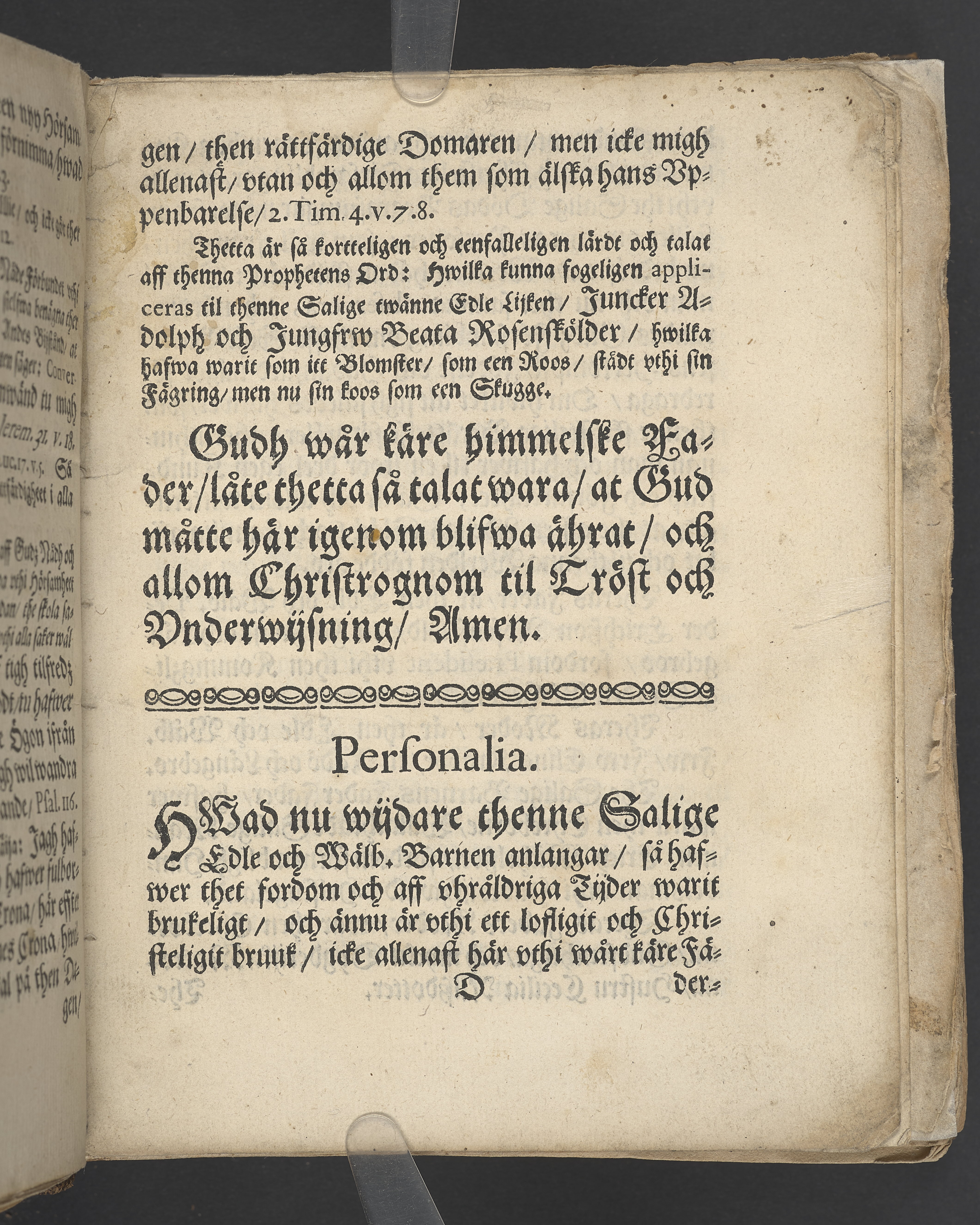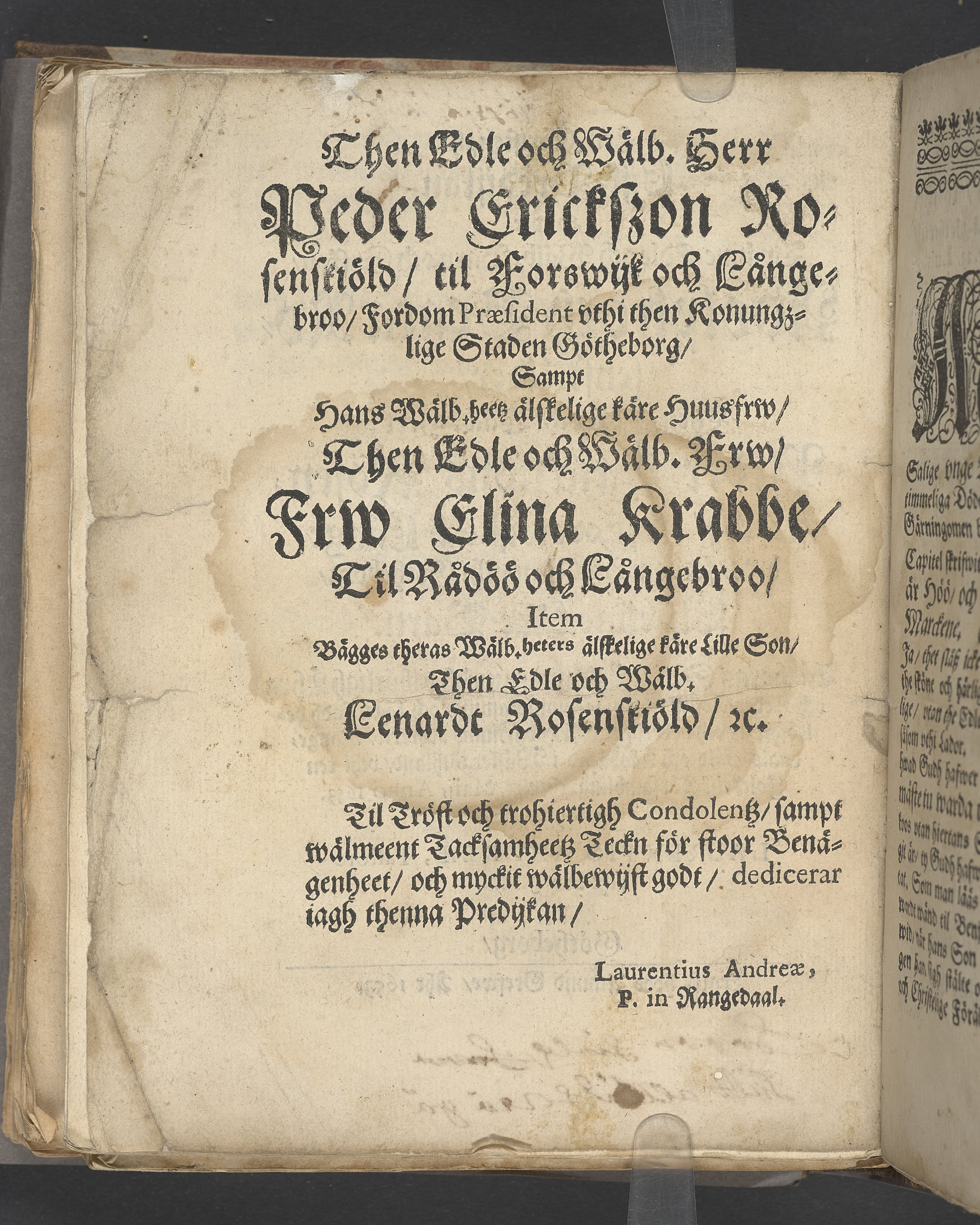 Een Christelig Lijk-Predikan öfwer twänne edle och wälb. barn och syskon/ Adolph och Beata Rosenskiölder/ ... elskelige käre barn. Tå theras salige lekammer medh tilböhrlig ähra och heder/ blefwe til theras hwilokammar och lägerstadh beledsagade och nedersatte vthi Hwarnums kyrckio/ Rangedaals gäld och Ååshärad i Wästergöthland/ vthi een folckrijk försambling/ then 15. maij, anno 1653. Håller af Laurentio Andreae, pastore vthi Rangedaal. Götheborg/ Tryckt hoos Amund Grefwe/ åhr 1653.