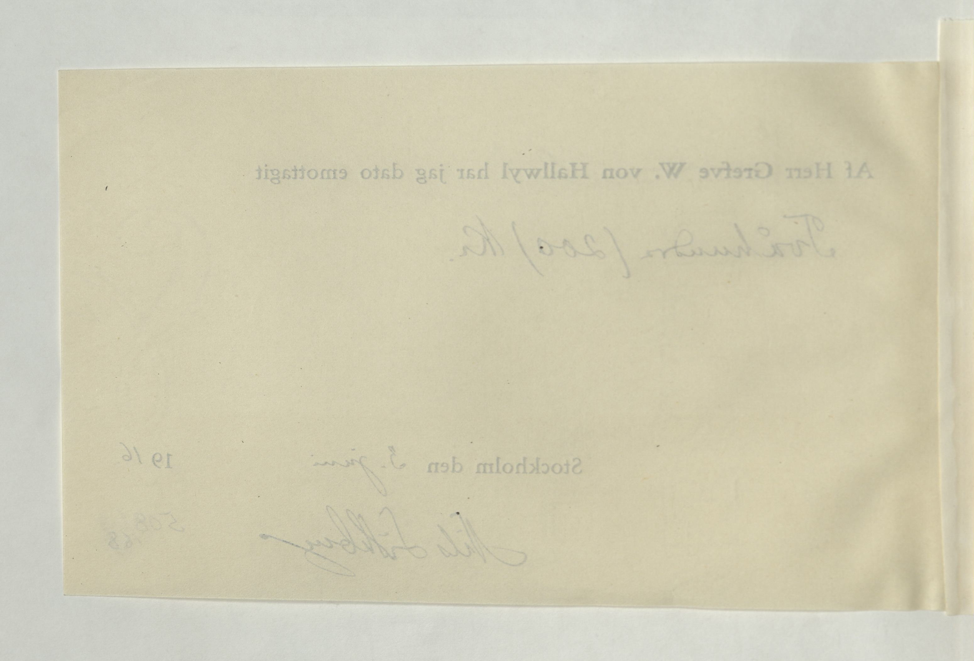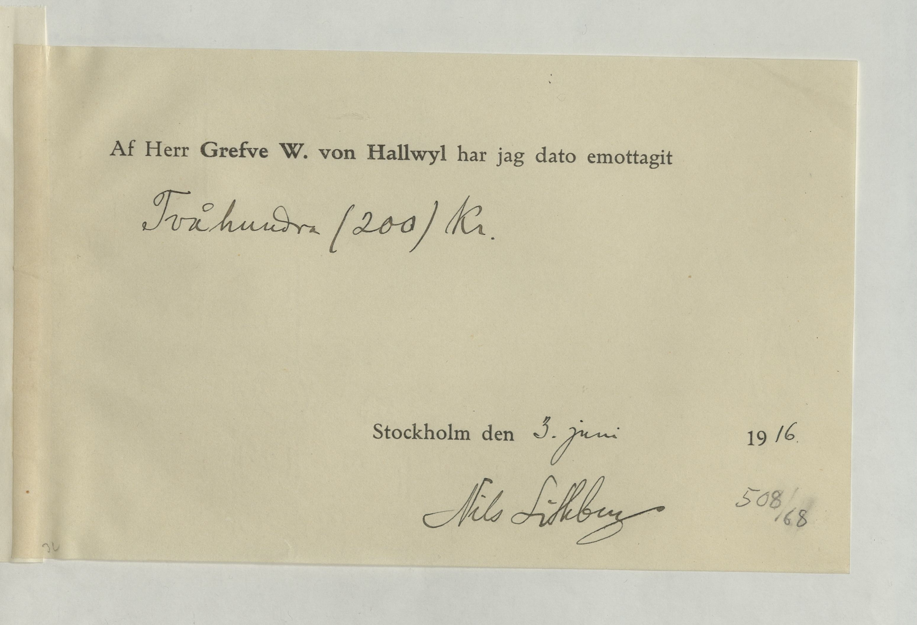Emottagande av arvode från greven Walther von Hallwyl till Nils Lithberg, 3 juni 1916.