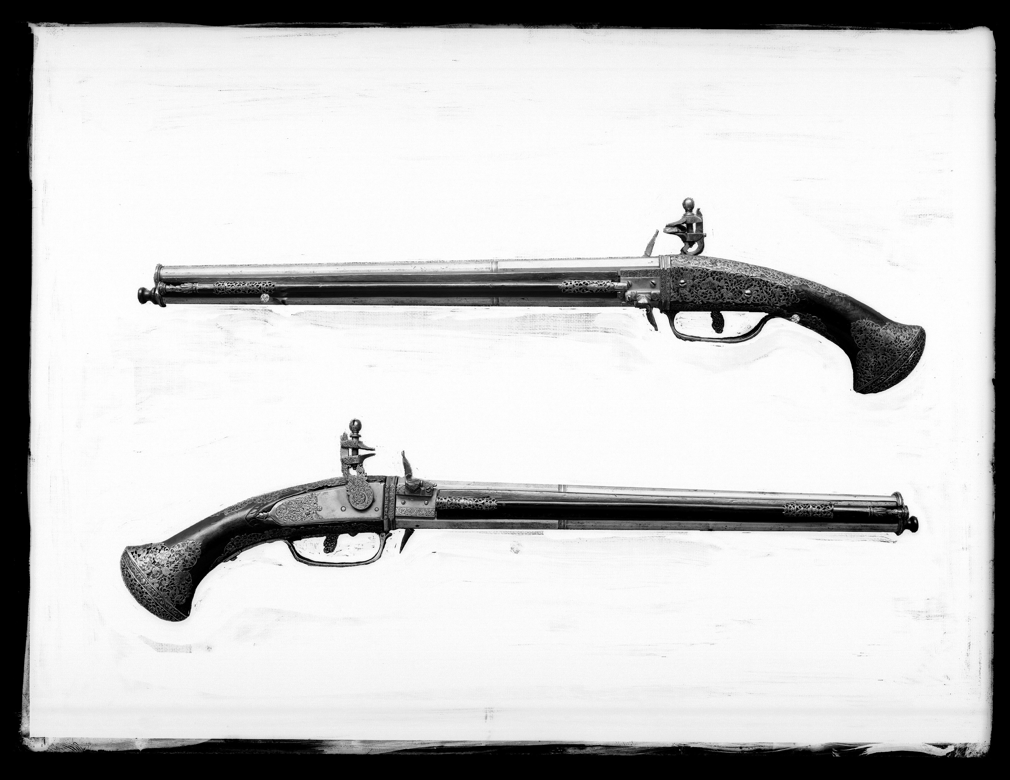Wenderkonstruktion med två slätborrade pipor, placerade över och under varandra. Sextonsidig främre del, åttsidig kammare med ringar vid övergången, på kammaren stämplade, delvis slitna signaturer: "LAZARINO COMINAZZO", bakom signaturen tre, mellan orden två och framför den en stämpel i form av ett trepass. Piporna framtill sammanhållna av en oval stålplatta med hål för piporna, profilerad kant. Baktill är piporna skruvade på svansskruvar, h: 12 mm, d: 13 mm, fästade på en åttsidig stålplatta, två långa sidor med graverad rankdekor, övriga sidor profilerade. Denna platta är i sin tur fäst på platta av samma form med en mutter på baksidan. Långsidorna dekorerade med en graverad bladstav, kortsidorna fasade. I båge runt axeln en fjäder med tapp, som går igenom plattan och bildar rotationsspärr i hak i svansskruvplattan. Fjädern nertill utdragen mellan två tappar på plattan och slutar med en ring, fäst i varbygeln. Piporna kan vridas runt när varbygeln dras bakåt.På plattan fäst ett rektangulärt, slätt svansskruvblad, avbrutet vid krysskruven samt ett slätt, rektangulärt avtryckarbleck, båda graverade med kantlinjer, blecket avbrutet vid hålet. Flintlås med plant, framtill tvärt avslutat låsbleck, fasade kanter, bakspetsen utdragen till ett flikigt odjurshuvud och en blomma, vågrätt skrafferad bakgrund. S-formig, platt hane med ringformig hanhals och utskott på bröst och hals, yttäckande, graverad rankdekor, på ryggutskottet ett odjurshuvud. Nötskruvhuvud i flykt med hanen, bladrankor, ingen skåra. Kantig hangren med litet, graverat blad på spetsen, kantiga, fasetterade käkar med graverad rankdekor på utsidan samt på mittfasen av båda käkar. Överkäken lös, kulformigt, slätt käkskruvhuvud. På låsbleckets insida en stämpel: åt v. vriden sköld med hand, hållande en sporrliknande blomma, flankerad av C L (Stöckelnr 2249, Carpegna I:124). Nöt utan studel i form av en rund platta med hak i kanten, på utsidan upptill en tapp mot vilken slagfjäderns övre arm trycker. Fästning: Två låsskruvar från v. sida. Avtryckare i form av ett genombrutet rankverk. Mellan piporna baktill två rektangulära stålplattor med graverad rankdekor vid ena kanten, vid den andra fäst en stålstav med blad i bakänden, på mitten en fängpanna med fasetterad undersida. Batteri med välvt fängpannelock, bladdekor. Fasetterat eldstål med graverad bladbård på mittfasen, som är rundad och framåtböjd upptill. Batterifjäder dold på stavens undersida. Två fästskruvar. Helstock av valnöt i två delar. Något nedåtböjd kolv, kolvkula med spetsovalt tvärsnitt. Framstocken är inträdd mellan piporna och fästad endast av pipplattan framtill, ena sidan plan, den andra skålad för laddstocken. Beslag och inläggningar av stål med yttäckande, genombrutet rankverk, "trafori". Spetsoval, välvd kolvkappa i form av ett genombrutet rankverk i stålsnitt, ej genombruten kantbård med bladranka i stålsnitt. På kolven därframför inläggningar av blom- och bladrankor med framåtriktade, runda spetsar på kolvens sidor. Samma typ av inläggningar finns runt svansskruvbladet och bakåt på halva kolvryggen, som sidbleck, runt varbygeln samt i tre fält på framstockens plana sida. Två genombrutna rörkor. Varbygel med bladdekor i stålsnitt vid stolparna, kantlister med bladrankor i låg relief samt genombrutet mittparti med bladrankor, främre stolpen fäst med skruv vid pipornas rotationsspärr. Bakre armen slät, välvd med ändblad, genombrutet, rektangulärt hål, i vilket löper en stålbygel. Varbygeln fasthålles av stålring, fäst i bygeln.