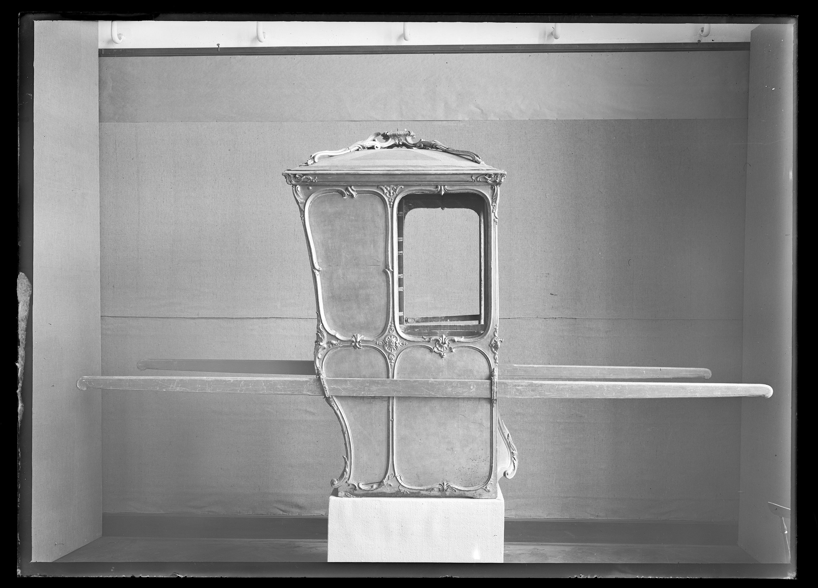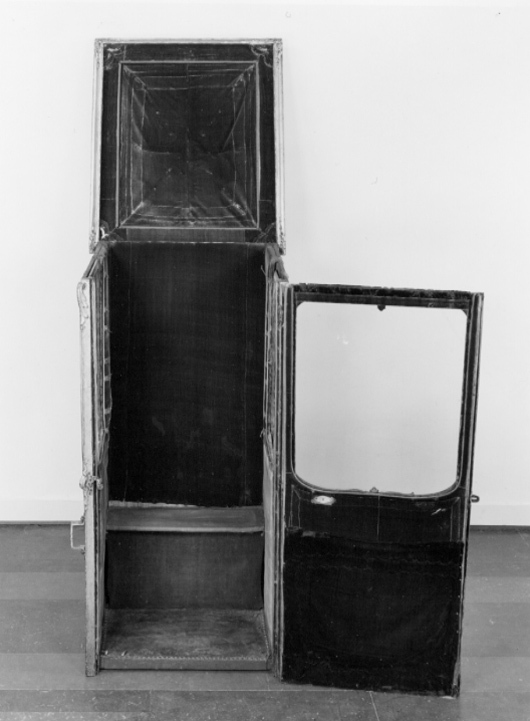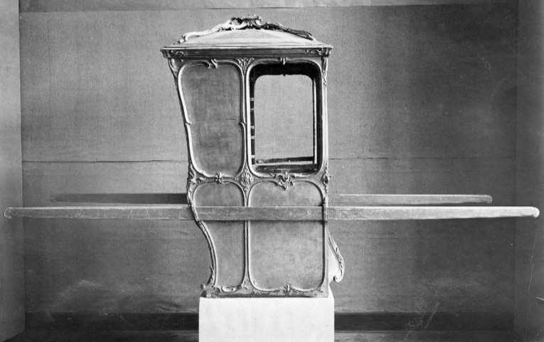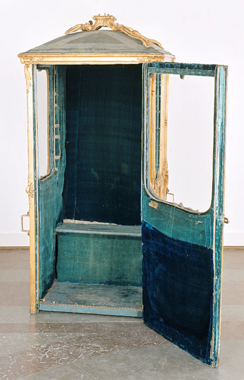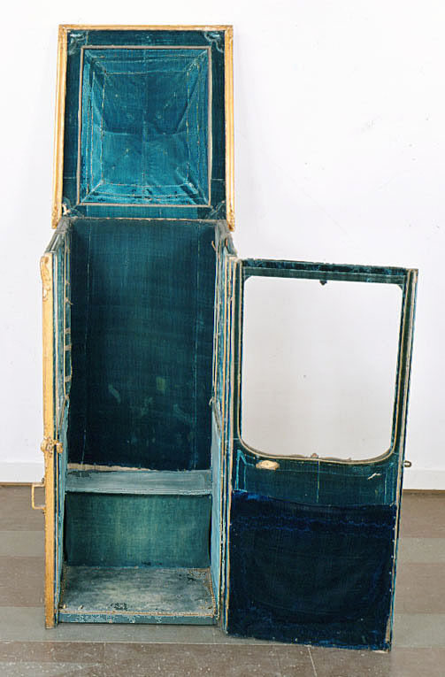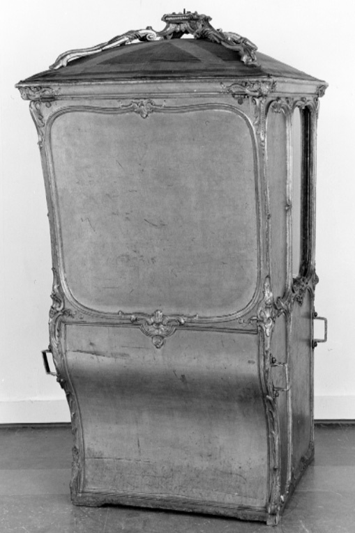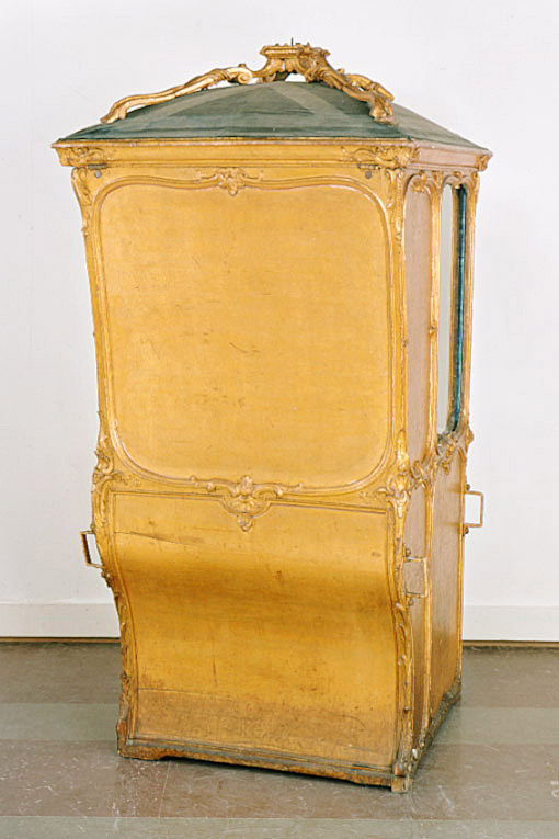 Bärstol (eng. sedan chair) för drottning Lovisa Ulrika bestående av kupé med öppningsbart tak. Förgylld kupé med nedåt avsmalnande bakre kontur i vågform. Främre konturen med ansvällning längst ner. Sidostyckena indelade i två större och två mindre avrundade fält/speglar, inramade med skurna rokokoornament i förgyllt trä bestående av snäckor, voluter, bandornamentik och akantus. De övre främre speglarna med glas, övriga med förgyllt trä. På sidostyckena, strax under mitten, två gjutna brännförgyllda metallhänklar, att föra in bärstängerna i. Fronten med glasförsedd dörr och likartad ornamentik som sidostyckena. Bakstycket indelat i två fält/speglar, dekorerade som sidostyckena. Konvext öppningsbart tak. Från mitten, mot hörnen strävande, skurna och förgyllda ornament i trä (?). Insidan av kupén klädd med blå sammet.