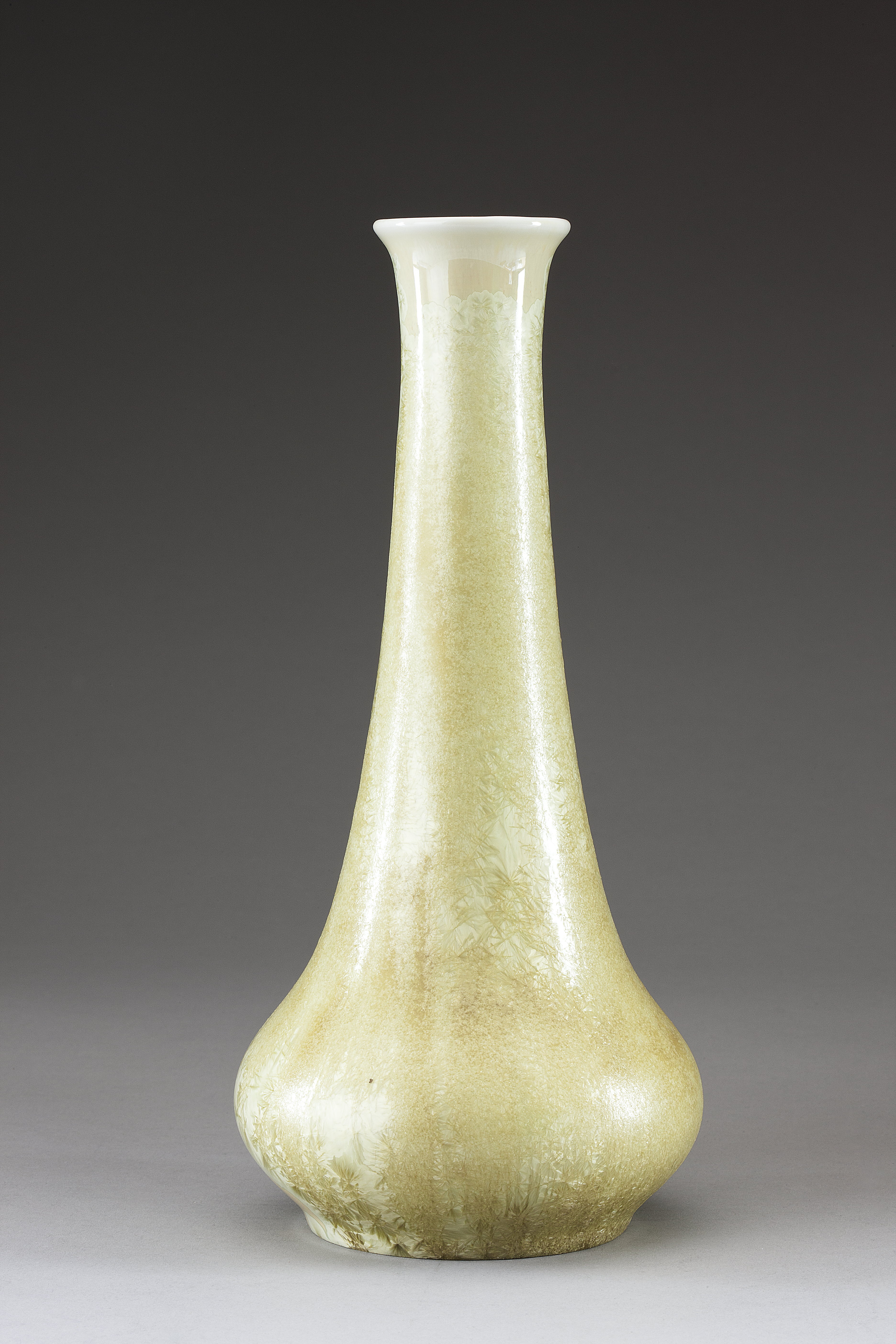Vas, nedtill bukig samt med uppåt avsmalnande lång hals, mynningen något utsvängd på fotkant. På utsidan ljust gröngul lasyr, uppblandad med metallpartiklar som under bränningen fällts ut varigenom den rimfrostliknande krackeleringen uppstått. Fabrikens privilegium utfärdades 1729, dess verksamhet synes dock ha börjat redan 1726. Intill 1860-talet tillverkades endast fajans av olika slag, från 1857 även benäkta porslin samt från 1881 fältspatäkta porslin. Fabriken flyttades 1926 till Göteborg