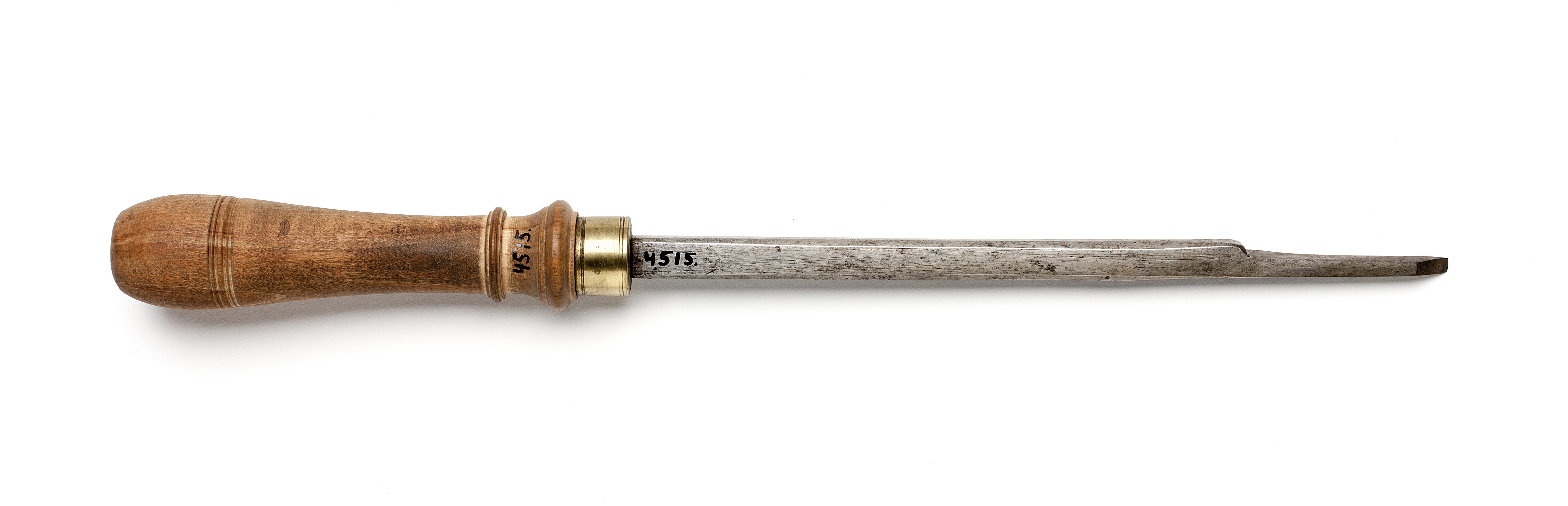 Klinga med rektangulär genomskärning, avfasade kanter, via intagning på en sida övergående i smalare ände. Stämplat på klingan: "EP". Svarvat skaft av päronträ, med två vulster nedtill ("rydboholmstyp"). Mässingsring.