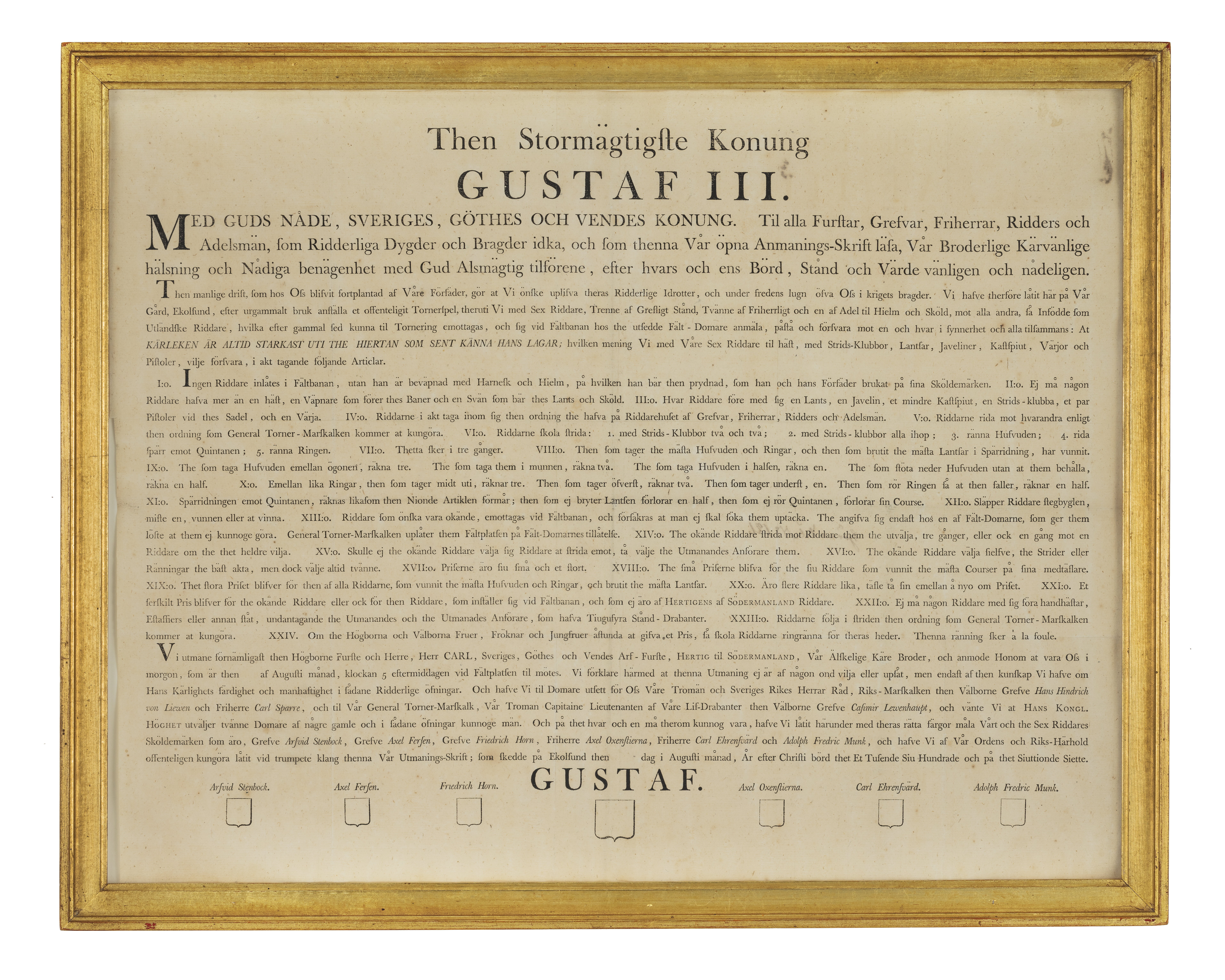 Utmaningsbrevet är tryckt på papper och innehållet är författat av Gustav III. "Then Stormägtigste Konung Gustaf III, Med Guds Nåde, Sveriges, Gothers och Venders Konung" - utmanar här tillsammans med sina sex riddare (Arfvid Stenbock, Axel Fersen, Friedrich Horn, Axel Oxenstierna, Carl Ehrensvärd och Adolph Fredrick Munk) varje infödd eller utländsk riddare, som enligt gammal sed var berättigad att deltaga i turneringen. Här omnämns även de teser som kungen resp. utmanaren hertig Karl skulle strida för. Utmaningsbrevet är undertecknat GUSTAF samt de de sex riddarnas namn över tomma vapenskölden. Utmaningsbrevet är inramat i en 2,5 mm bred profilerad och förgylld träram.
