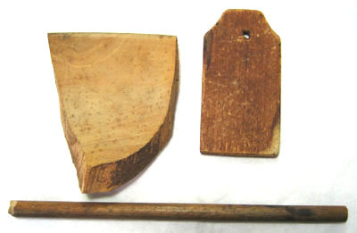 1. Pinne av lövträ, rak med cirkulärt tvärsnitt. Ena änden skuren till en grov spets. L 195, diam 10, vikt 7 g. 2. Fragment av träskål? Av ljust lövträ, skålad med släta sidor. L 93, B 74, vikt 29 g. 3. Bricka, möjligen till nyckel. Rektangulär, platt och betsad mörkt brunröd. Ena änden med fasade kanter och centrerat genomgående hål. L 90, B 47, vikt 14 g.