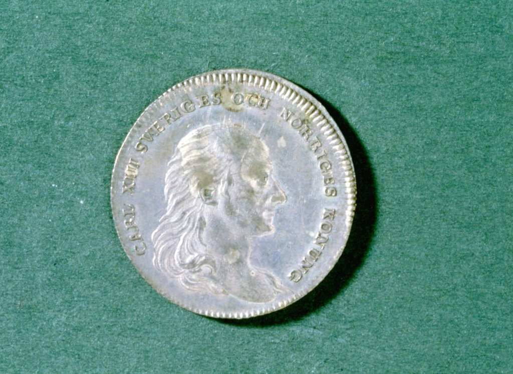 Kastpenning från Karl XIII:s (1748-10-07 - 1818-02-05) begravning i Riddarholmskyrkan 1818-03-20. Gåva av intendent Rudolf Cederström. Ur givarens farfars, friherre Karl Emanuel Cederströms (1804-1892) chiffonier (enligt inv.1867 sannolikt erhållen av denne och hans fader, amiral greve O.R. Cederström).