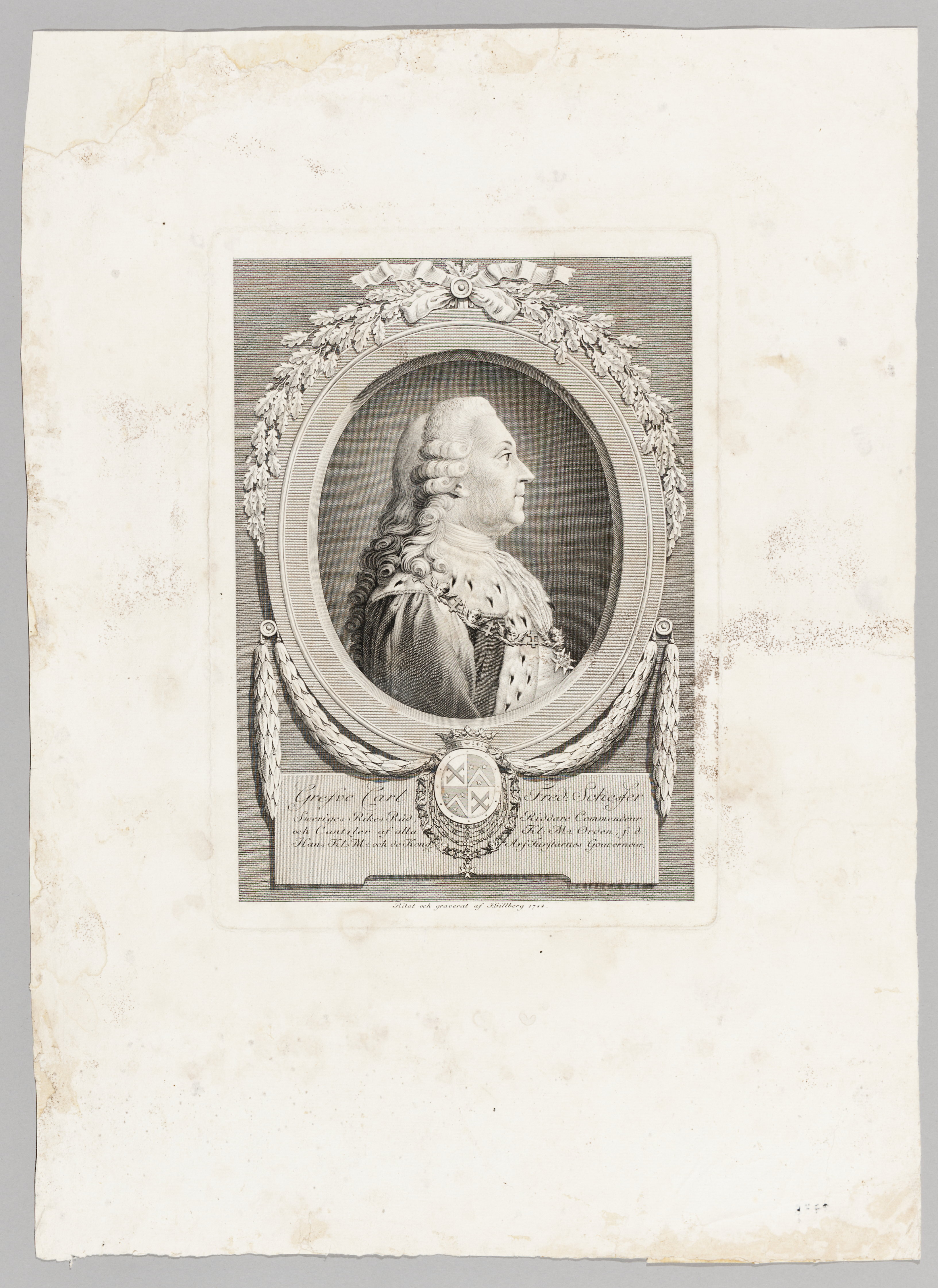 Bröstbild, profil höger Klädd i riksrådsmantel med serafimerordens kedja. Lång piskperuk. Porträttet inom oval ram. Nedtill följande text: "Grefve af alla Kl:Ms Orden, f.d. Hans Kl. Ms och de Kongl. Arf-Furstarnes Gouverneur" samt Schefferska vapnet. Sign. "Ritat och graverat af J: Gillberg 1784".