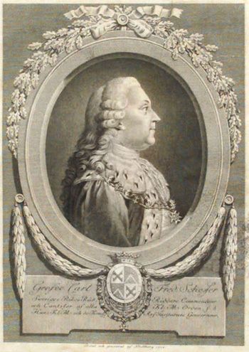 Porträtt av Carl Fredrik Scheffer, greve, 1715-1786. Kopparstick.