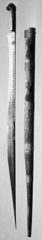 Fäste med åttkantigt tvärsnitt upptill böjt och kantigt av stål i ett med klingan, övre hälften beslagen med mässing med ciselerad ranka och linjeornament cirklar, kryss och romber, konisk nitknapp. Nedre hälften med påslagna band av mässing med rombiska rutor längs ryggen ciselerad ranka som fortsätter på klingans rygg. Klinga av stål 41 mm bred vid fästet, eneggad med rak rygg och utdraget s-formad egg och lång spets. Längs ryggen på båda sidor triangelbård av påslaget guld omgivet av punsade linjer, närmast fästet på ena sidan cirkel, på andra halvcirkel.