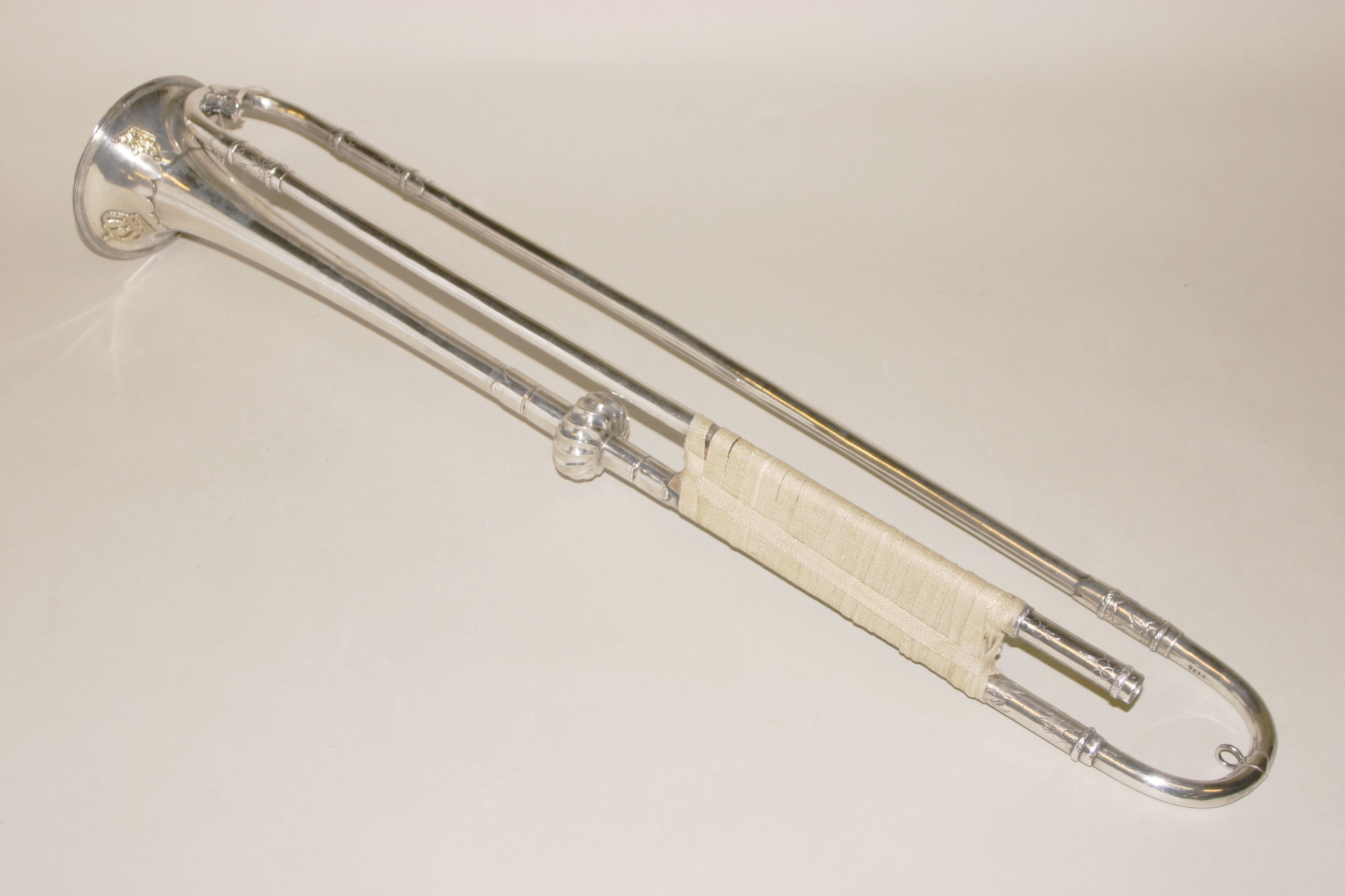 Runt bygeln lindat ett smalt band av naturfärgad linnekypert?. Hovets silvertrumpeter som förvaras på Livrustkammaren kan tillskrivas Carl Lilja eller Casper Christian Liendenberg, mer sannolikt den senare. Liendenberg har år 1747, enligt Riksmarskalksämbetets handlingar från 1749, levererat och slutgiltigt fått betalt för tolv silvertrumpeter tillverkade av kasserade silvertrumpeter. De tolv silvertrumpeter som Lilja fick i uppdrag att tillverka 1731 kan, trots det korta tidspannet, ha utgjort råmaterialet.