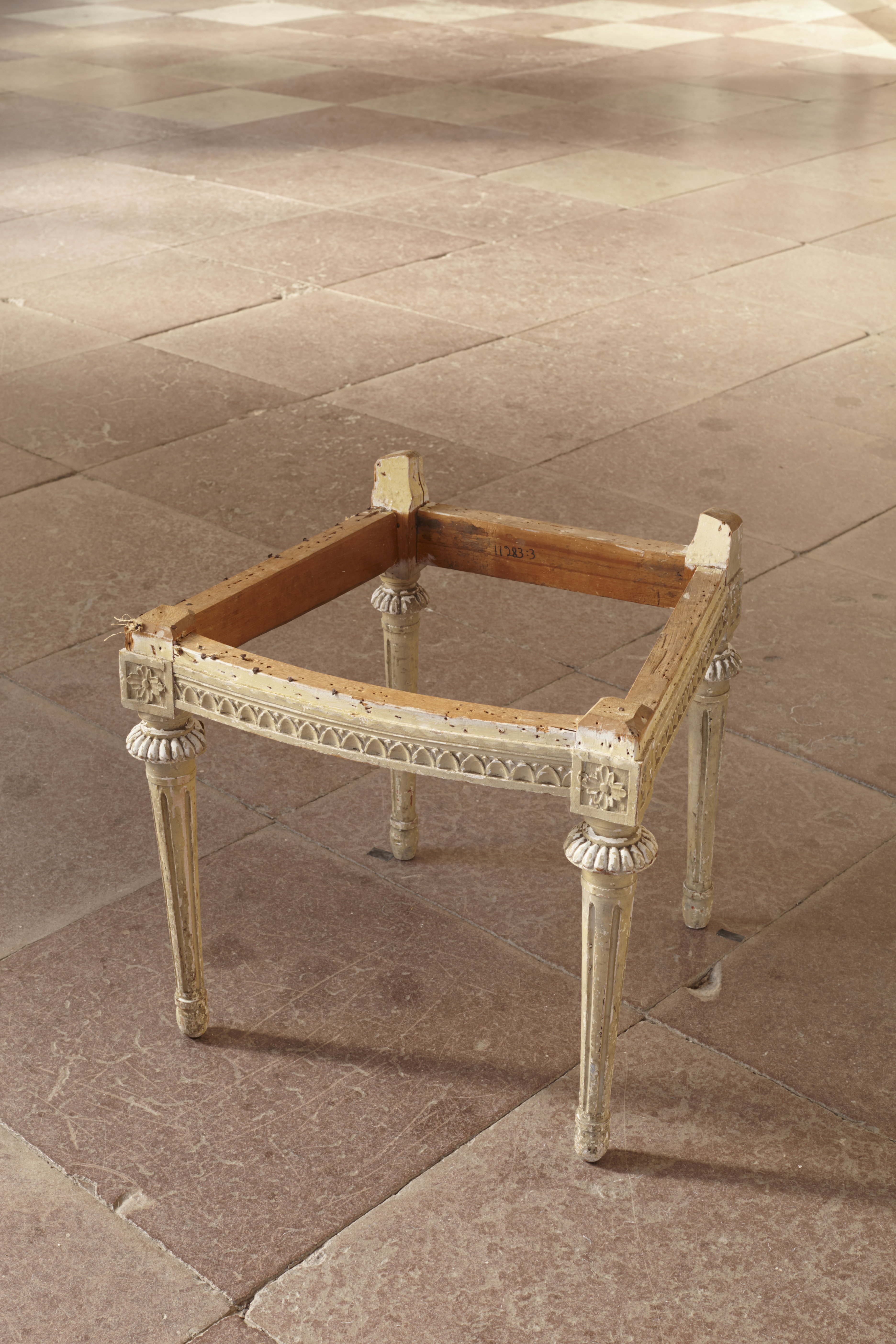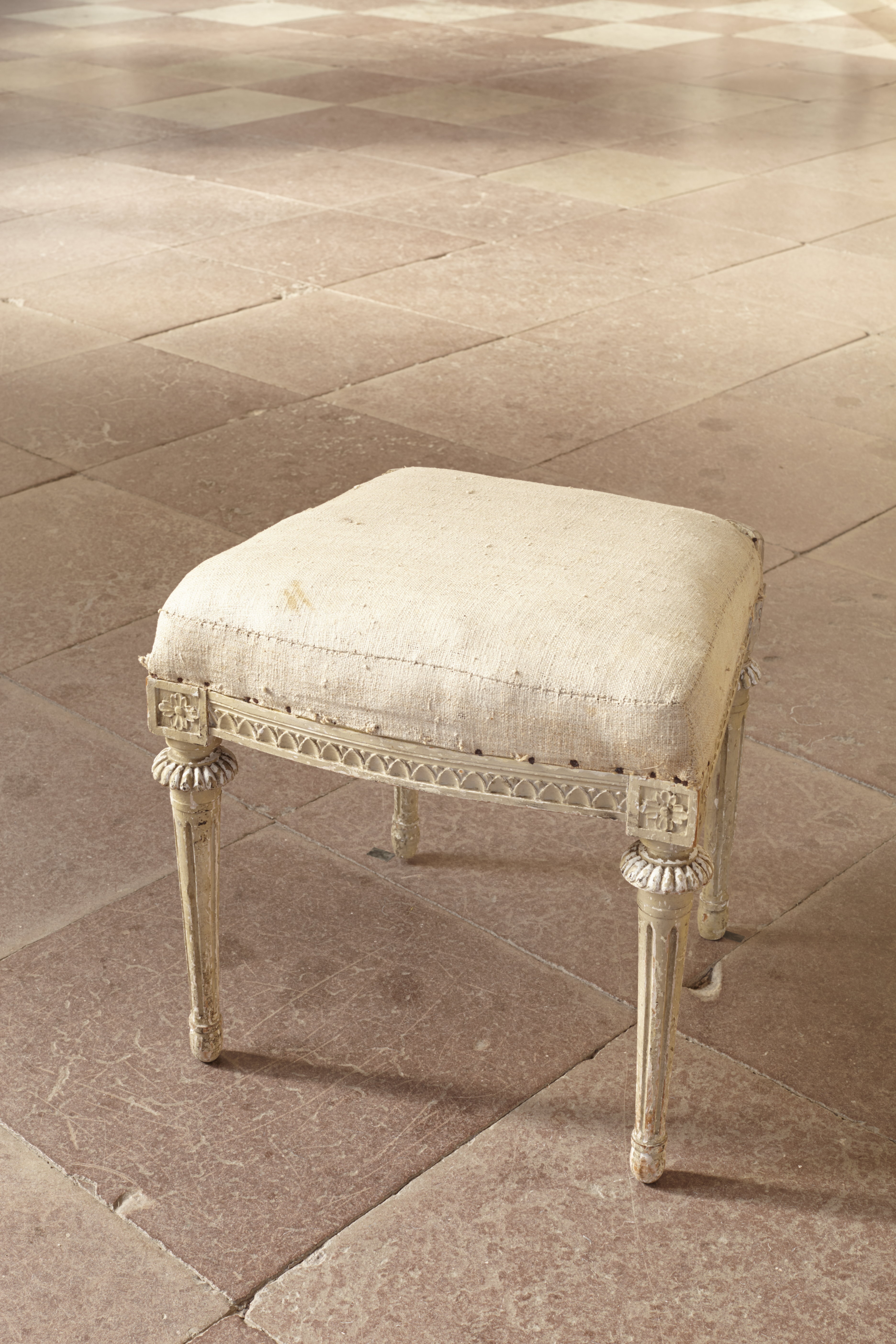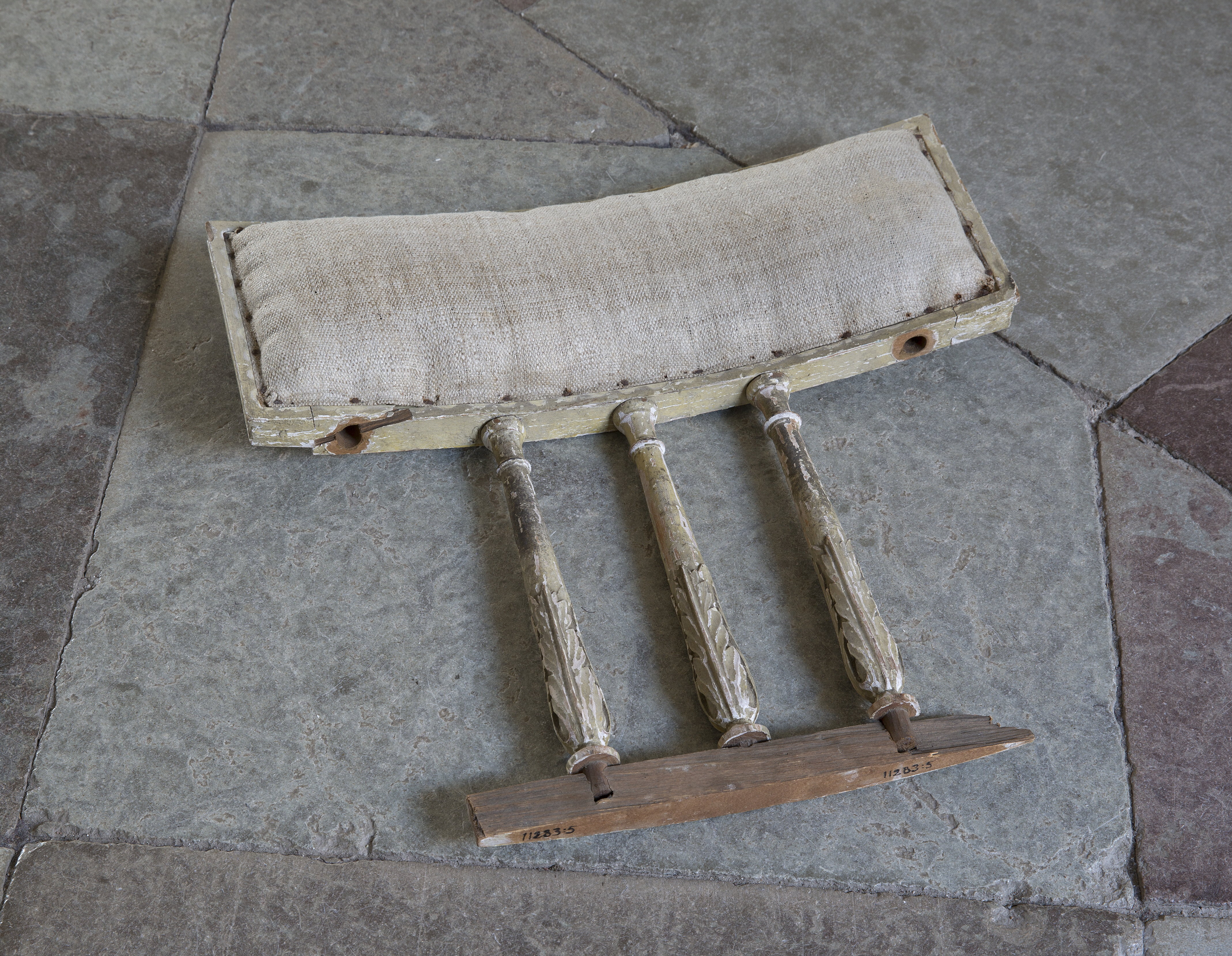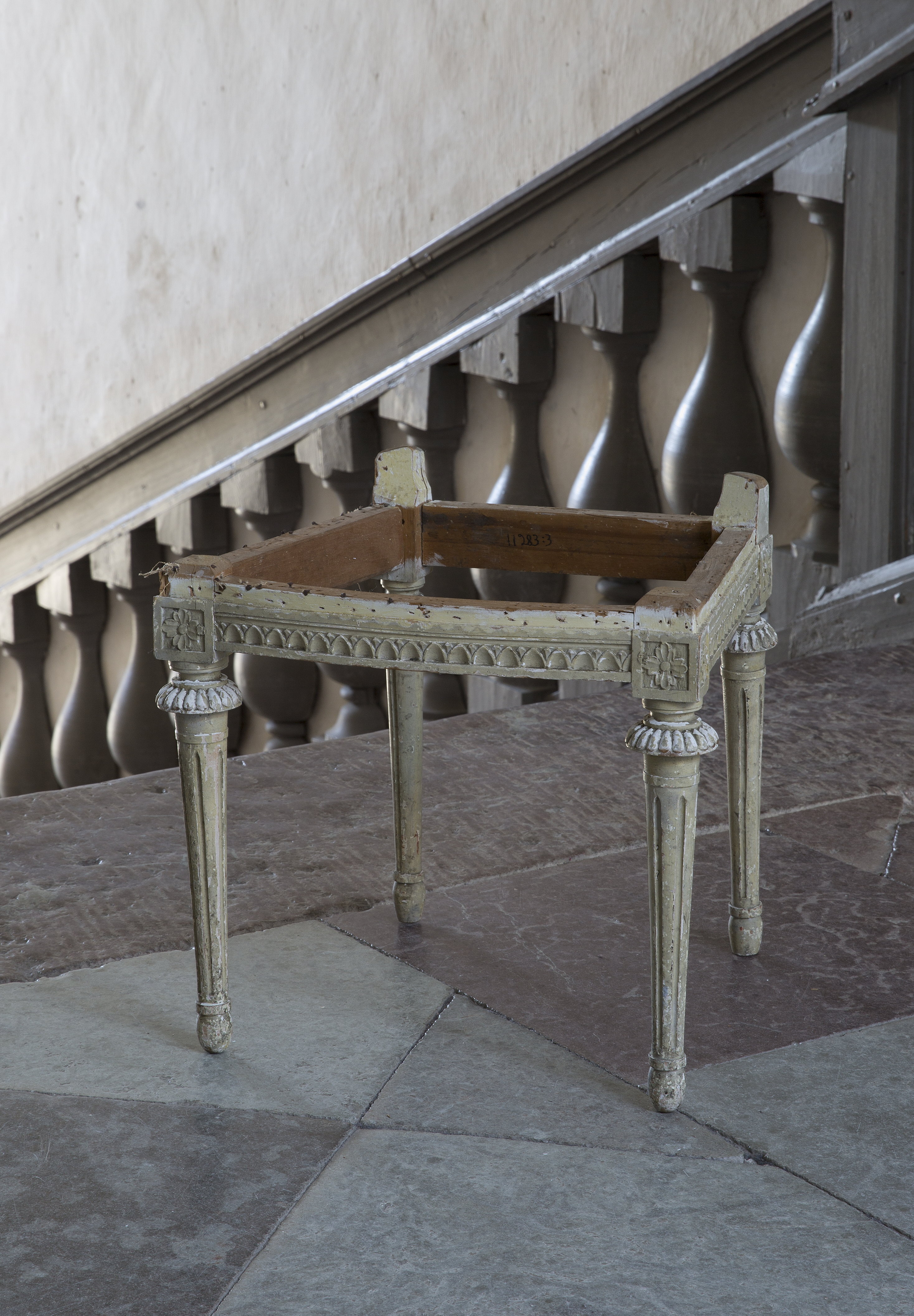 Svarvade ben med långsträckta kulfötter, kannelyrer och räfflad vulst, rosett på sargkvadranten och bladstav i sargen. Ryggarna avsågade.Ryggstolparna och tre pinnar, svarvade och med bladholkar, till rygg med svagt svängd stoppad ryggbricka bevarade, dessutom två ryggbrickor med tre pinnar och en trasig ryggbricka. Sitsarna har liksom ryggbrickorna endast undertyg och grått linne. På ryggsargen skuret: I, II och V. Stämplade: “ E S” Efraim Ståhl, Stockholm, 1794-1820.