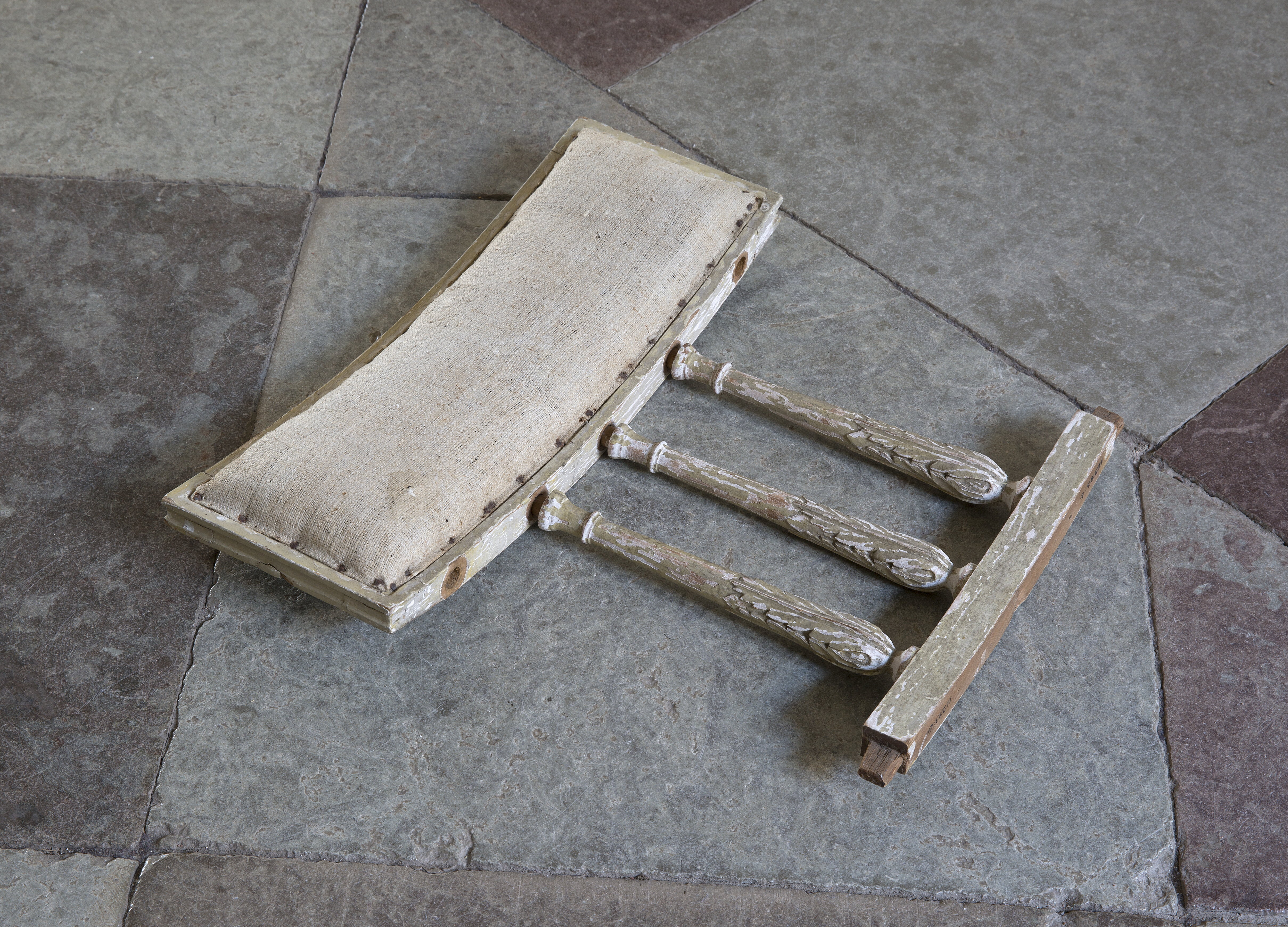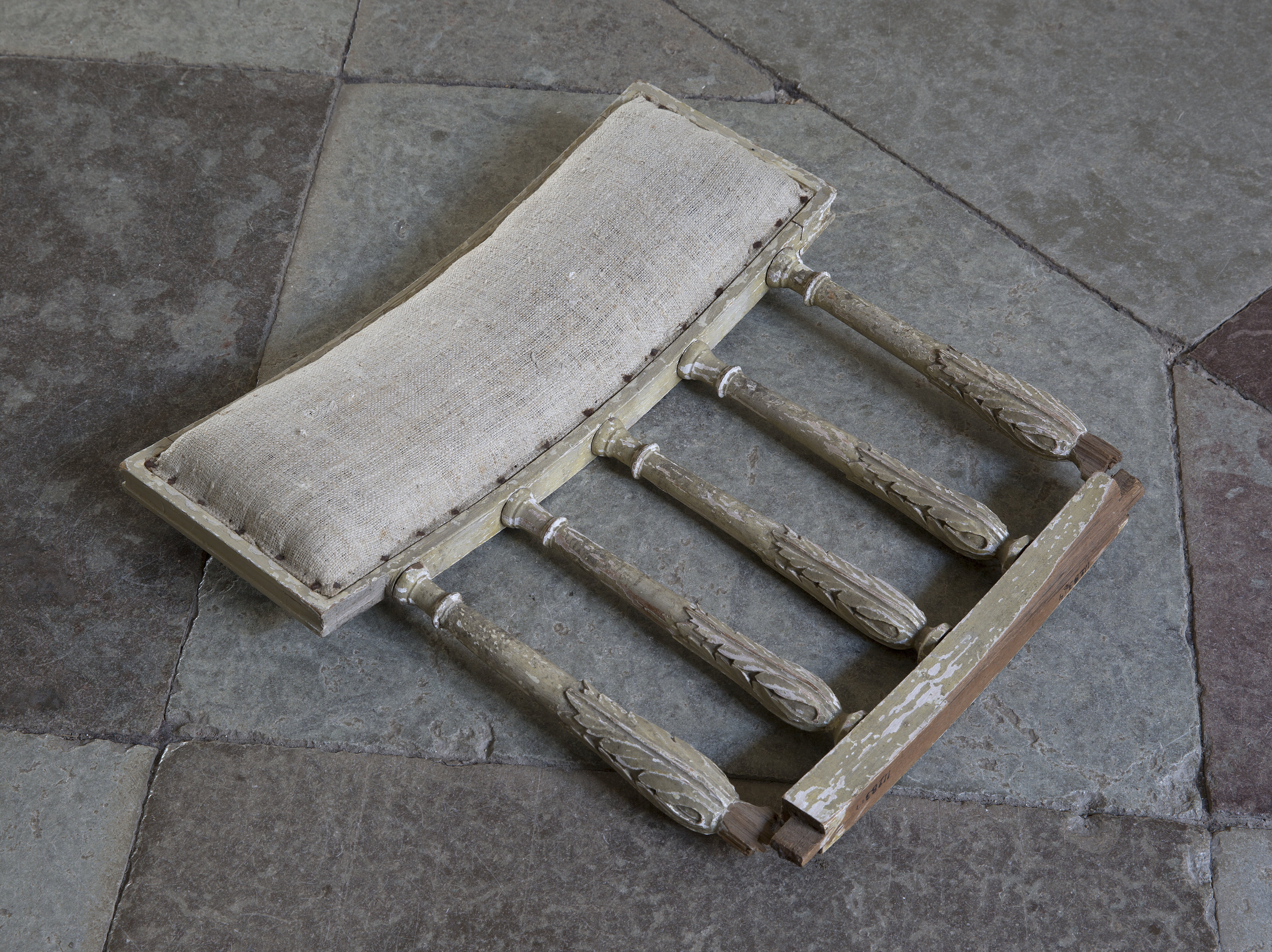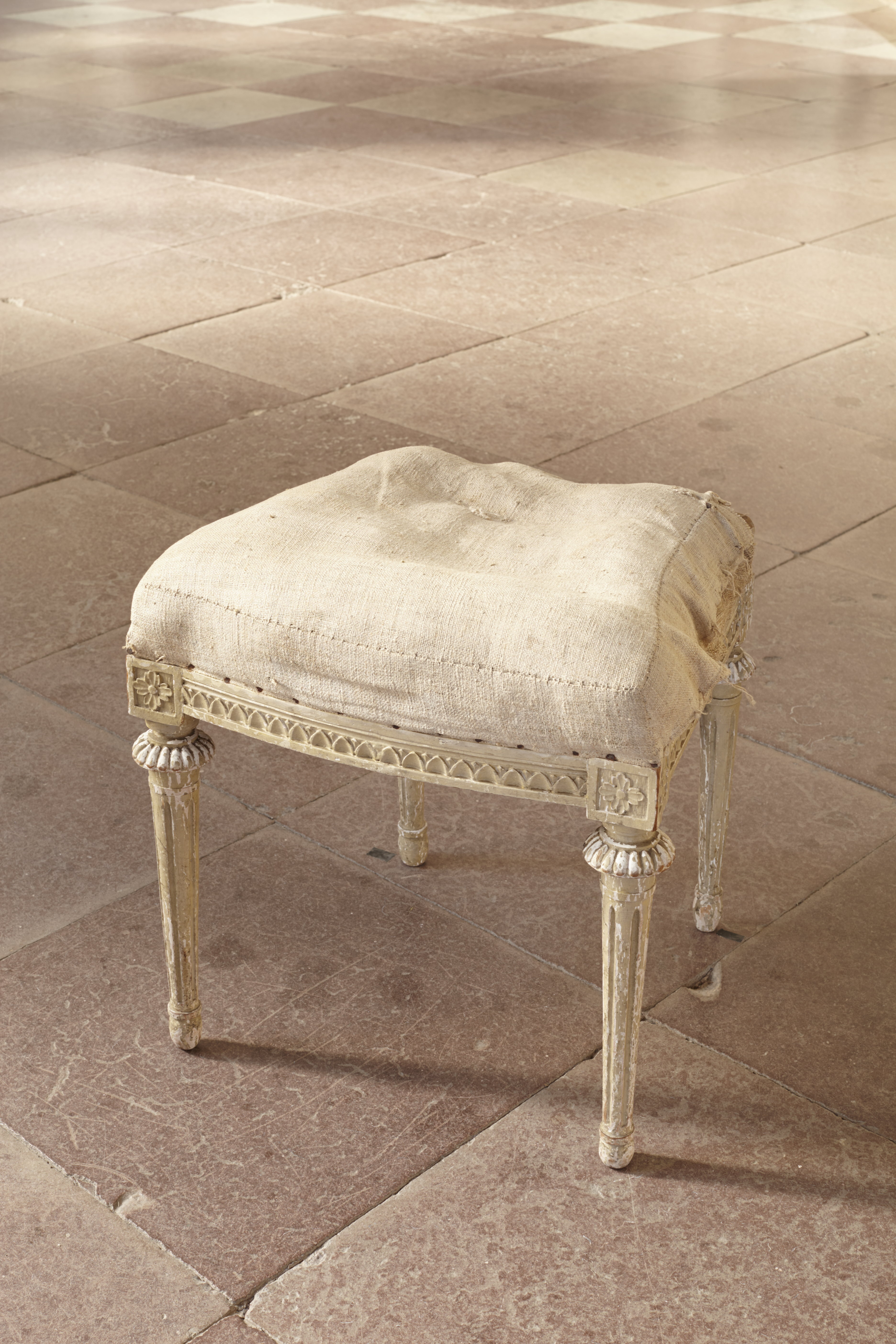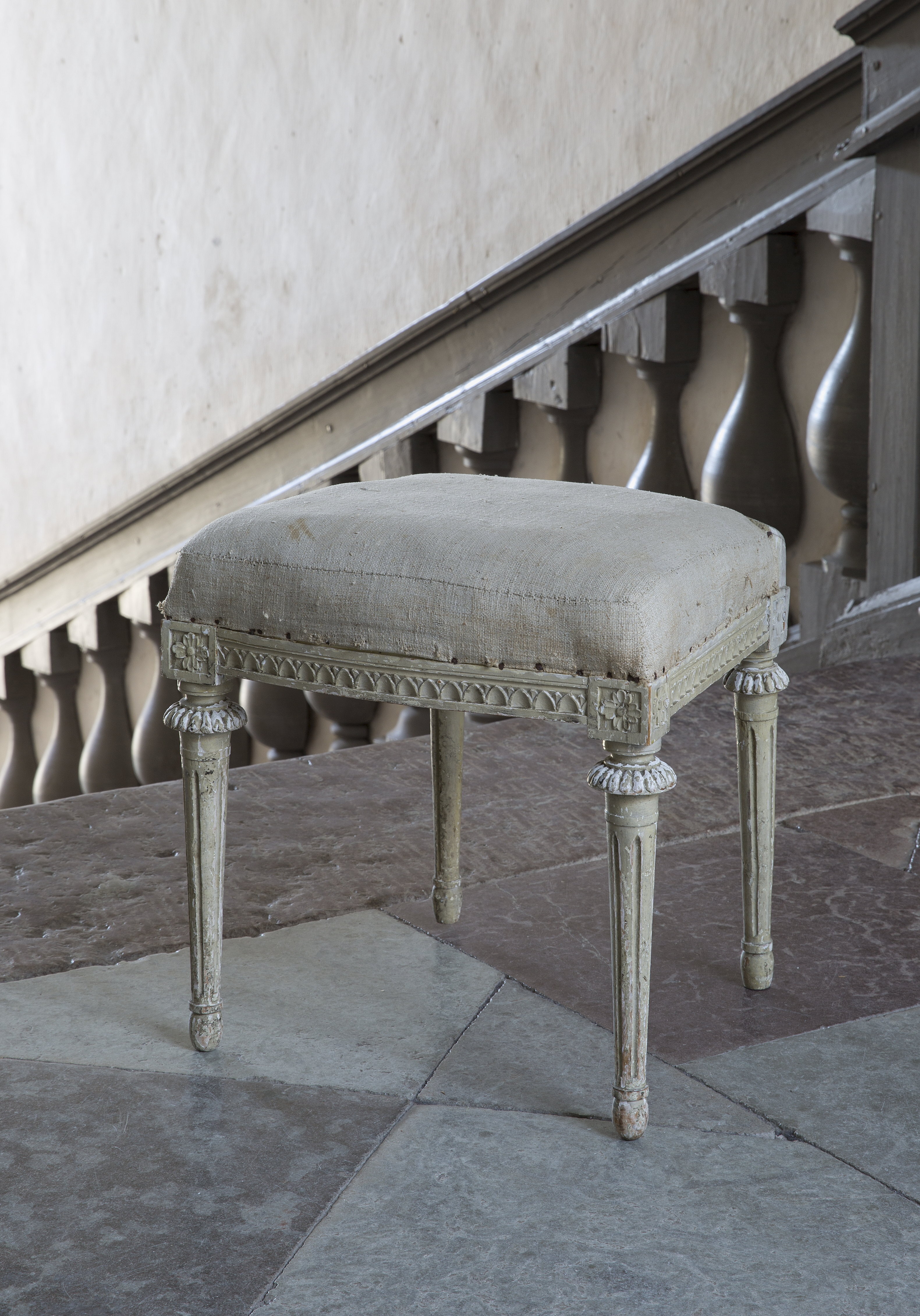 Svarvade ben med långsträckta kulfötter, kannelyrer och räfflad vulst, rosett på sargkvadranten och bladstav i sargen. Ryggarna avsågade.Ryggstolparna och tre pinnar, svarvade och med bladholkar, till rygg med svagt svängd stoppad ryggbricka bevarade, dessutom två ryggbrickor med tre pinnar och en trasig ryggbricka. Sitsarna har liksom ryggbrickorna endast undertyg och grått linne. På ryggsargen skuret: I, II och V. Stämplade: “ E S” Efraim Ståhl, Stockholm, 1794-1820.