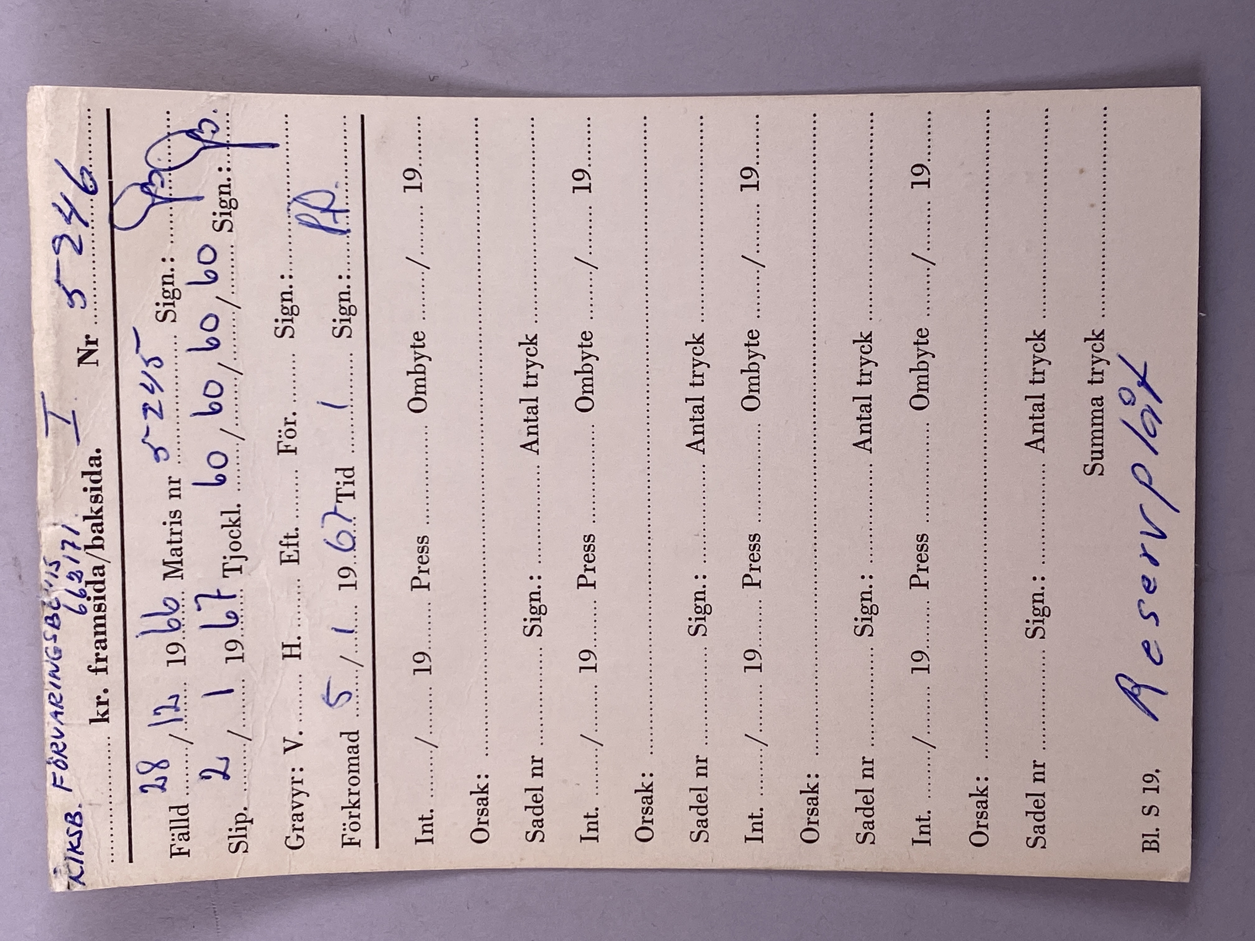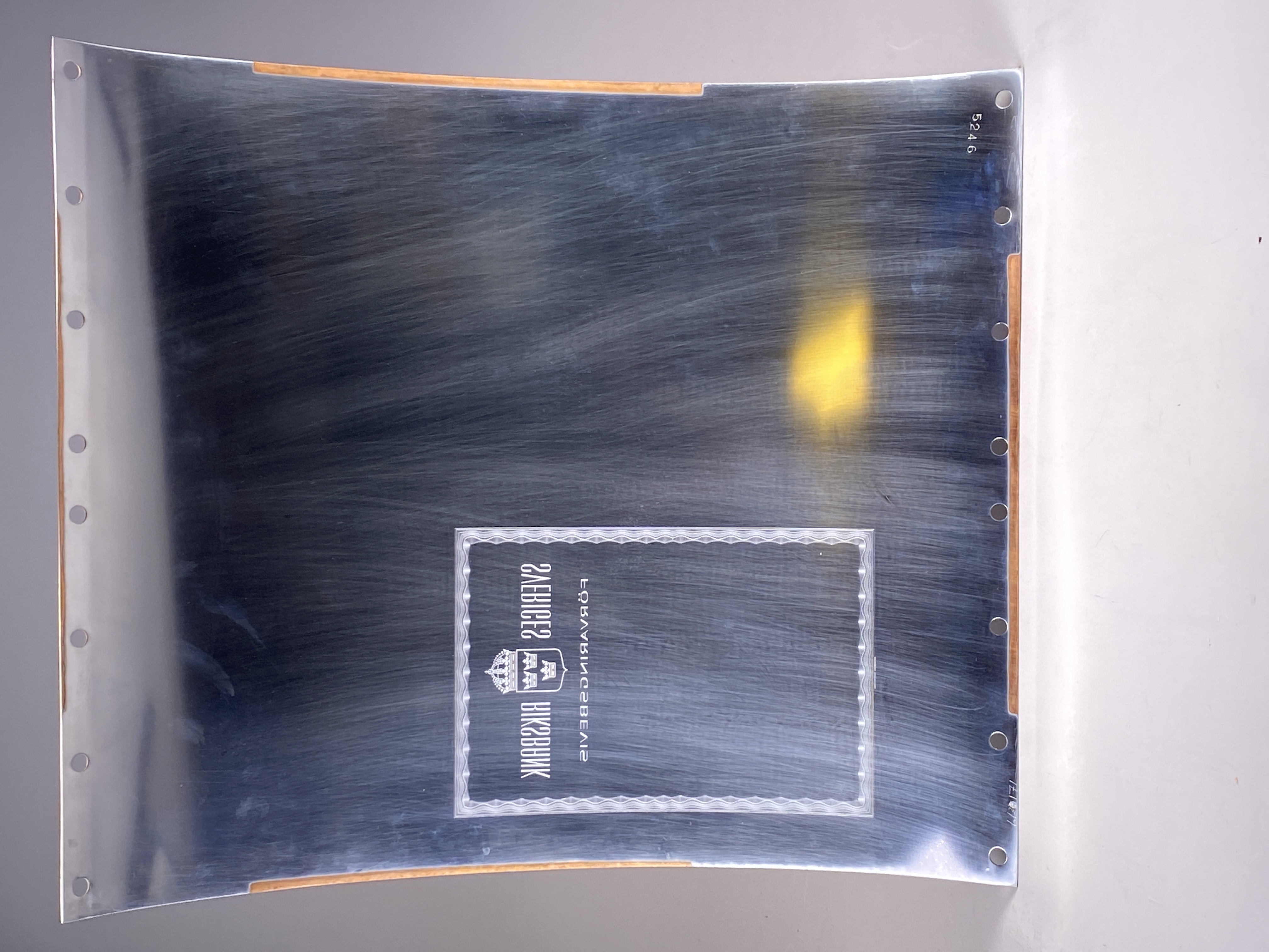 Tryckplåt för förvaringsbevis hos Riksbanken. Reservplåt. Med tillhörande kuvert. Rektangulär plåt tillverkad i rostfritt stål och koppar. Framsidan med gravyr föreställande ram med vågmönster. Innanför ramen gravyr av det krönta lilla riksvapnet samt inskriften: "SVERIGES RIKSBANK. FÖRVARINGSBEVIS". Plåten stämplad: "5246".