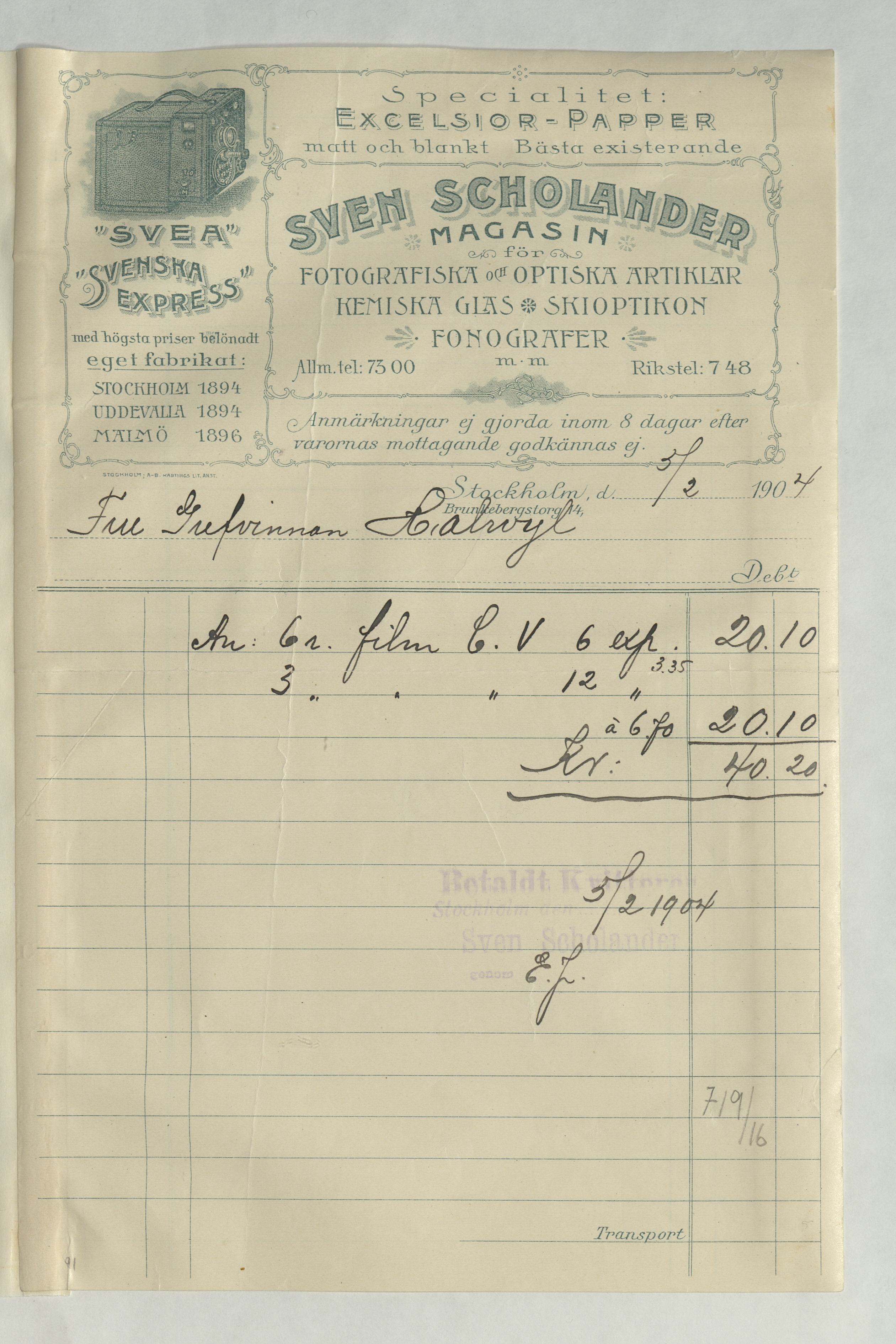 Kvitto från Sven Scholander, Bildhuggeriaffär för fotografiska artiklar till Grevinnan von Hallwyl. 40:20Kr betalt, Stockholm 5 februari 1904.