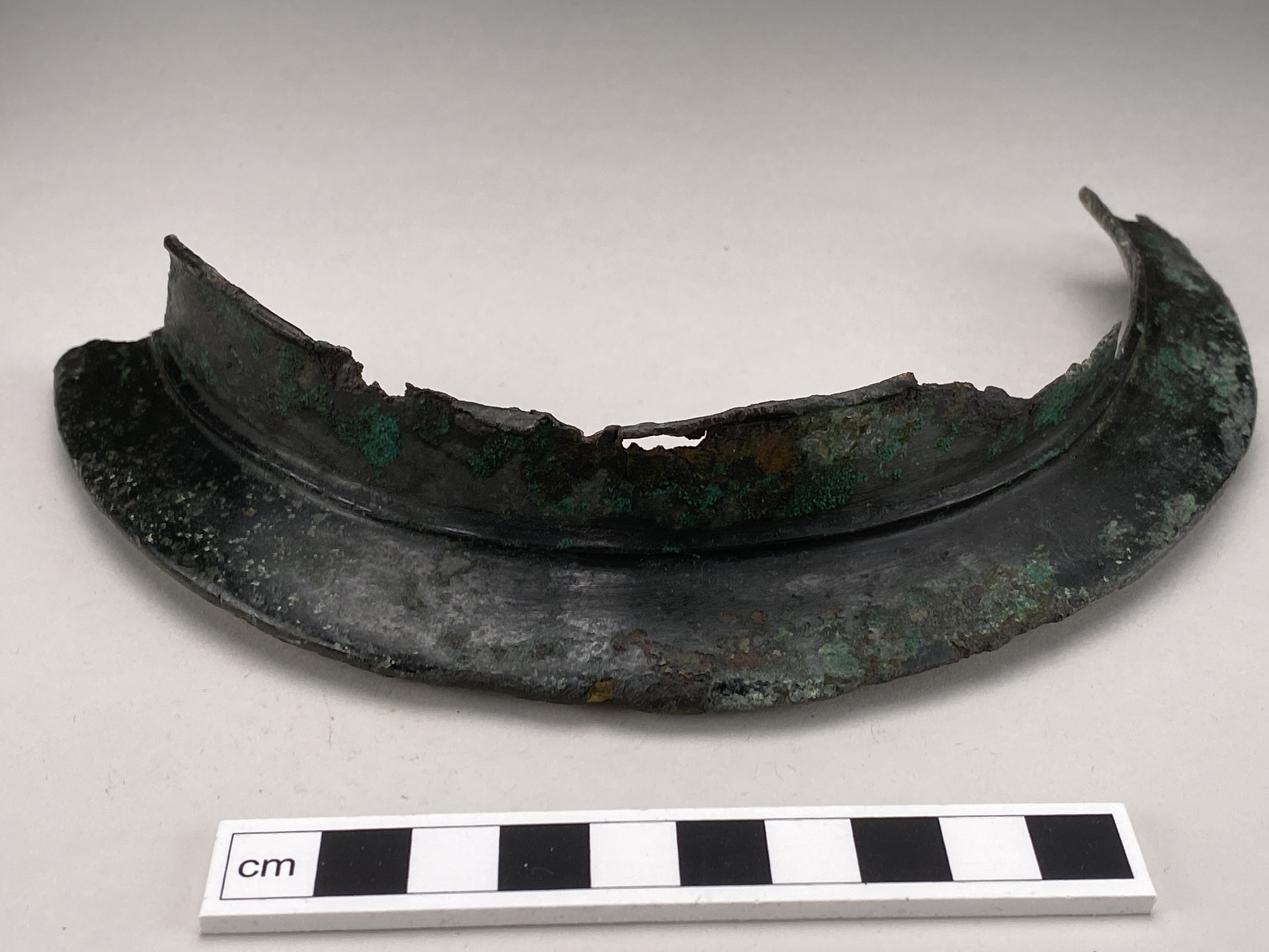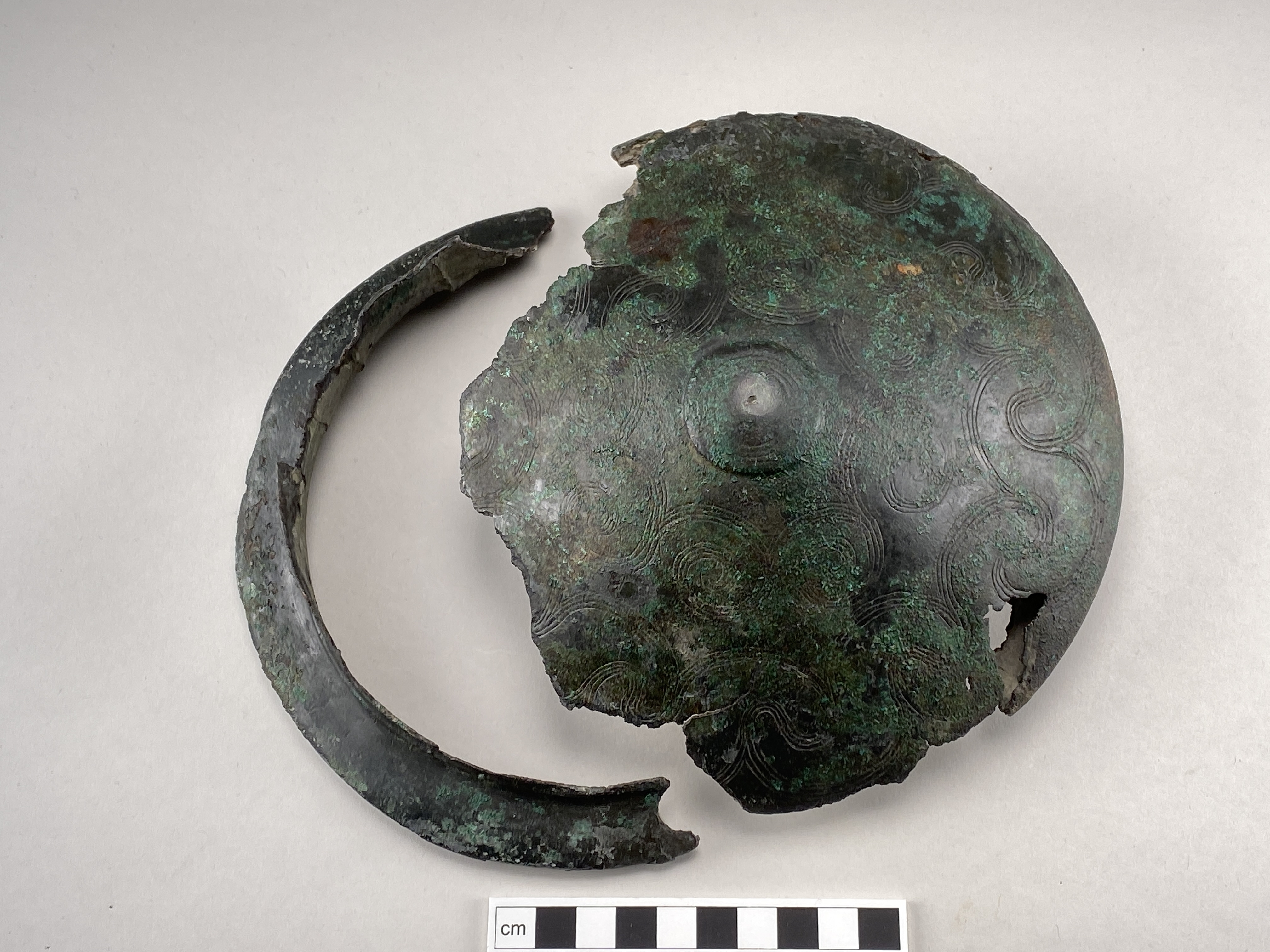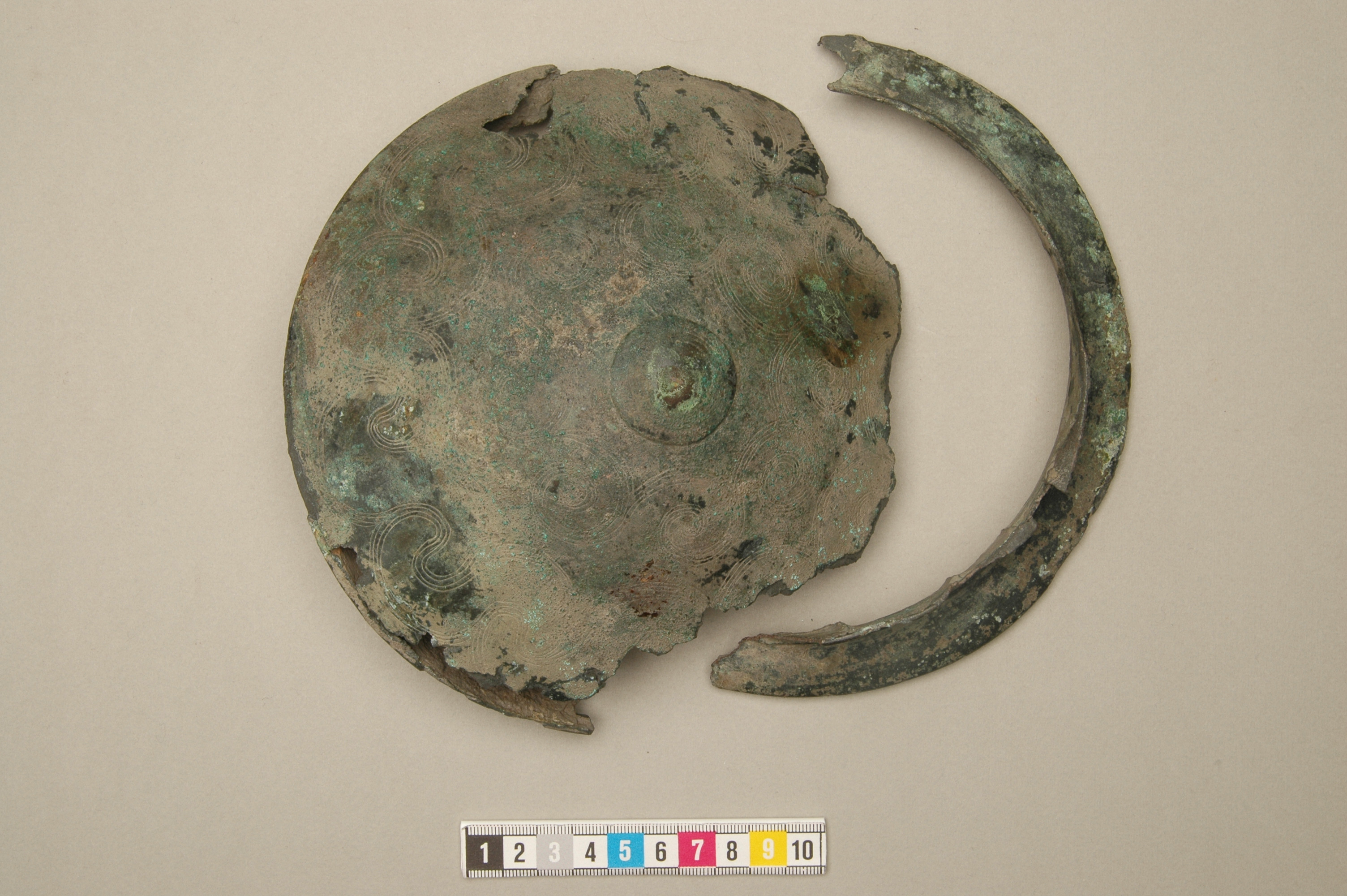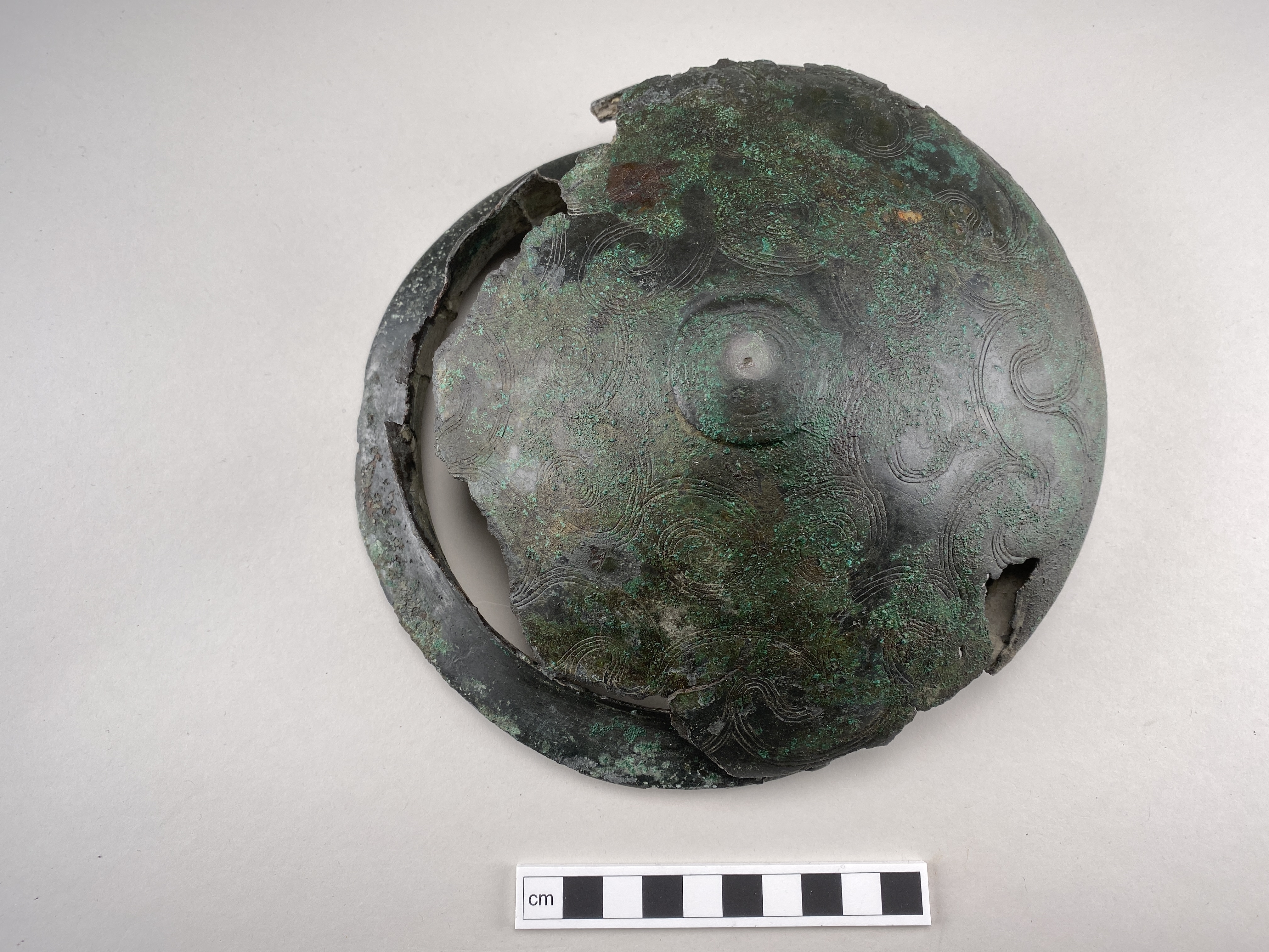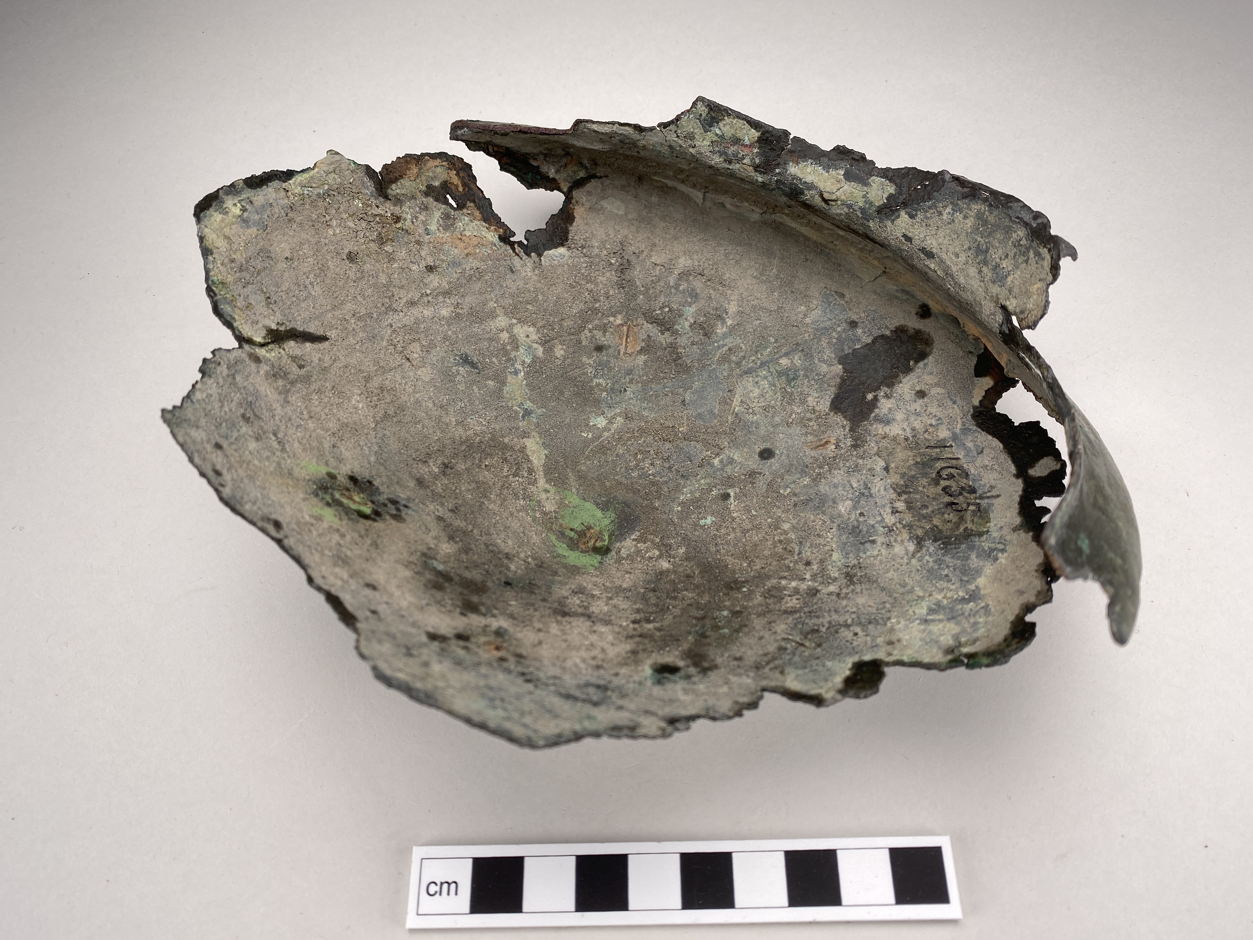 Bälteskål av brons. Skadad. På utsidans botten finns en låg knapp. Inpunsad ornering. Kärnstöd av järn. På innersidan i vinkeln mellan skuldran och kärlet sitter kvar rester efter kärnan.