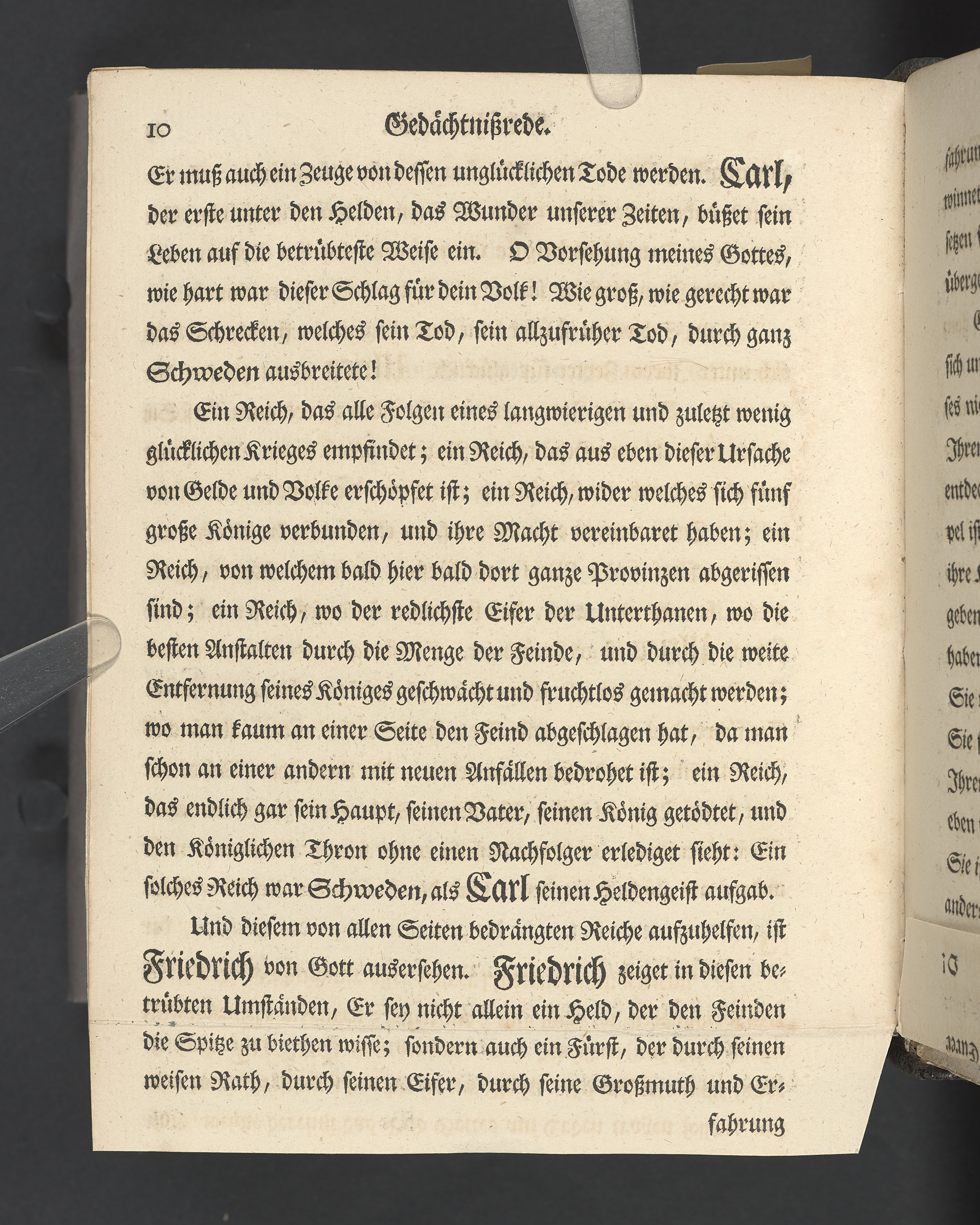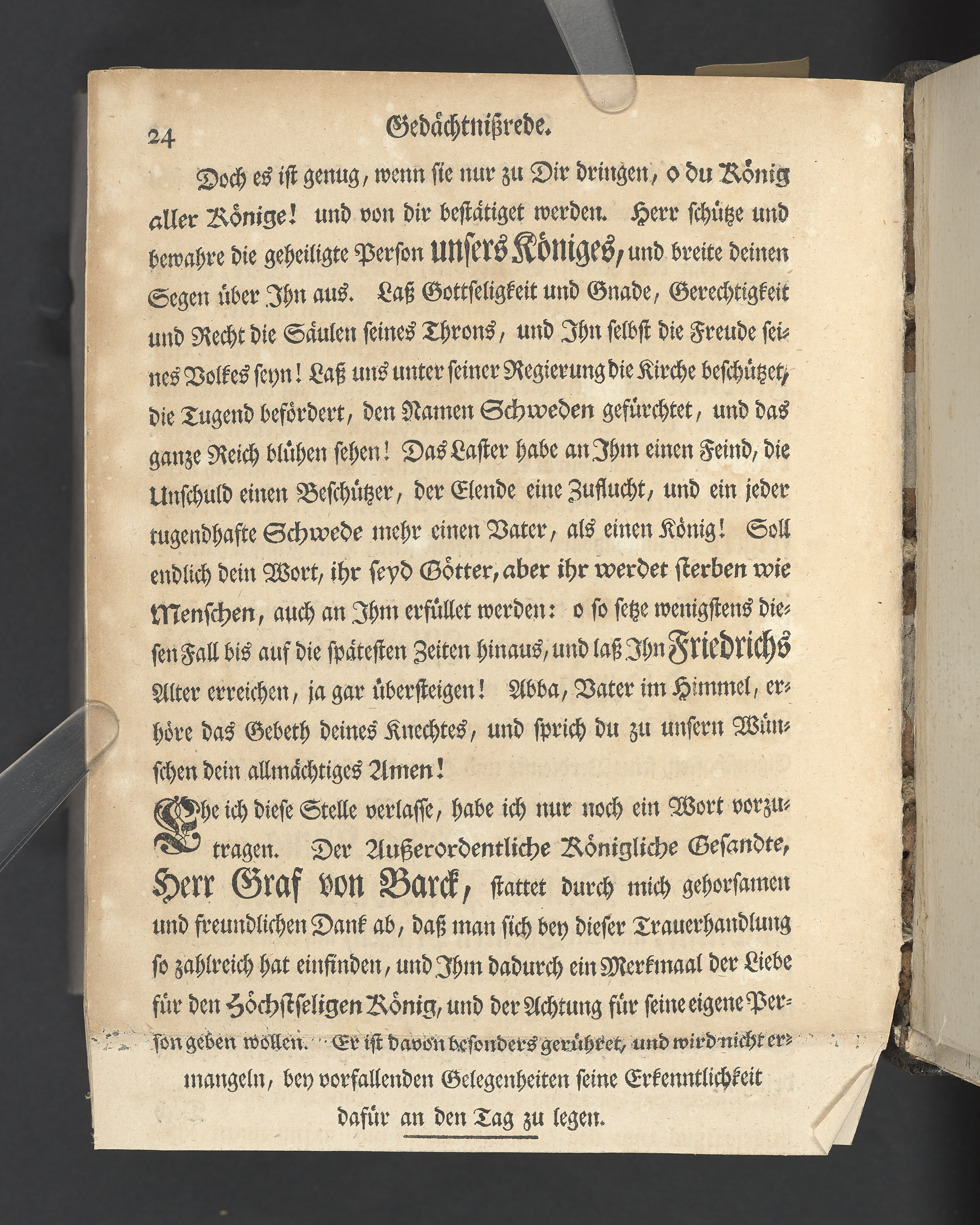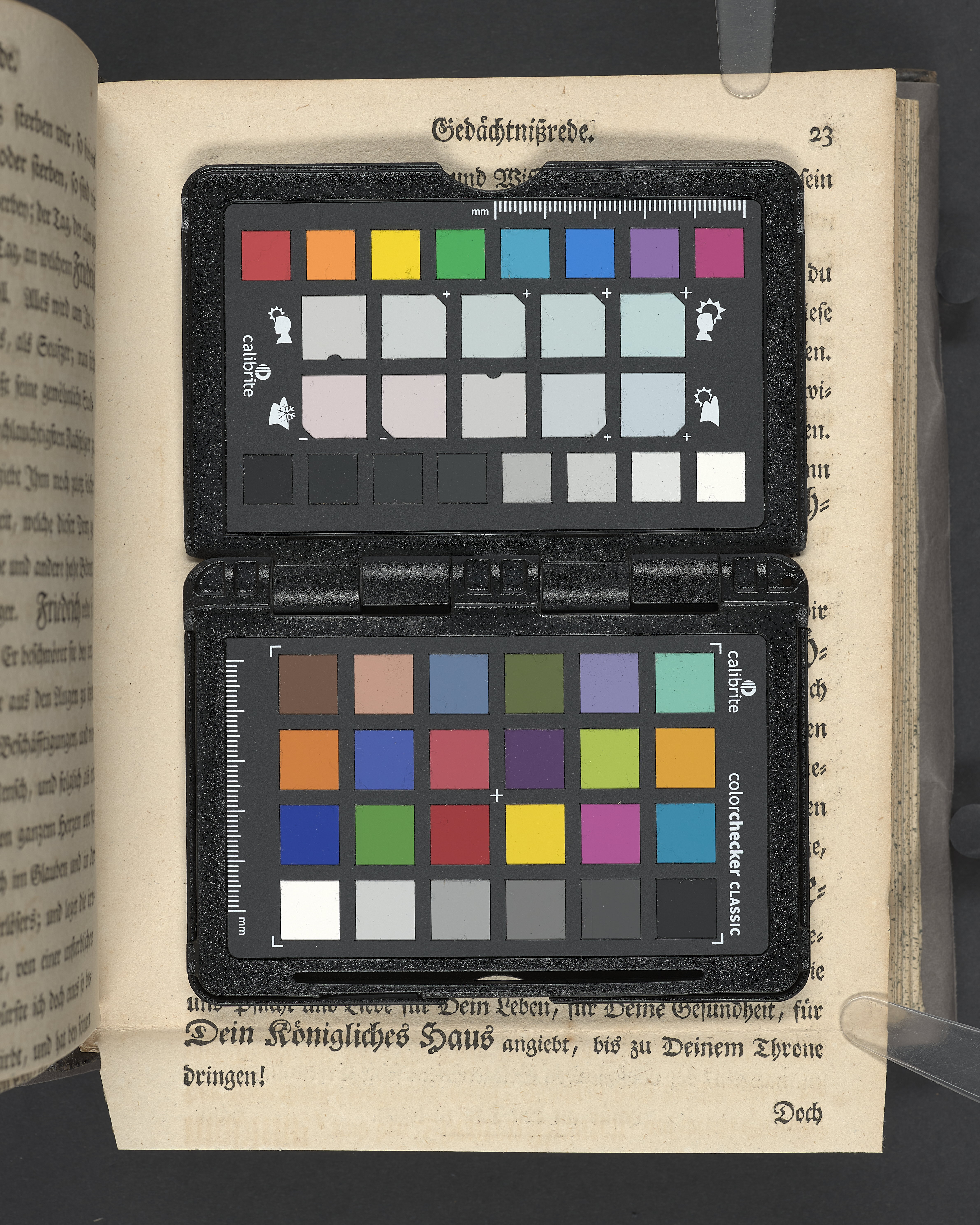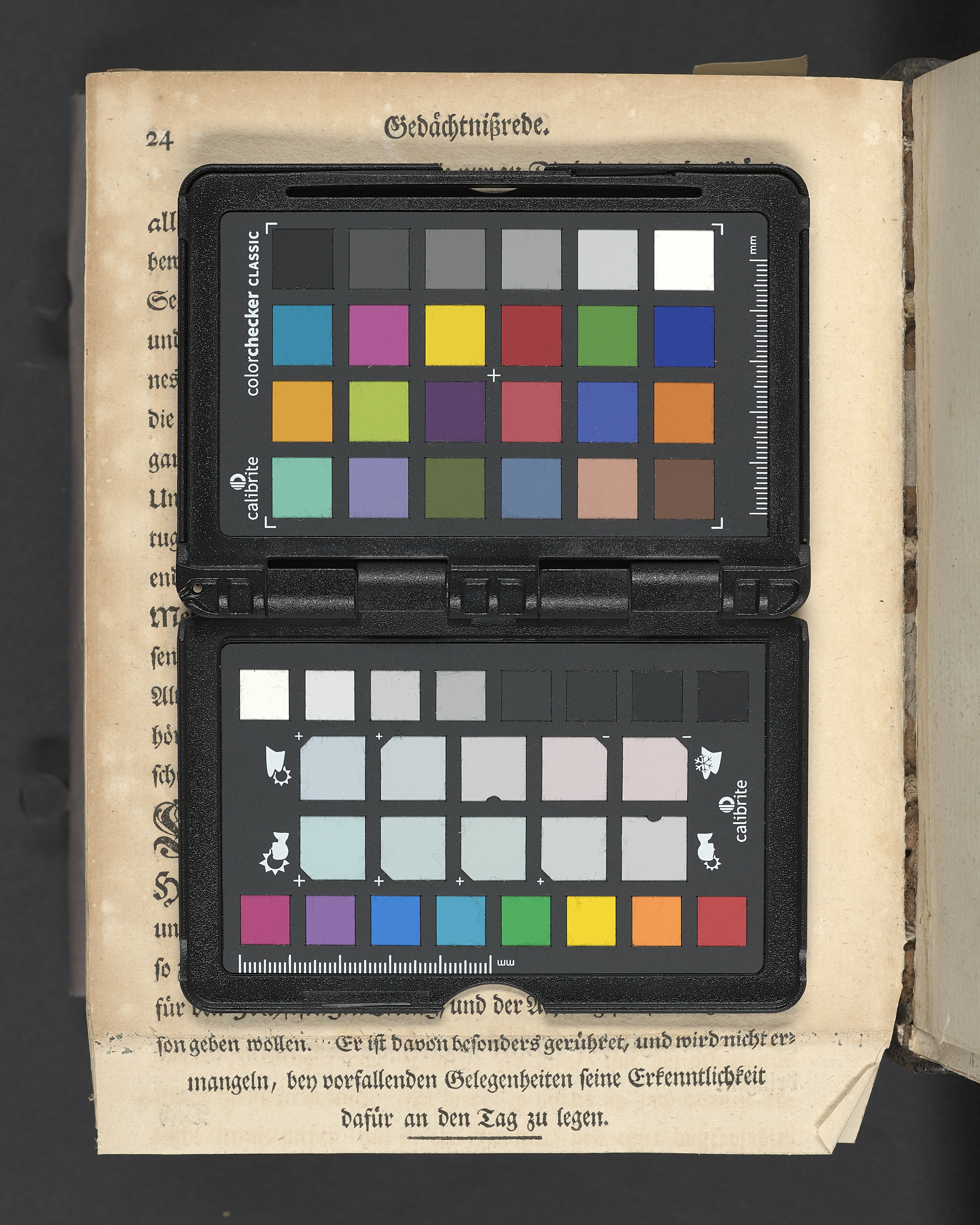 Samtliga blad har i nederkant vikts för att passa formatet i bandet. Snitt stänkta i rött och blått.