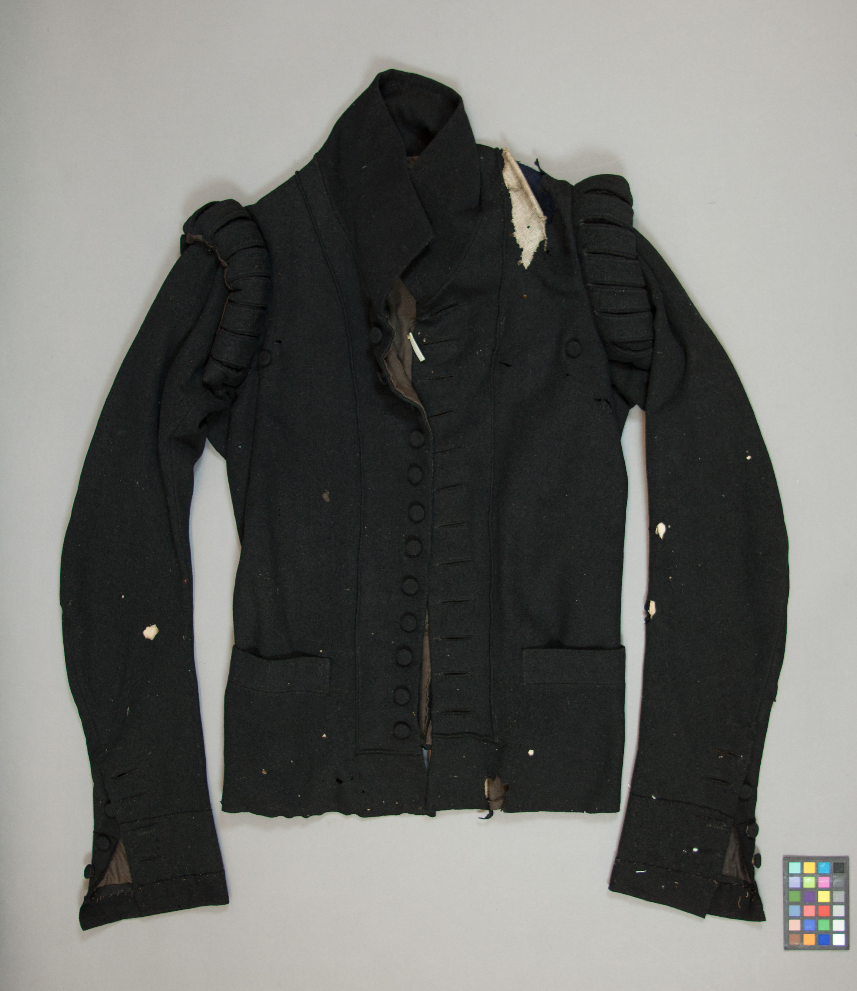 Tröjan är sydd i svart kläde, kroppen fodrad med mörkbrunt linne ärmarna är fodrade med ofärgat ljust linne. Modellen är rak framtill med avskuret ryggparti, vid ryggen är det påsytt en rynkad skört. Knäppning framtill med tolv svarta klädda knappar, knappslån är förstärkt och förtydligad med en underliggande smal tygremsa i samma svarta kläde. På vardera framsida sitter det nertill en ficka med påsytt horisontellt ficklock. Ståndkrage a 80 mm hög. Kraftiga axelklaffar med skurna "fingrar". På bröstet, i höjd med axelklaffarnas nederkant sitter det på vardera sida en knapp. I dessa fästes kappan. Armavsluten har påsydda dekorativa "band". På utsidan är det en sprund, denna knäpps med fyra klädda knappar.