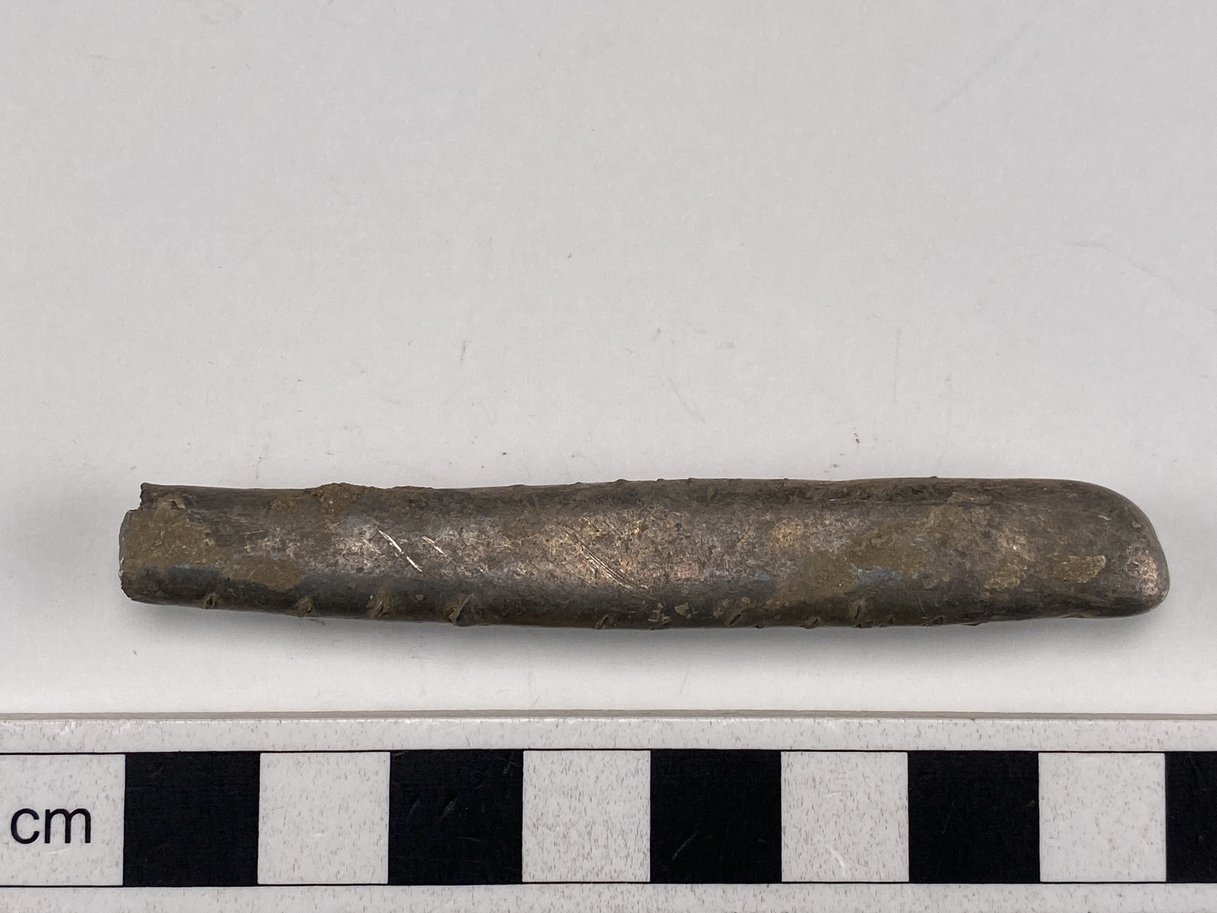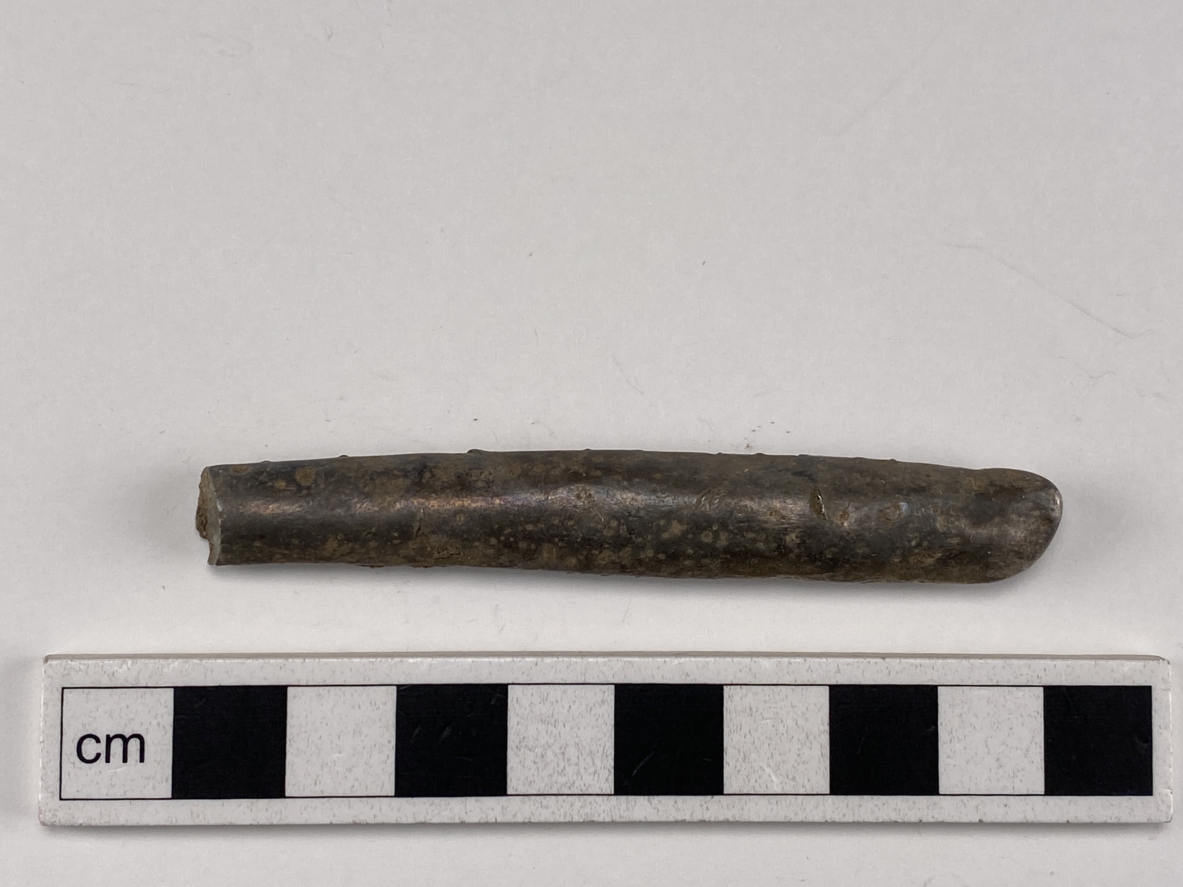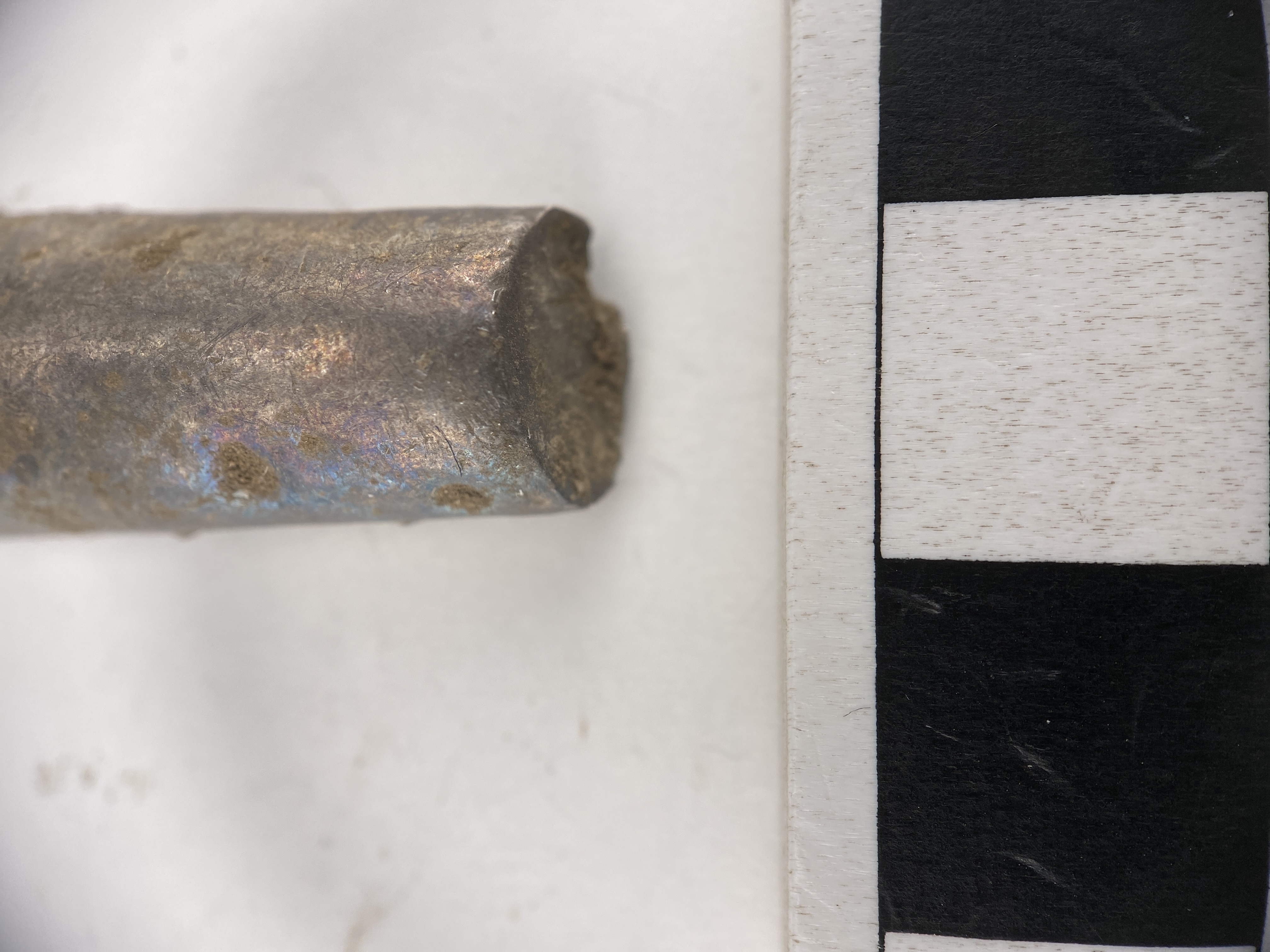 Stångformig barr. Rikligt med probermärken utmed sidorna.