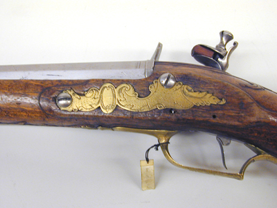 Rund, slätborrad pipa med åttsidig kammare, svarvad ring vid övergången. Pipan baktill profilerad på de tre övre faserna, skålad list, därframför en 2 mm bred sicksackbård, framtill åtföljd av en punktlinje. Baktill rundat, svagt böjt svansskruvblad med antydning till hak, enkel kantlinje samt graverat: "No 1" (?). På kammarens undersida stämplar: Jönköpings krönta ring samt AL ligatur. Riktmedel: Litet filat hak i listen på pipänden, spolformigt korn av silver. Fästning: Två häften. Pipan fäst med krysskruv uppifrån, bakre låskruven i hak i svansskruvplattan samt två ej ursprungliga pipstift av stål. Flintlås med plant låsbleck, brett fasade kanter, graverad dekor, kantlist med omväxlande T o punkter, blad på bakspetsen, framför hanen i stålsnitt mot mörkskrafferad bakgrund: "JÖNKJÖPING". S-formig platt hane med fasade kanter, bladdekor mot mörkskrafferad bakgrund. Runda käkar, överkäken lös, s-formigt svängd hangren, käkskruv med päronformigt huvud. Fasetterad fängpanna med skålad fals. Batteri med balusterformigt åsad eldstålsrygg, kommaformig häl, batterifjäder med fasade kanter, treflikigt fjäderlöv. Fästning: Två låsskruvar. Avtryckare svagt s-formigt svängd med rundad framsida, avtryckarbleck av stål med antydan till hak. Helstock av valnöt med enkelt skurna lister, vid svansskruvbladet ett liljeformigt blad. Näsband av horn, övriga beslag av mässing med graverad dekor. Kolvkappa med långa flikar, oval centrumplatta med ett graverat bakåtseende upprest lejon med dubbel svans, på kappans sidor trofégrupper med två kanonrör, spjut och två fanor. Konturerat sidbleck i rokoko med oval kartusch mellan skruvarna, bladdekor. Två kantiga rörkor. Varbygel med fasade kanter, närmast omvänt c-formig bakre stolpe, främre arm avslutad med urna och flikigt blad, graverat nr 2. Bakre arm med slätt, rundad ändblad. På bygeln graverad trofegrupp liknande den på kolvkappan. Tillbehör: Laddstock, l: 289 mm, framtill skodd med horn, l: 16 mm.