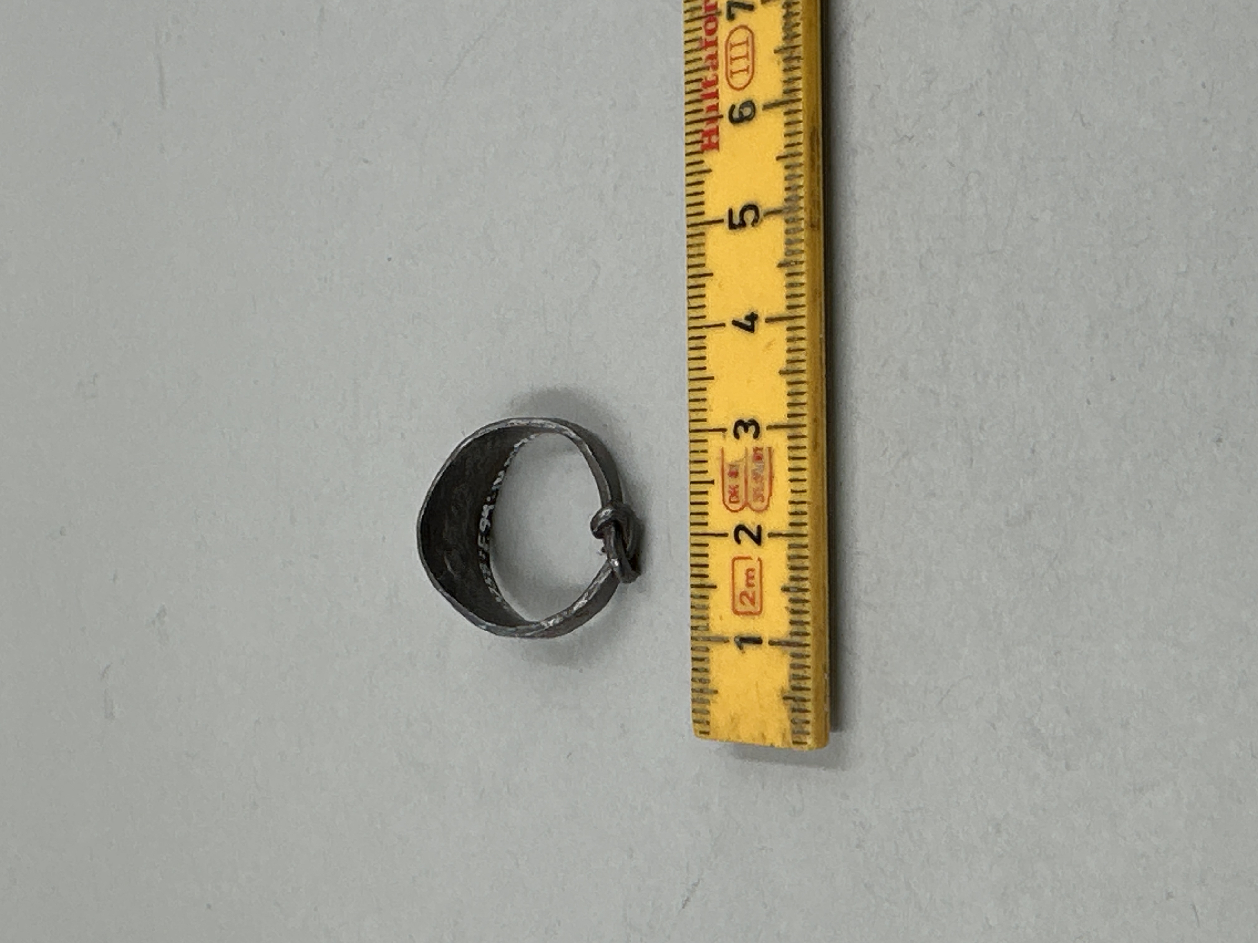 Bandformad med utvidgad mitt och avsmalnande ändar som snotts om varandra. Stämpelornerad med trianglar som bildar två zig-zag-band längs med en mittgående linje. Något skadat ytskikt.