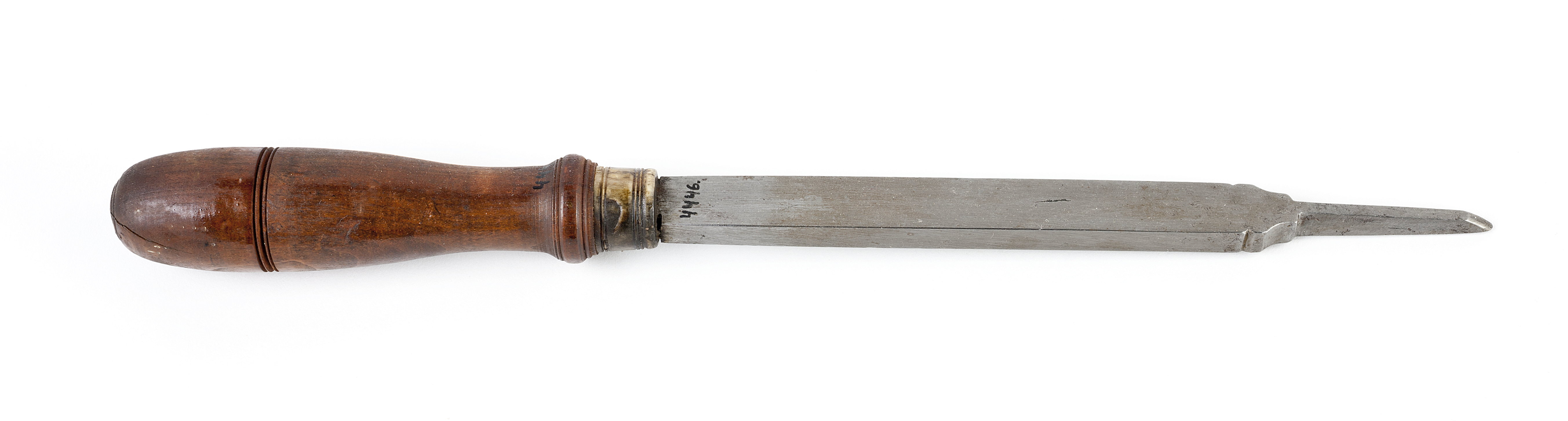 Klinga med rektangulär genomskärning, via profilering på två sidor övergående i smal ände. Rund egg. Stämplat på klingan: oxenstiernska vapnet. Svarvat skaft av päronträ, med en vulst nedtill. Hornring.
