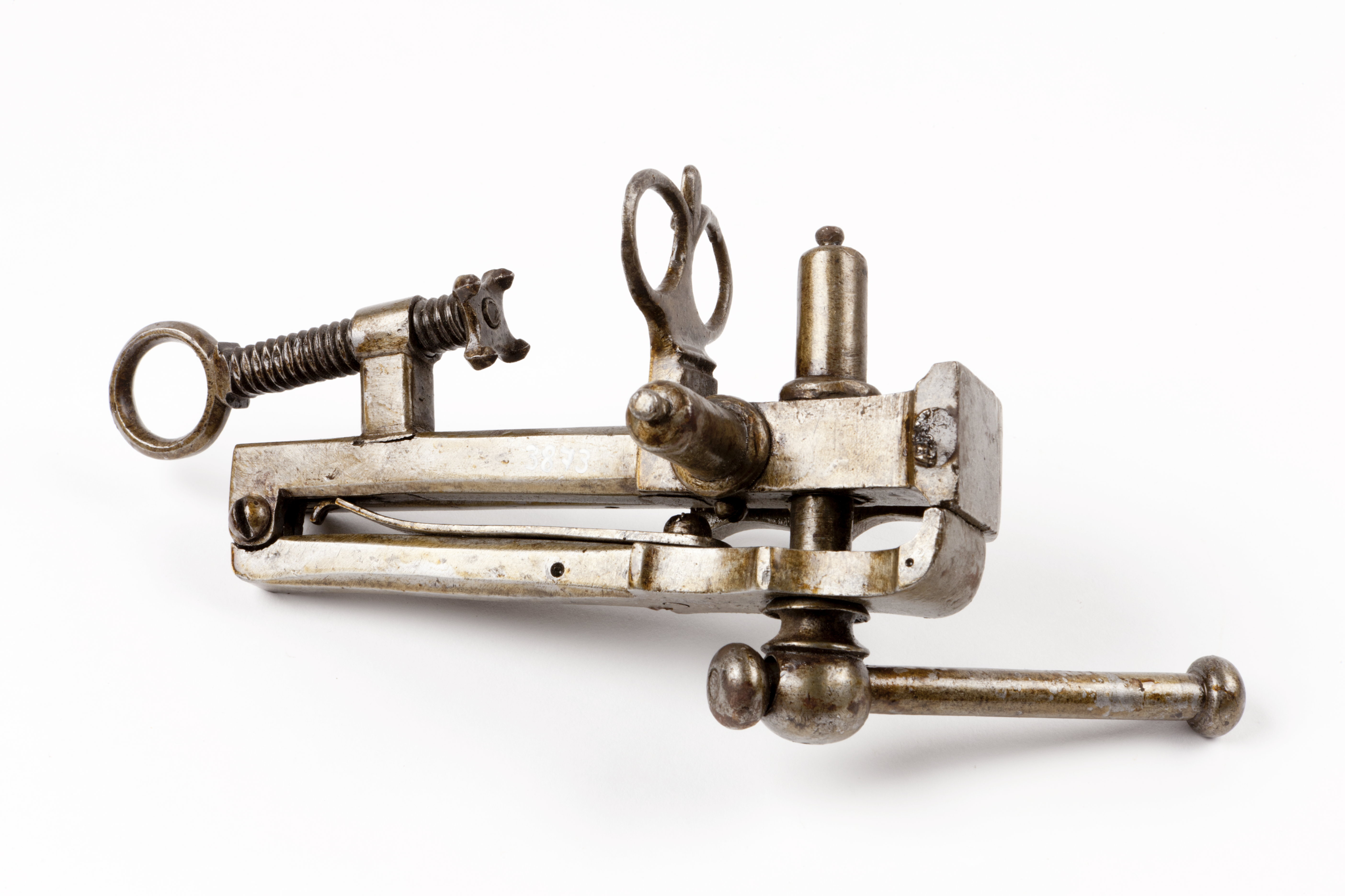 Två konturerade backar kring kvadratisk platta, vardera med skruv och fjäder. Ena skruven sönder, svängel endast på den hela skruven. Skruvtving för fastsättning i bänk.
