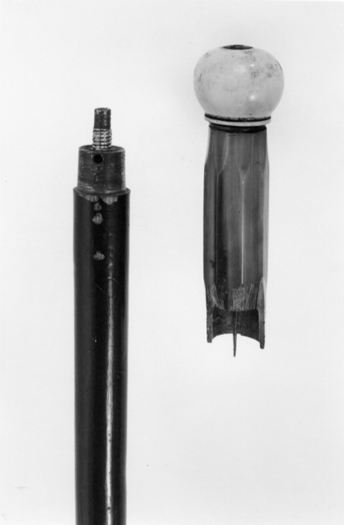 Rund pipa av stål, instucken i rör av svartlackerat trä. I övre änden en del av pipan utstickande ur träröret. Därpå en gängad tapp. Mekanismen ofullständig. På pipans gängad tapp är tändnålsmekanismen fastskruvad. Mekanismen är anbringad inuti ett handtag av flammigt horn. Upptill en rund, svarvad knopp av gulnat ben med på ovansidan en rund fästbricka av mässing, i brickans mitt gåren ståltapp upp, flankerad av två mittemot varandra placerade små hål. Knoppen är fjäderbelastad och utdragbar, varvid tändnålsmekanisnen spänns, avtryck sker möjligen genom att knoppen vrids. Hornkaveln skadad vid gängningen, ett stycke saknas. På motsatt sida ett hål in till en ståltunga invid tändnålsmekanismen, i tungan ett gängat hål, motsvarande kavelns (för avtryckare?). Tungan förefaller att påverkas när mekanismen spänns. På pipans andra ände är ett gängat mässingsrör fäst. I gängan är en doppsko av ben med mässingssko inskruvad.