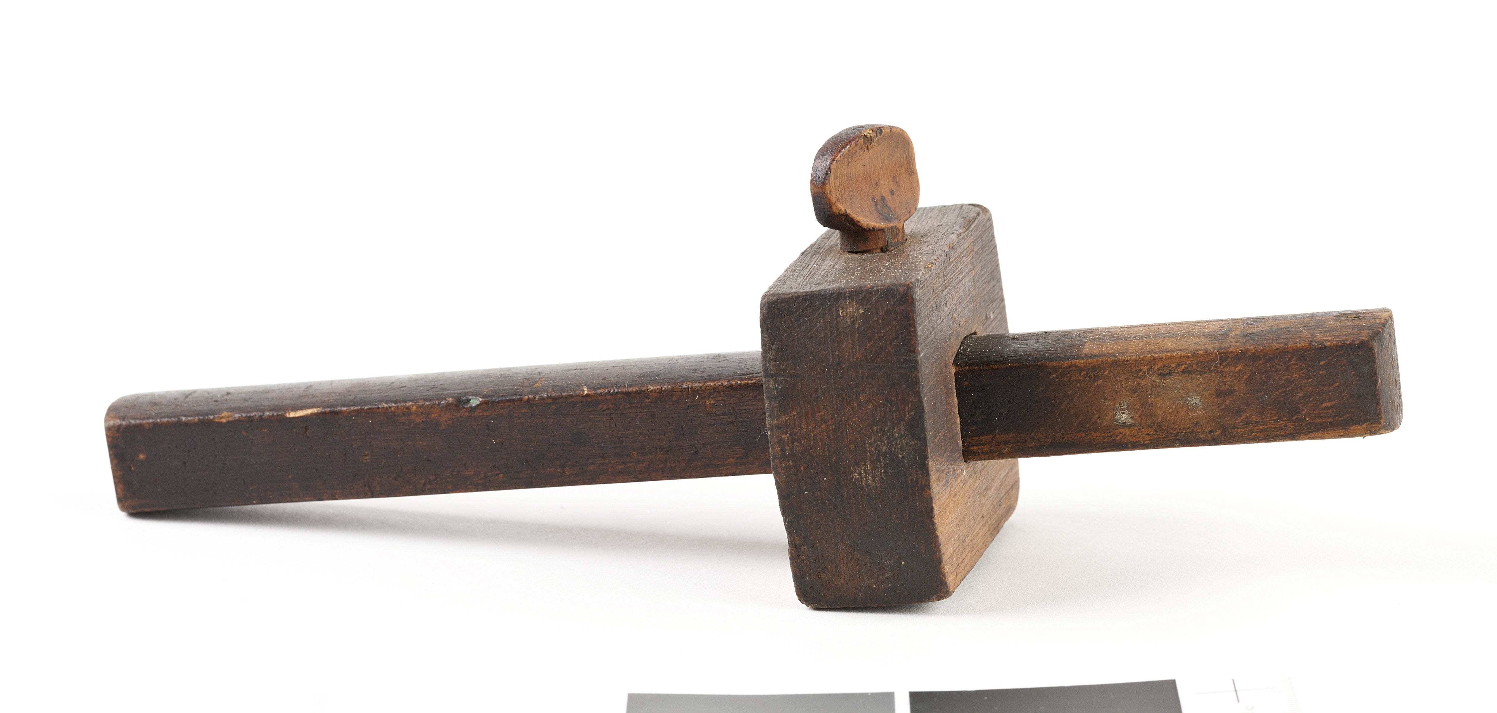 Stång av bok med stålstift. Kvadratisk kloss med skruv, björk.