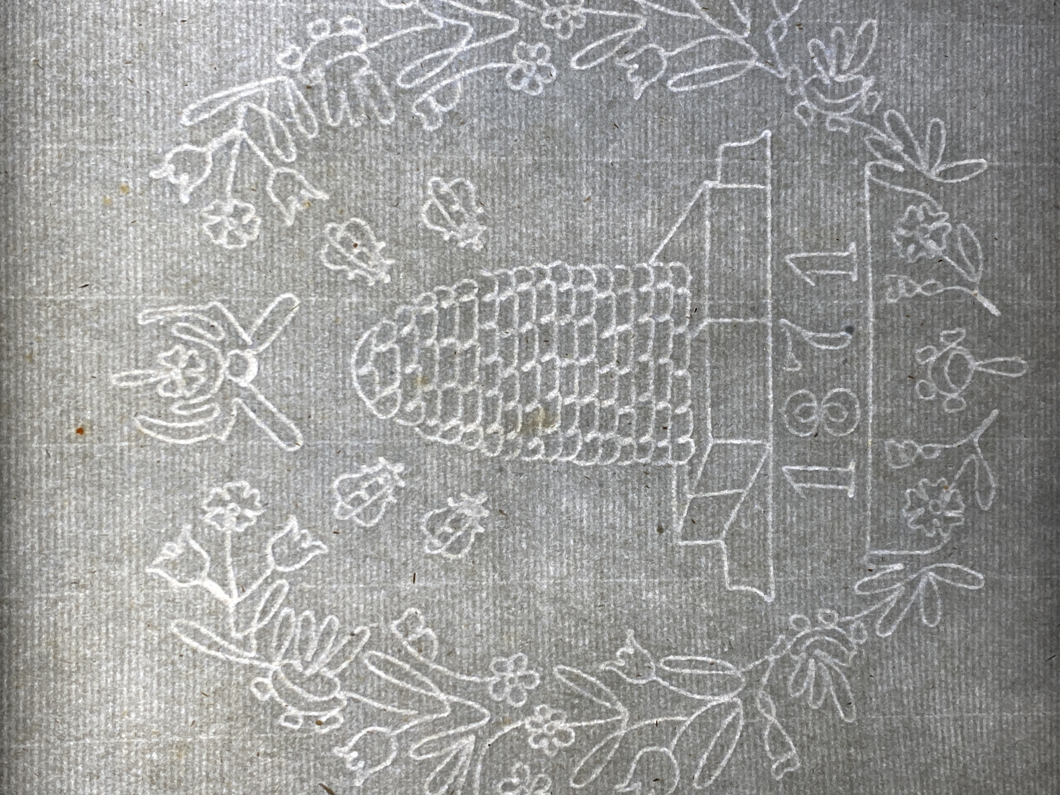 Handgjort papper, en bunt på 6 stycken ark. Alla med vattenmärke föreställande en bikupa omgiven av blommor samt texten "Tumba / 1871". Gula missfärgningar längst kanterna. Pappersbunten förvaras i originalkartongen numrerad 8 (se fält "Relationer till andra objekt").