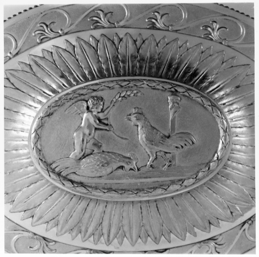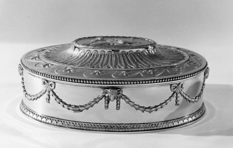 Oval ask med lodräta väggar. Pålödd dekor i form av 4 gumshuvuden och 4 bandrosetter placeradeväxelvis och med bladfestoner emellan. Runt bottnen bladstav. Ornamenten, liksom locket, är gjutnaoch cicelerade. Ovalt lock fäst vid askens ena långsida med ett 80 mm långt gångjärn. Ovalt förhöjt mittparti medlagerkransomsluten reliefscen: en liggande och en stående tupp, en putto med kvist i handen, samt pelare med skäggig mansbyst på. Runtom koncentriska friser: Bladstav, löpande hund och ytterstpärlstav. Asken är av förgyllt silver med blanka och matta partier kontrasterande mot varandra. I bottnen ärristat "115 1/2" (avser lod) och 4 stämplar inslagna i rad: 1) Smith och Sharps fyrpassformadestämpel med DS. RS., 2) Londons krönta leopardhuvud, 3) Londons lejon, 4) årsbokstaven b (1777).Samma stämplar på lockets undersida.