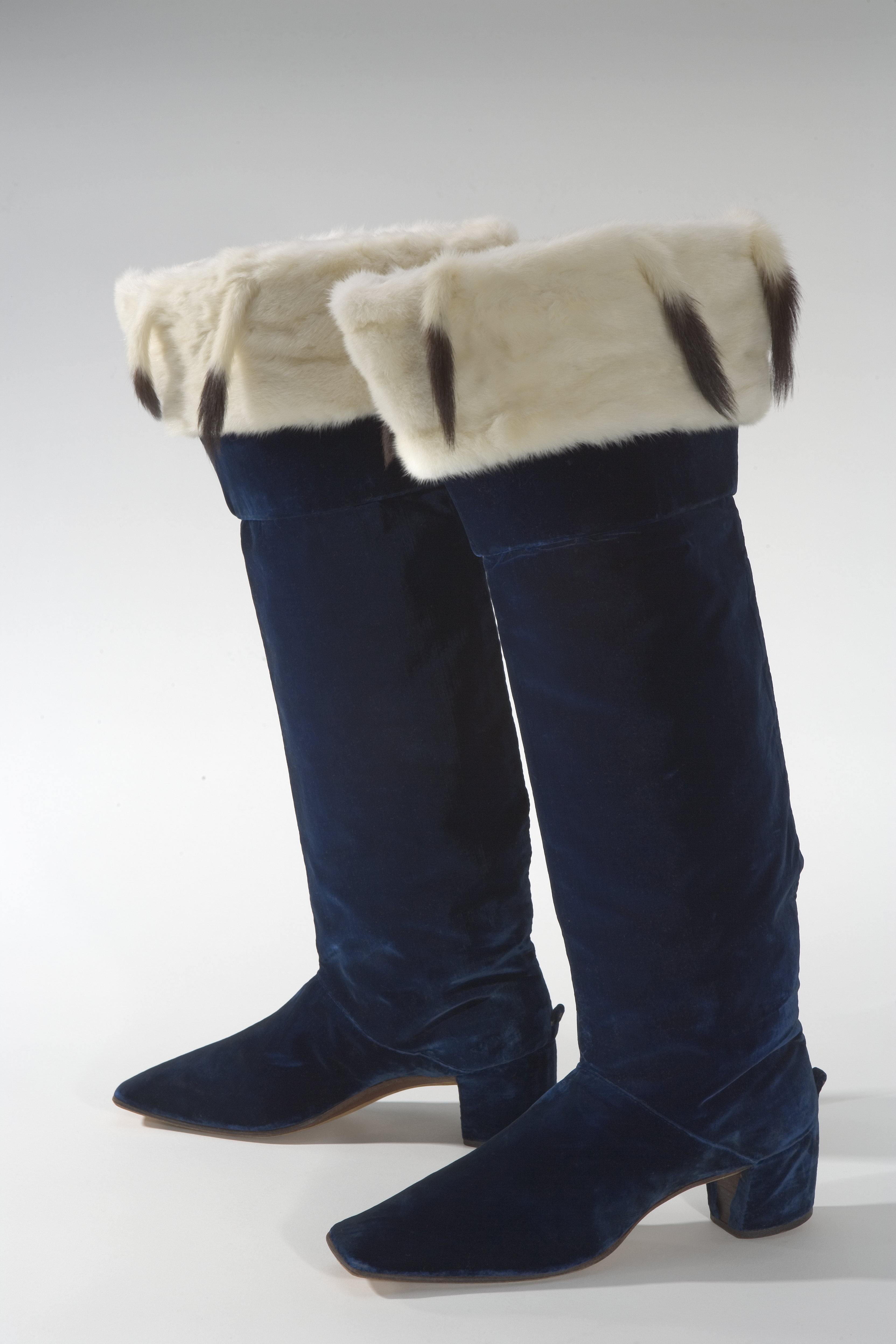 Stöveln av blå silkessammet är skuren med reseft, skaft med söm bak som upptill har utsvängd, styvad krage. Tåpartiet är tvärt avskuret. Kragen fodrad med elfenbensfärgat siden har fått ett nytt hermelinsbräm (1986) Den insydda, höga klacken är klädd med blå sammet. I sömmen bak ovanför klacken är en liten sammetstamp fastsydd för stroppen. Stöveln är fodrad med ljusbrunt kalvskinn.