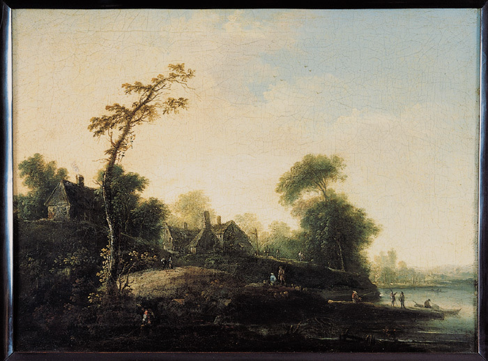 Lantgård vid sjö. Sign: Göets 1767. På duk, spänd på kilram av furu.