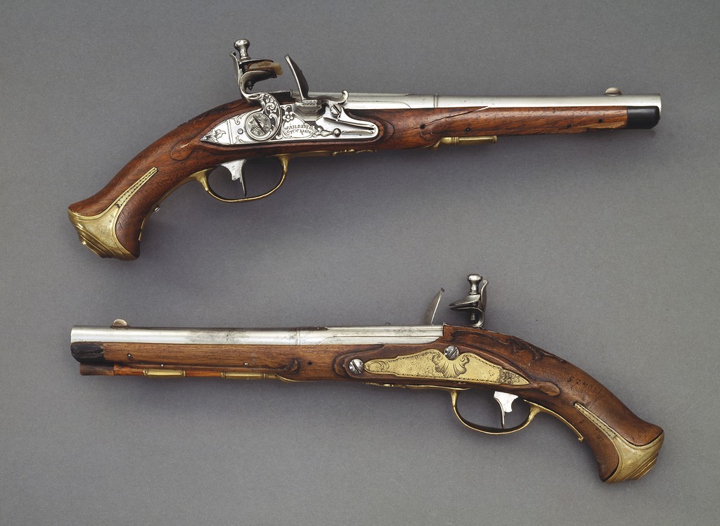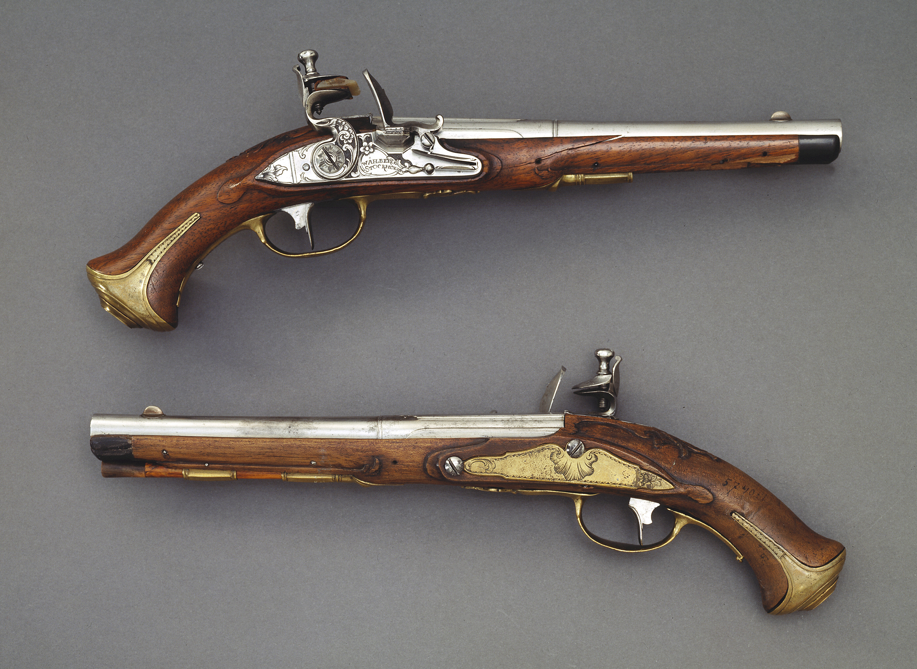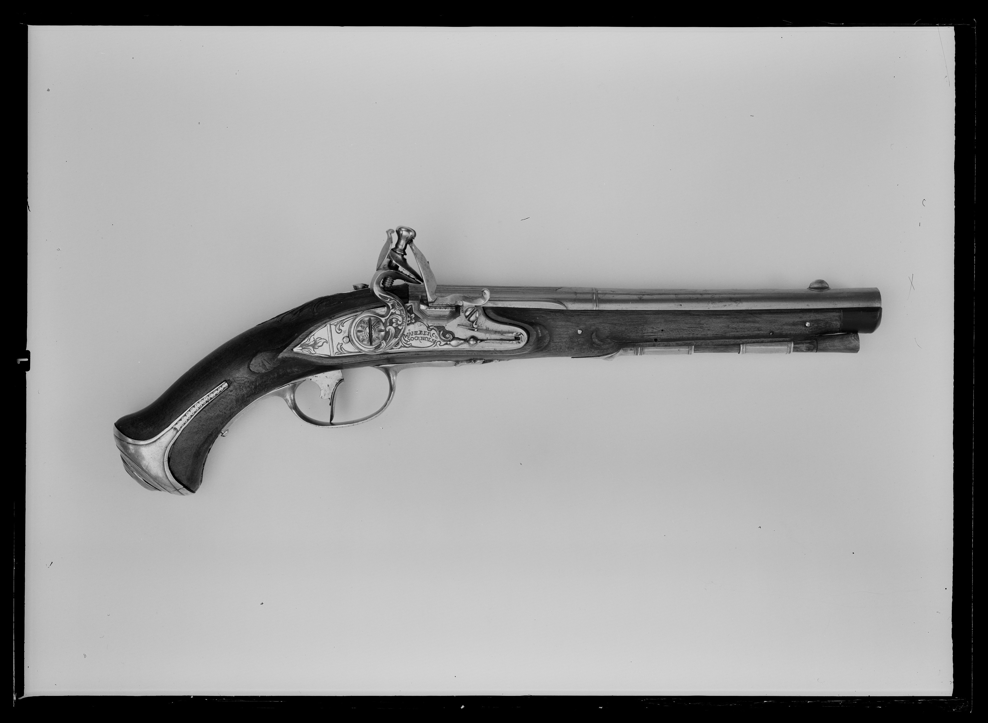 Pistol använd av J. J. Anckarström vid attentatet på Gustav III 1792. Rund, slätborrad pipa med åttsidig kammare, de två sidofaserna på ovansidan profilerade, blad i stålsnitt på mittfasen, därframför ring. Kort, baktill bladformigt svansskruvblad. Riktmedel: Klack med siktskåra vid pipbasen, spolformigt korn av koppar(?). Fästning: Två häften, pipan fäst med krysskruv, bakre låsskruven samt två pipstift av stål. Flintlås med plant låsbleck, något fasade kanter, försänkt bakspets. Graverad rankdekor, i kartusch framför hanen signatur: "WÅHLBERG // STOCKHOLM". S-formig hane i utförande som låsbleckets, lös överkäke, käkskruv med päronformigt huvud. Fasetterad fängpanna, batteri med profilerad mittås, batterifjäder med delvis fasade kanter, litet droppformigt fjäderlöv. Fästning: Två låsskruvar. Avtryckare med rundad framsida. Avtryckarbleck av stål. Helstock av valnöt, grovt skurna detaljer, blad vis svansskruvplattan. Näsband av horn. Beslag av mässing. Oval, profilerad kolvkappa, något tillplattad från sidorna, flikar med enkel, graverad kantdekor. Sidbleck med liknande kantdekor, något försänkt bakspets, blad i båda ändar samt vid bakre låsskruven. En + en kantig rörka, slät, kort spets. Varbygel med svagt rombisk bygel med kantdekor, plana armar med fasade kanter, främre armen avslutad med treflikigt blad, bakre armen avbruten vid skruvhålet. Tillbehör: Laddstock av ljusare trä, l: 182 mm, framtill skodd med horn, l: 18 mm.