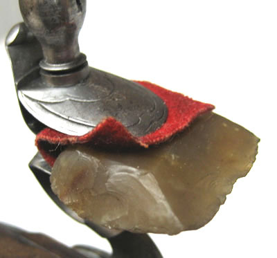 Grågul flinta, fyrsidig med sluttande kanter och rak slät spets något längre än sidorna och likaså sluttande. Enkel mantel av rött kläde.
