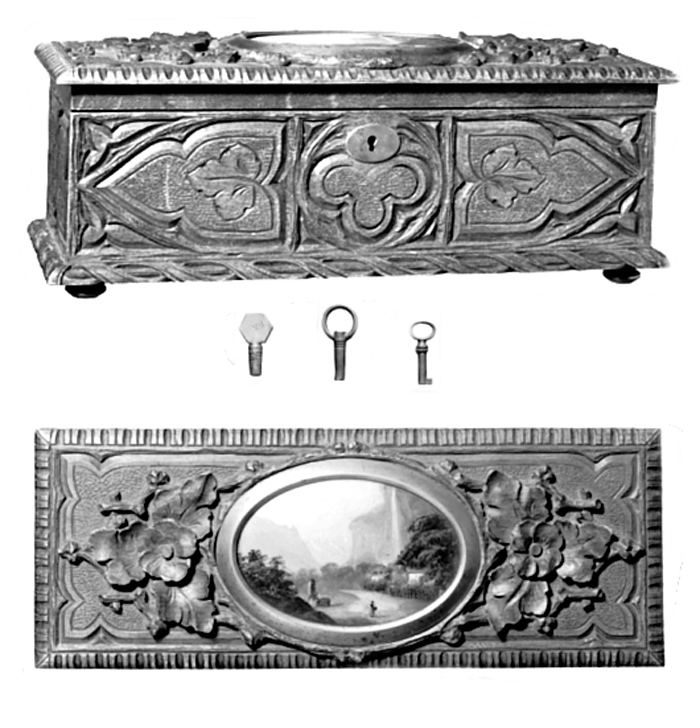 - Af al. Rektangulärt, med plant fällock samt på fyra fotter. Snidadt och bonadt. Å lockets öfversida i midten en liggande oval skifva, hvarå i olja en målning af ett tyrollandskap: I förgrunden grön mark med en ljust gråbrun väg, å denna en bortåt gående kvinna, iklädd svart lif och röd kjortel samt bärande en mörk korg på sin högra arm; till vänster en gråbrun vattenpost, hvarur vatten rinner ned i en framför befintlig bassäng, längst till vänster mörkbruna stenar och gröna buskar. Till höger i mellanplanet inom ett brunt staket två hvita hus, det hitre med röd öfverbyggnad, det bortre med gråbrun, båda omgifna af träd och grönt löfverk. I bakgrunden till vänster och höger alper, till vänster i blågrått, till höger i blågredelint, utför de sistnämnda ett vattenfall, i dalen mellan alperna grönt löfverk. Himlen till största delen täckt af blekt gulröda moln. Skifvan omsluten af en slät mässingsram med inåt-fallande dagerkant och utåtfallande öfversida. Vid hvardera ändan af målningen i hög relief en fyrbladig blomma, omgifven af tre treflikiga blad samt grenar med korsade ändar. Bottnen prickerad, med konturerad ytterkant, däromkring en utstående staflist med tvärgående kälar, omväxlande gröfre och finare. Skrinets sidor indelade i falt, tre å hvardera långsidan och ett å hvardera kortsidan. De å långsidorna: det mellersta med ett prickeradt fyrpass inom rund kvist-liknande ram med en inskjutande spetsig flik mellan passen, utanför ramen i hvarje svickel en kvaderliknande triangel; öfre passet å framsidan skymdt af en utanpåliggande oval nyckelskylt af mässing; sidofalten liggande aflånga, med spetsig ytterända och konturerad kant, i dem å framsidan ett utåtvändt blad med sirade konturer och nerver mot prickerad botten, de å baksidan endast prickerade. Mellan fälten samt längs kanterna en kvistliknande staf, den öfre och nedre af dessa förgrenade vid ändarna samt med inre förgreningarna gående utmed sidofältens spetsiga ändar; mellan förgreningarna vid ytterhörnen ett treflikigt ornament. Hvardera kortsidan med ett liggande aflångt fält med en spetsig intagning å hvarje kant, i fältet ett siradt snirkel-ornament mot prickerad botten, kring kanterna en staf som å framsidan. Kring bottnen en utstående bandstaf. Fotter af mässing, runda, starkt tryckta samt profilerade, rundt undersidan en pressad bladranka. Skrin och lock invändigt klädda med mörkröd sidenmoiré, i locket dessutom två hållare af brunt skinn för en handskpinare. Å framsidan ett infälldt lås af mässing med en i locket sittande låsögla, utgående från en lång skena, denna fäst med fyra blåanlöpta skrufvar af järn. Speldosan infälld från undersidan och fäst på en utanpå bottnen liggande träskifva med fasad kant samt fäst med fyra skrufvar; vid vänstra ändan ett mässingskodt hål för uppdragningstappen. Dosan spelande fyra stycken, som automatiskt skiftas genom rullens gång. Höjd: 11 cm.; längd: 29.5 cm.; bredd: 11.3 cm. Nycklar (original): Af järn. Skrinnyckeln med liggande oval ögla; upptill å pipan en profilerad utsvällning. Speldosnyckeln med rund ögla; upptill å röret tre smala kälar. Reservnyckeln (till speldosan; ej original) med handtag af mässing, gjord af bottenplattan till en elektrisk säkerhetspropp. Skrinnyckel, längd: 3 cm.; bredd: 1.3 cm. Speldosnyckel, längd: 3.5 cm.; bredd: 1.7 cm. Reservnyckel, längd: 2.9 cm.; bredd: 1.5 cm. Schweiziskt arbete från 1860-talets slut. Gåfva till Wilhelmina von Hallwyl, f. Kempe, Augusti eller September 1870 från hennes make, Walther von Hallwyl, f. 26 Januari 1839 i Bern, d. 27 Februari 1921 i Stockholm. Inköpt af den sistnämnde hos en handlande i Bern vid hans vistelse tillsammans med sin maka, Wilhelmina, f. Kempe, hos sina föräldrar, Theodor och Cecilie von Hallwyl, f. von Im Hoff, å Rörswyl vid Bern under deras resa till Tyskland och Schweiz Augusti och September 1870.
