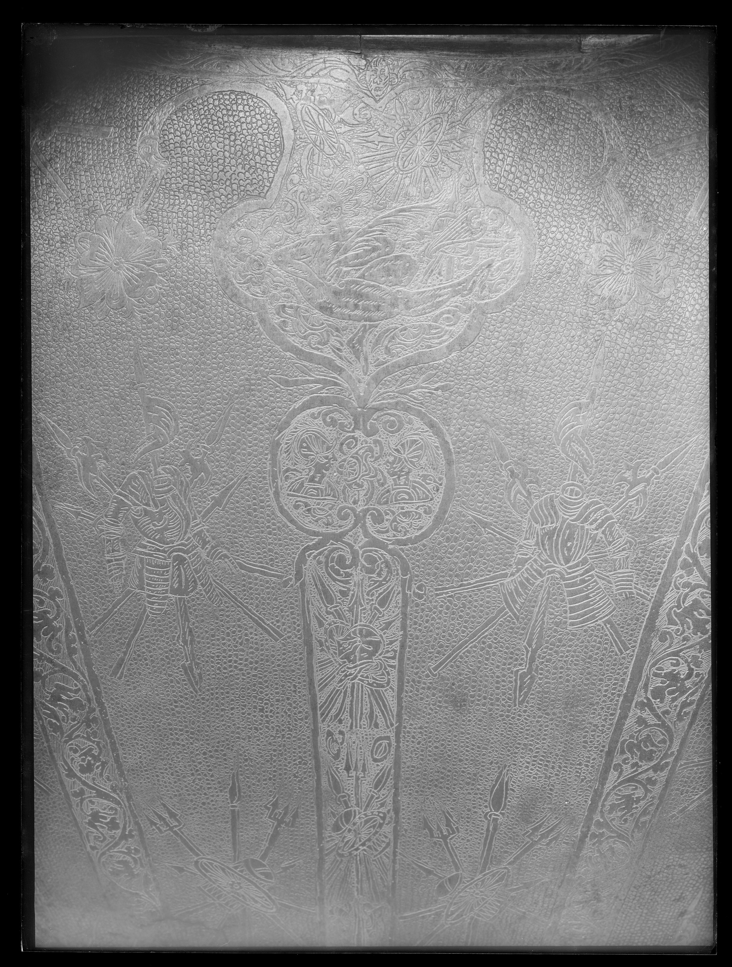 1 rund, kupig sköld med etsningar och förgyllningar, invändigt fodrad med rödt sammet och kantad med guld i silkesfransar - messingsnitar invändigt i form af rosetter, på skölden finnes årtalet 1548, sköldpiken kort, konformig.