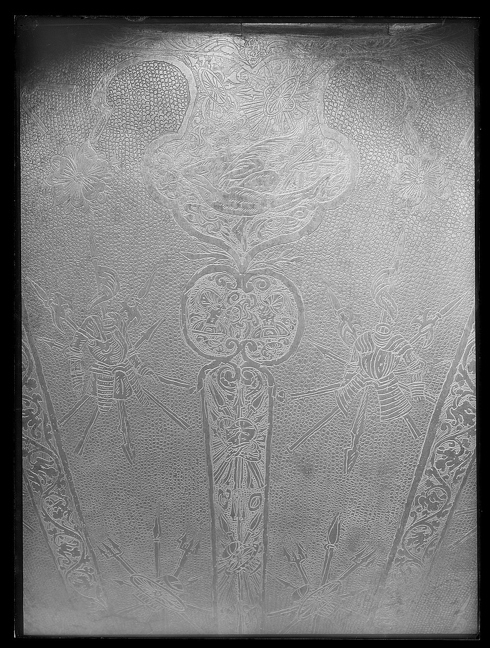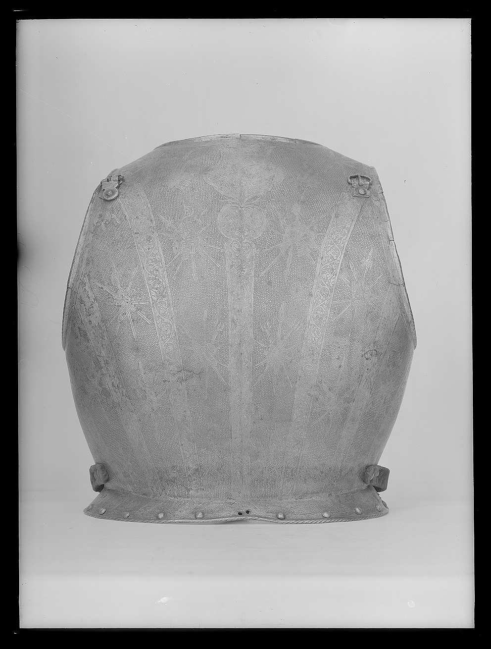 - Konung Erik XIV rustning af jern, etsad i ornementer och förgylld, består af: