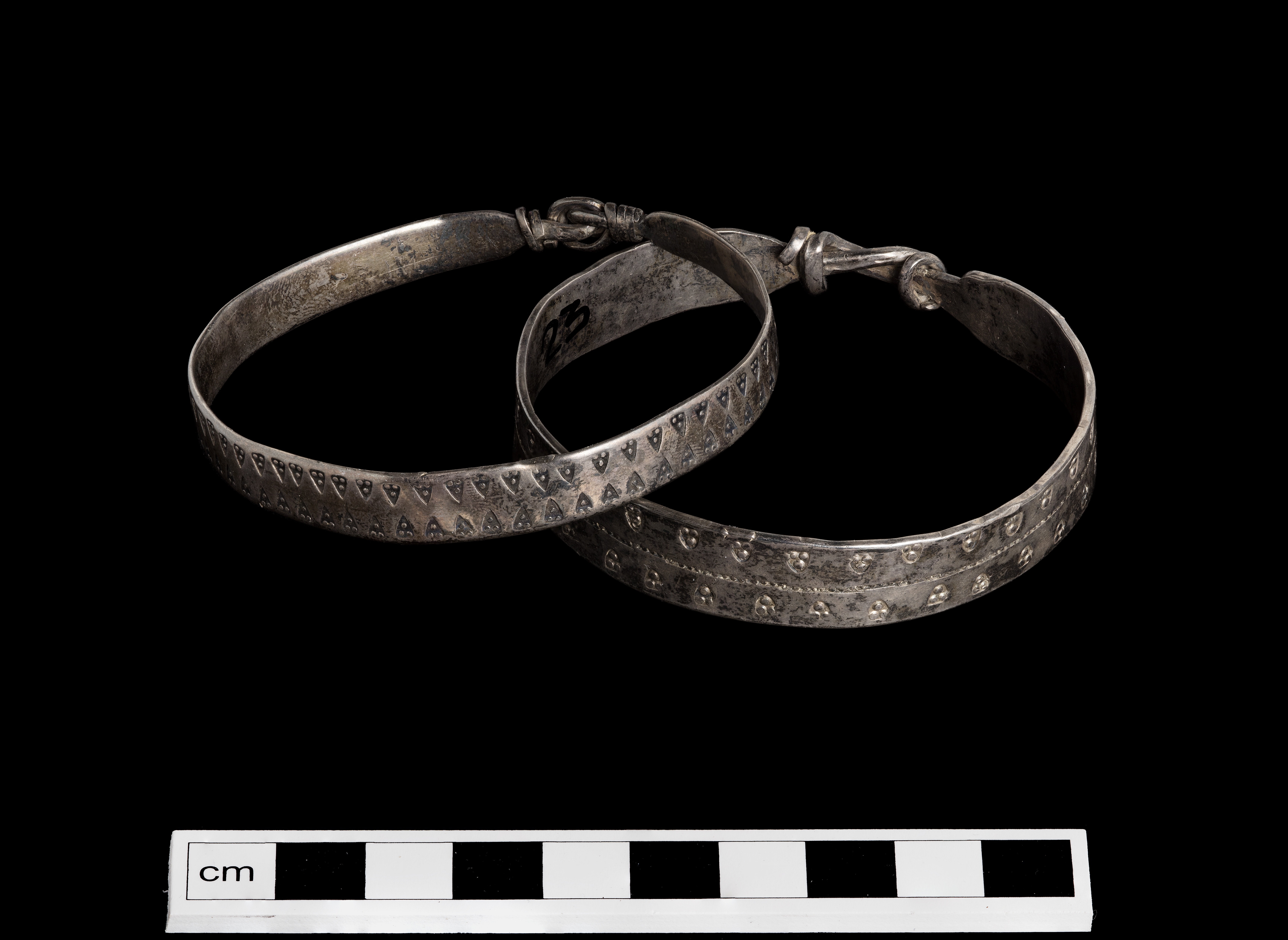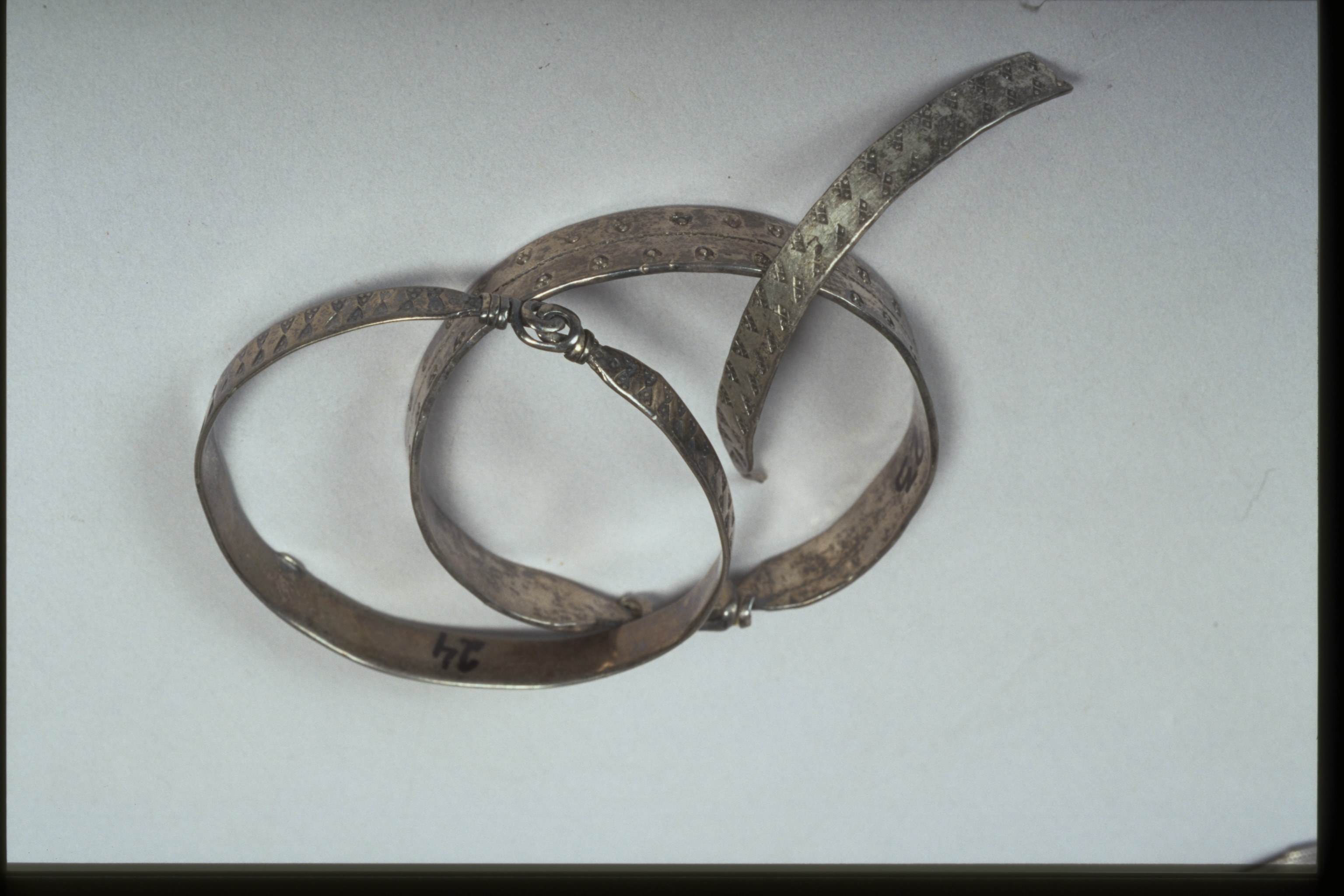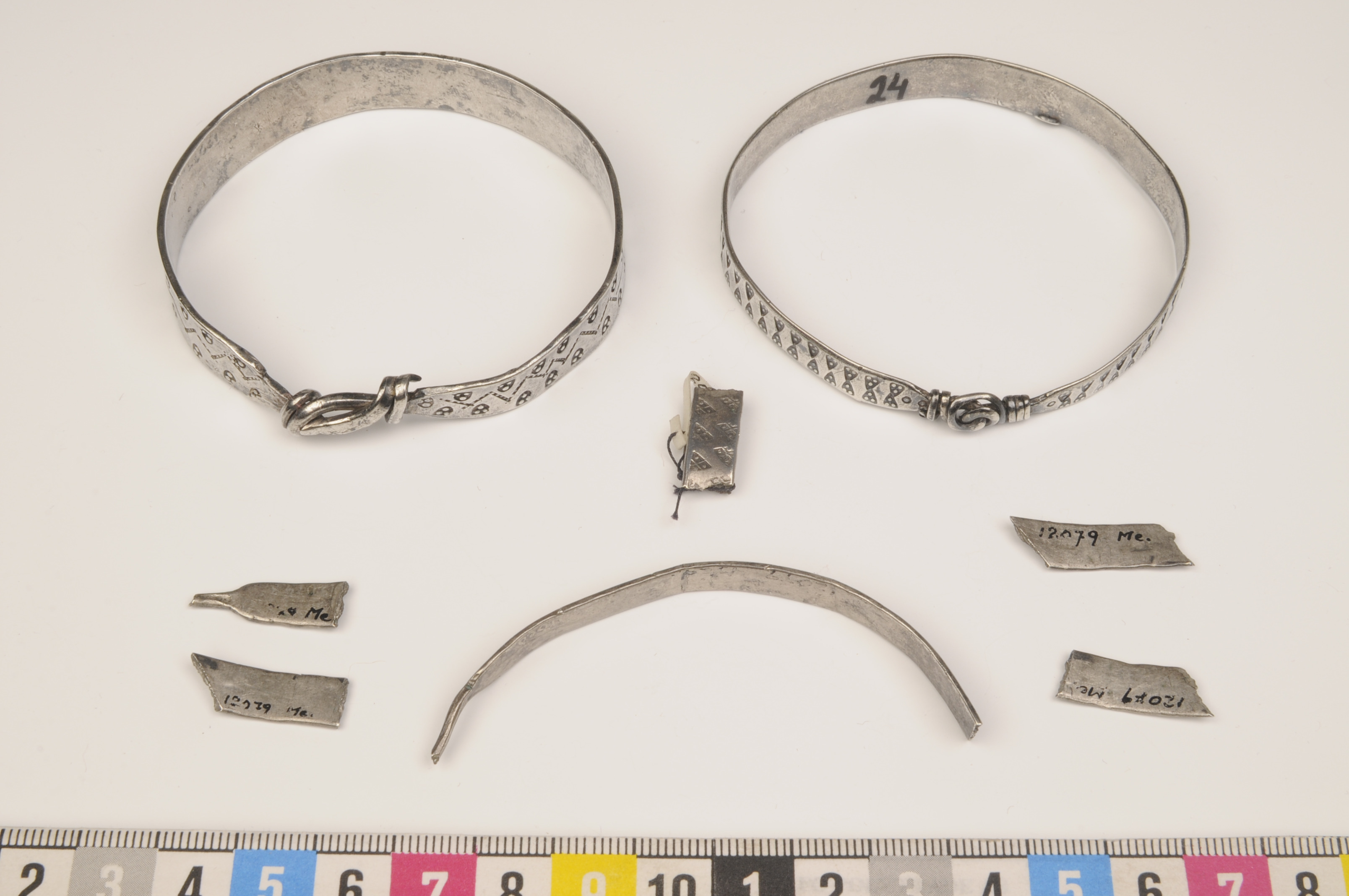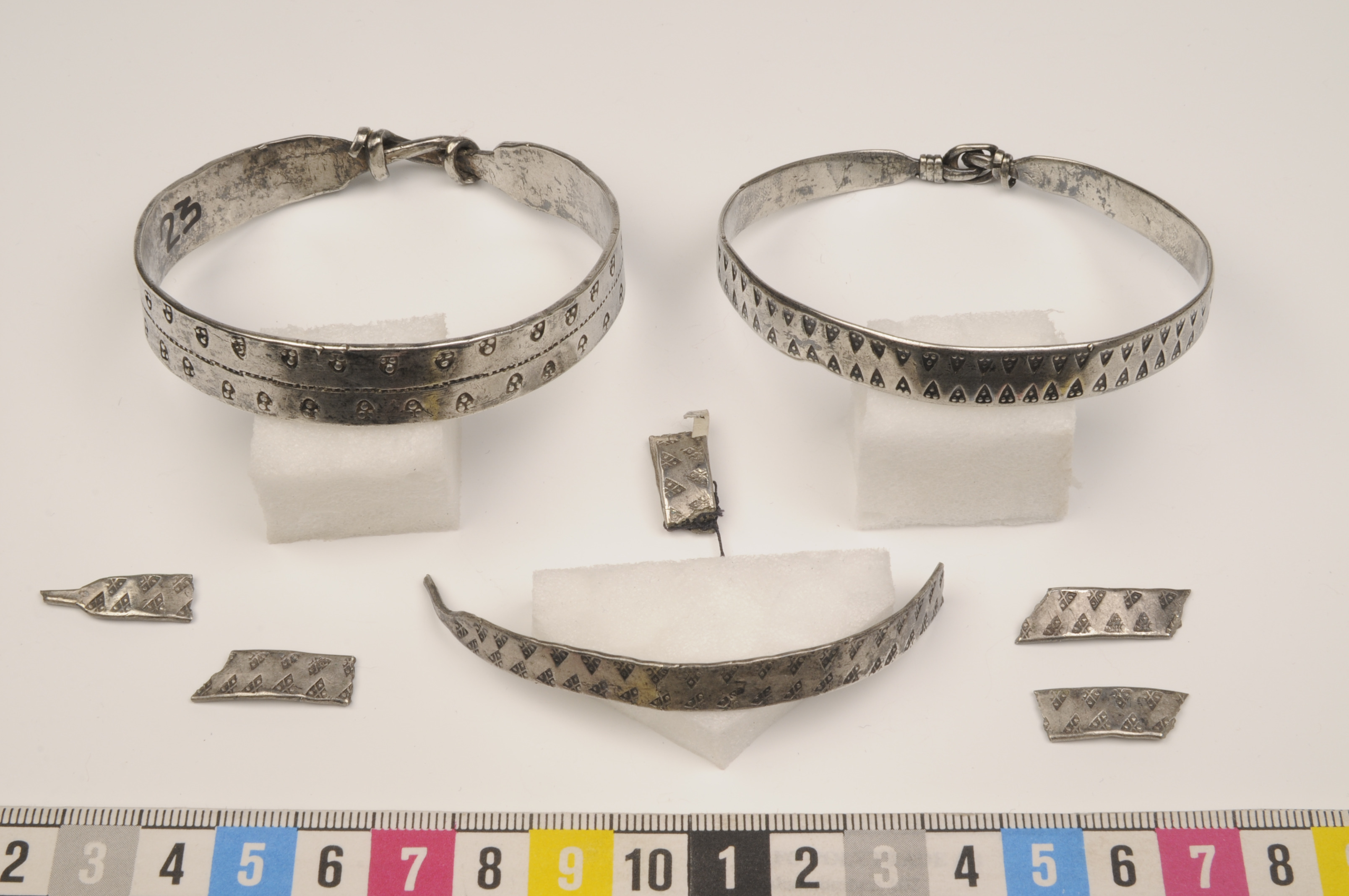 Två hela och sex bitar av bandformiga punsornerade armringar
